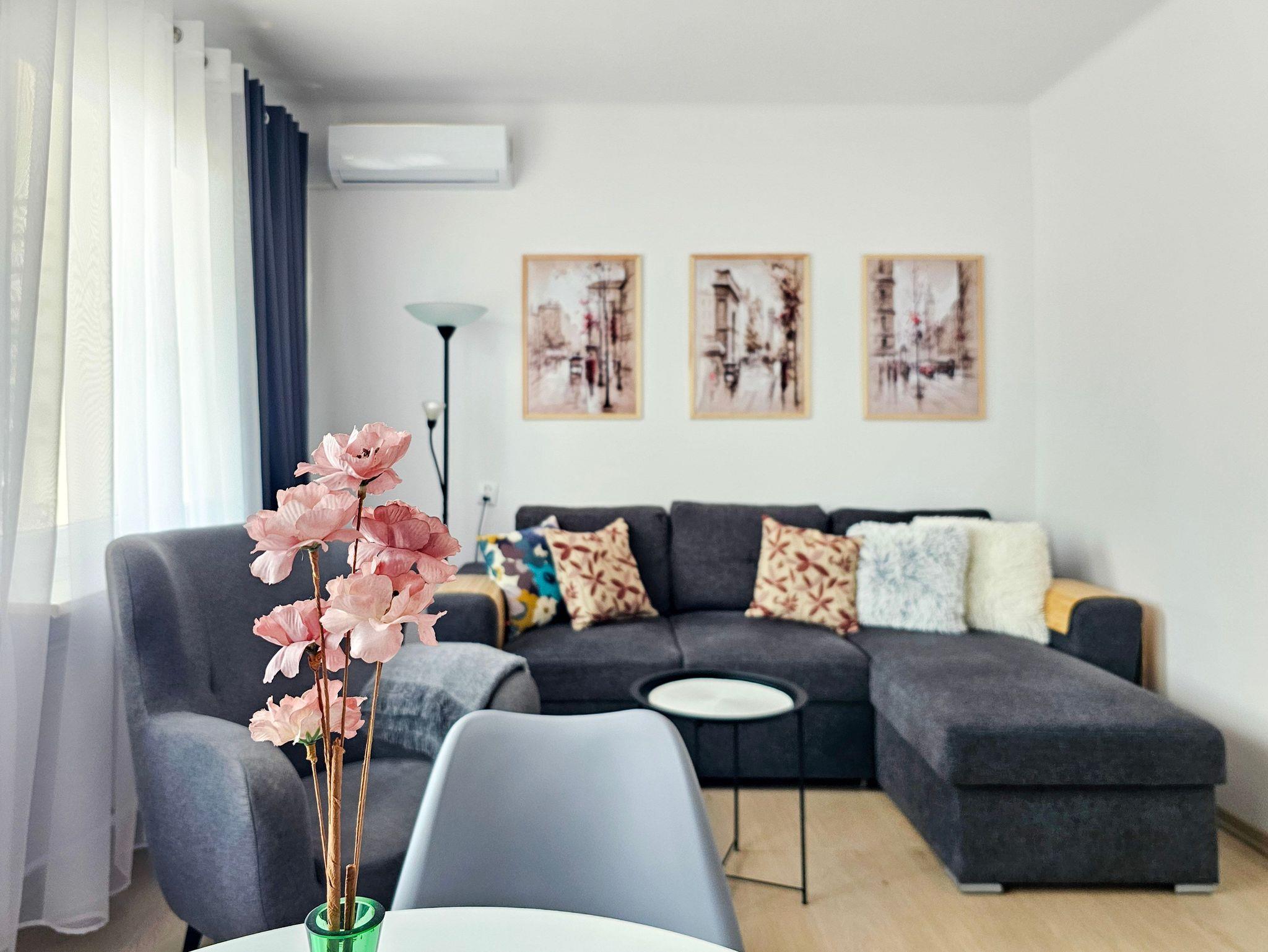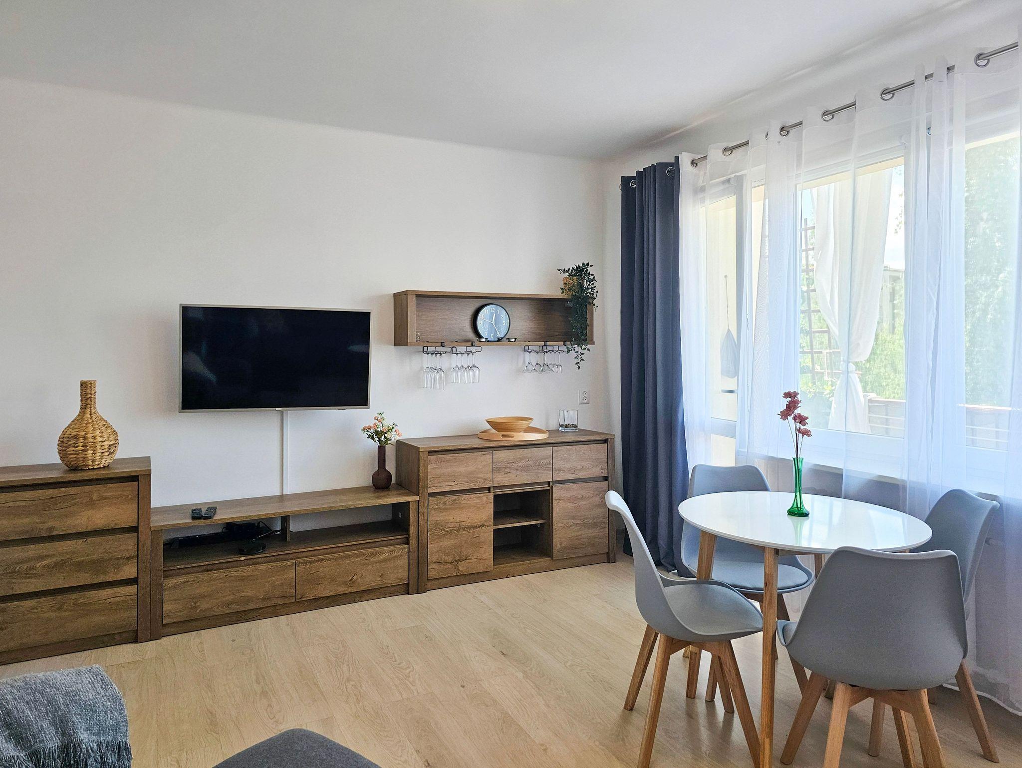 Geräumiges, sehr sonniges Wohnzimmer mit einem bequemen ausklappbaren Sofa mit Schlaffunktion (140x200cm), einer TV-Ecke, einem runden Esstisch und einem Ausgang zum Balkon.
