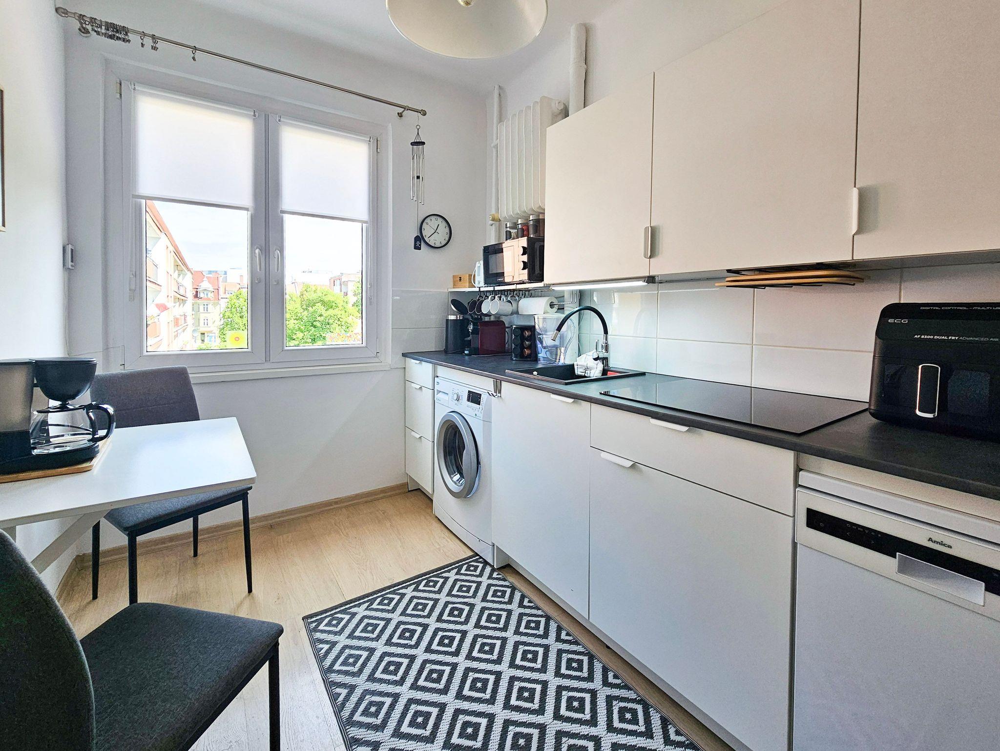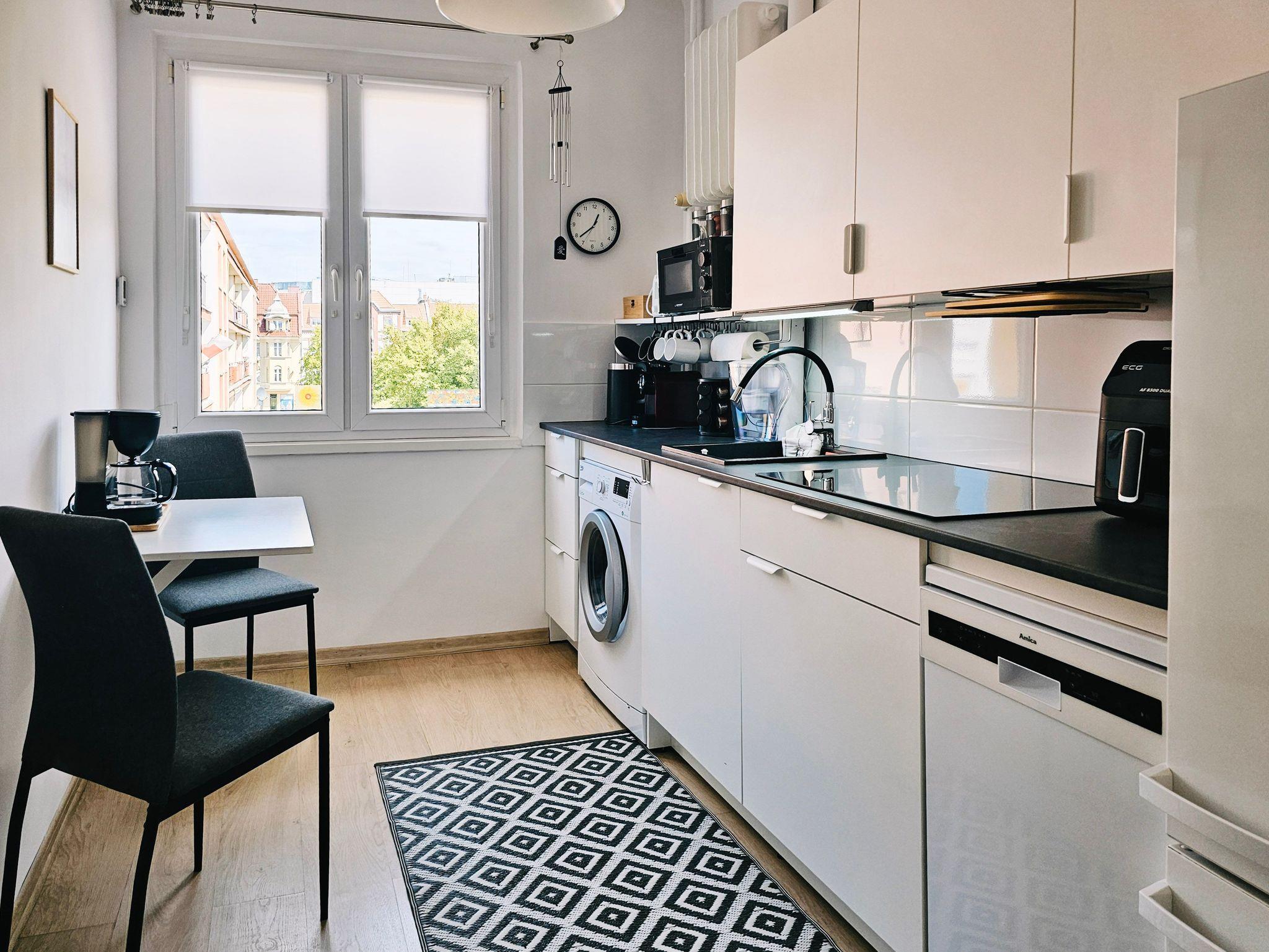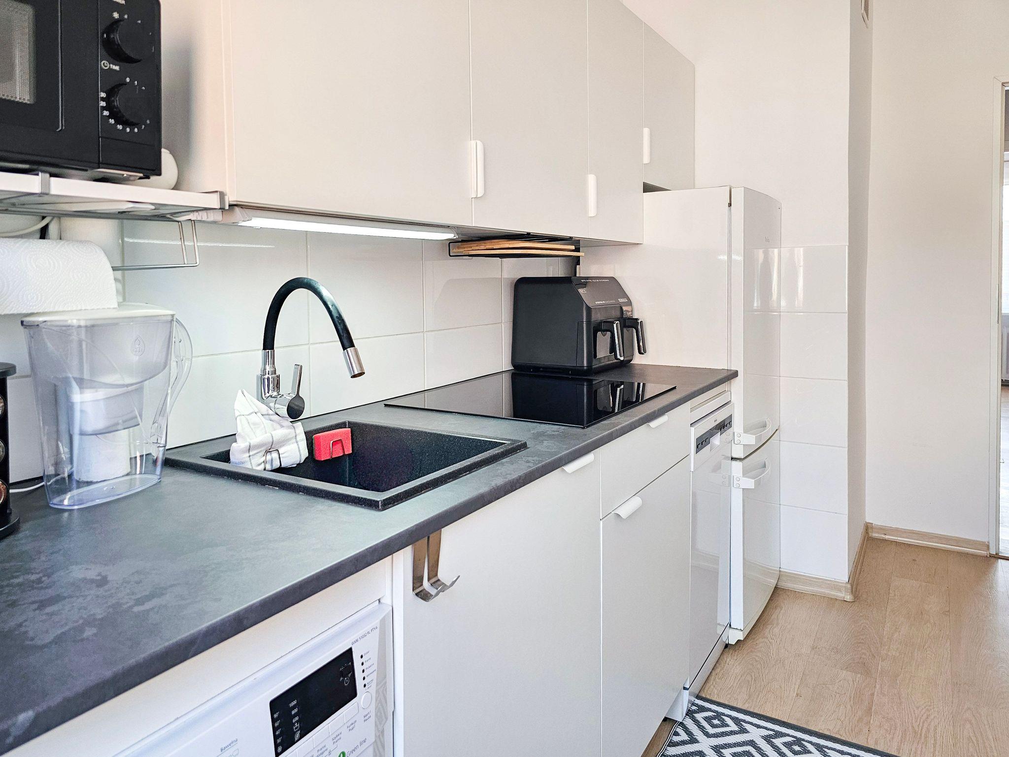 Voll ausgestattete Küche, Kühlschrank mit Gefrierfach, Geschirrspüler, Tchibo-Kapselkaffeemaschine, Airfrayer als Backofen, 1-Becken-Spüle, Waschmaschine.