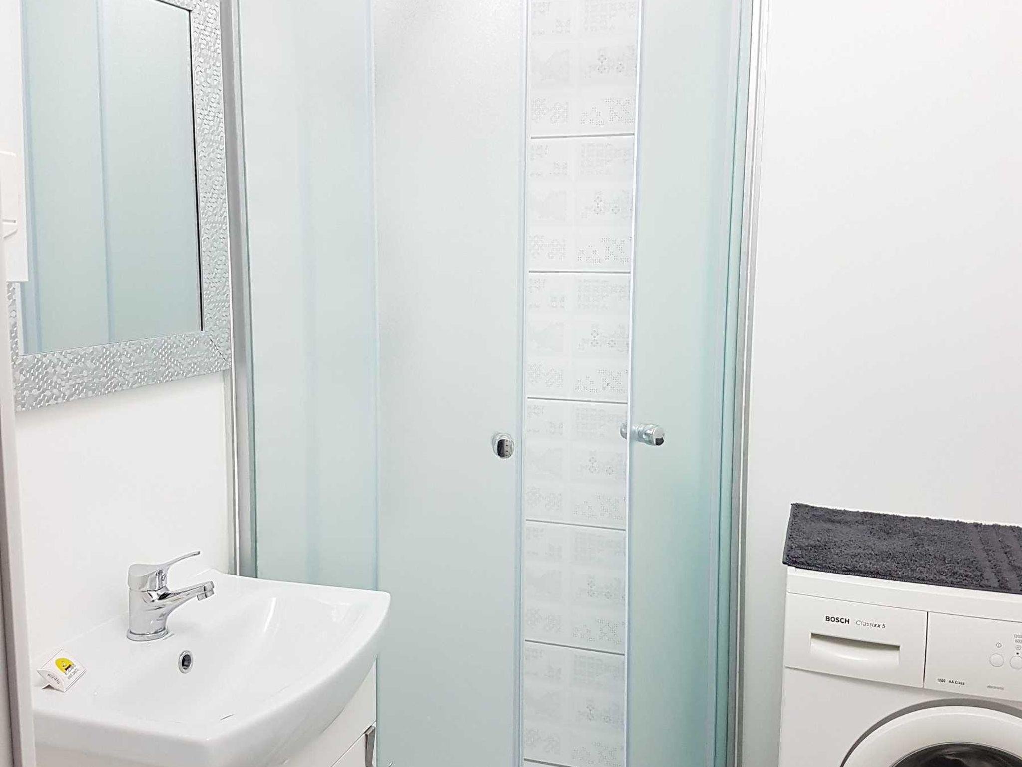 Das Badezimmer verfügt über eine Duschkabine, ein Waschbecken, ein WC sowie einen Gasdurchlauferhitzer zur Warmwasserbereitung.