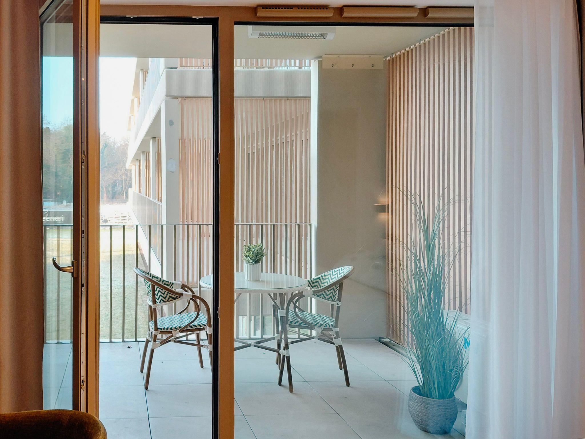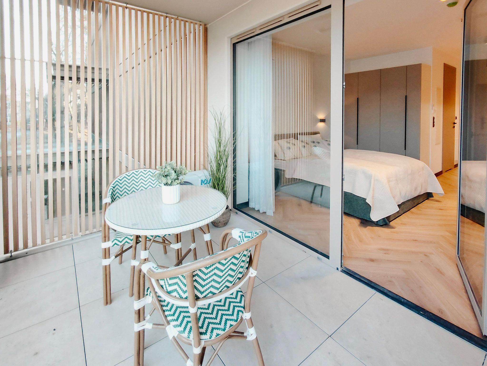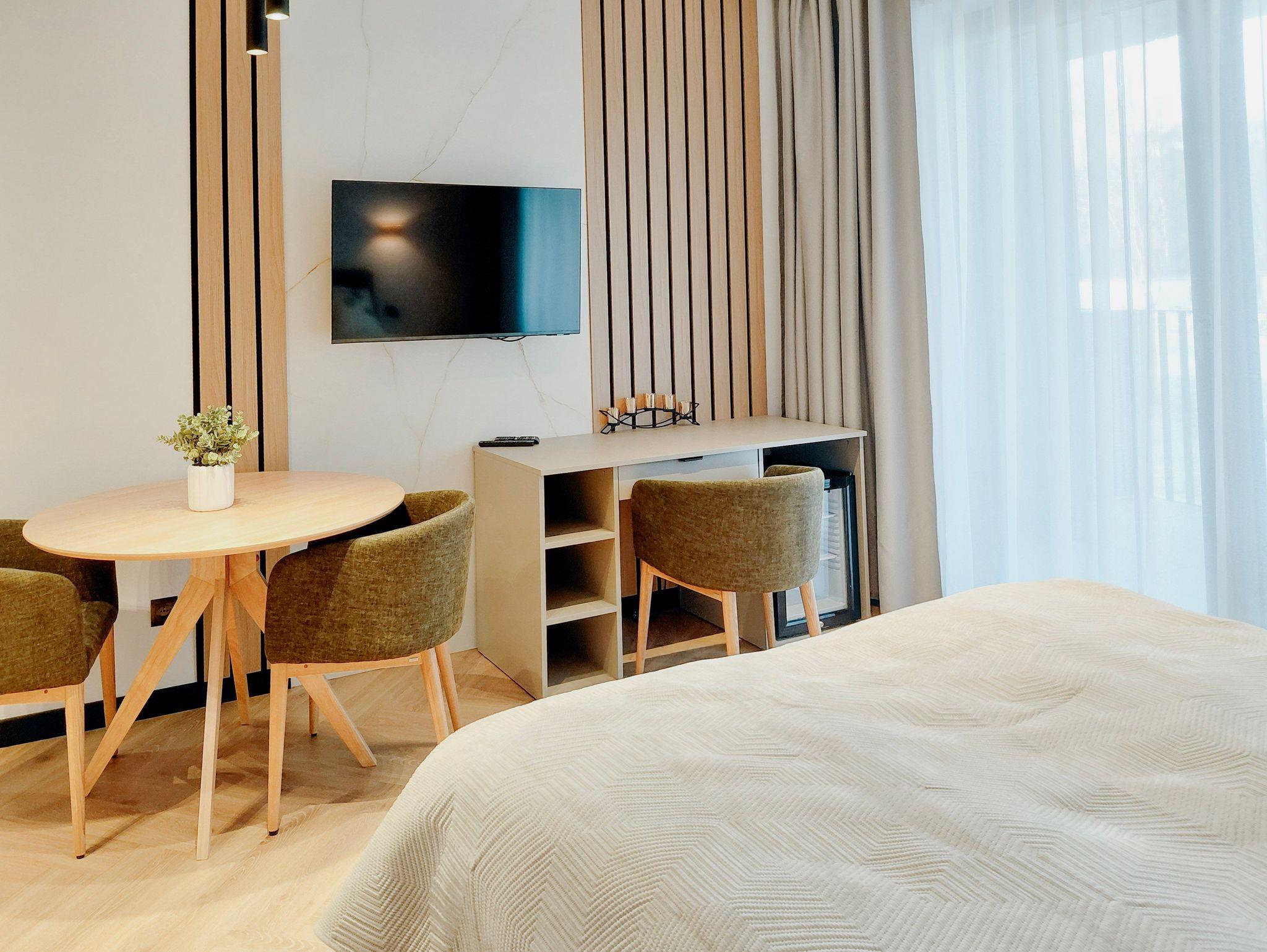 Das Zimmer verfügt über ein Doppelbett (160 x 200 cm), einen runden Tisch, bequeme Stühle, einen Schreibtisch/Frisiertisch, einen Smart-TV und Kabelfernsehen. Der Balkon auf der Westseite ist mit einem Tisch und zwei Stühlen ausgestattet.