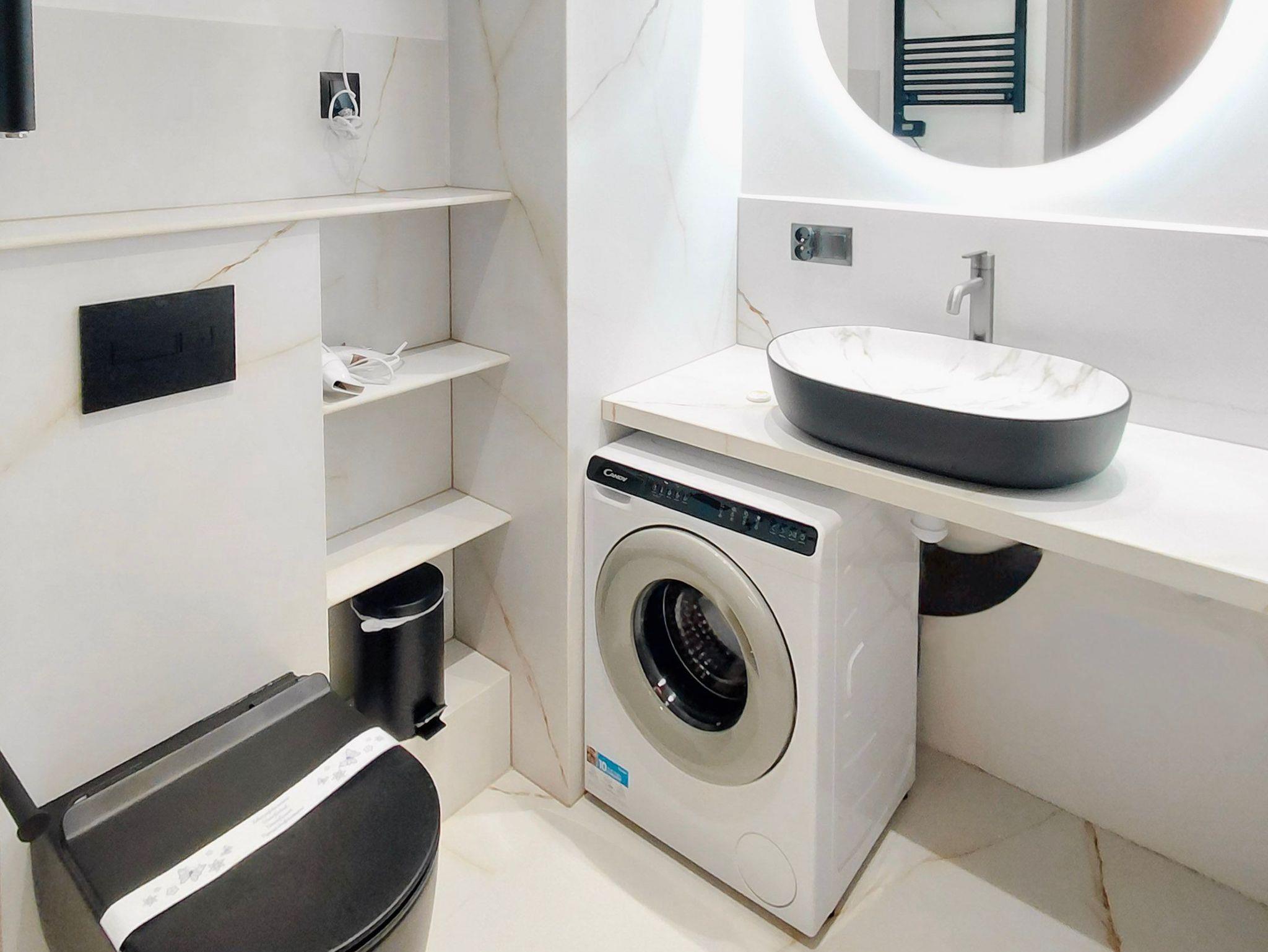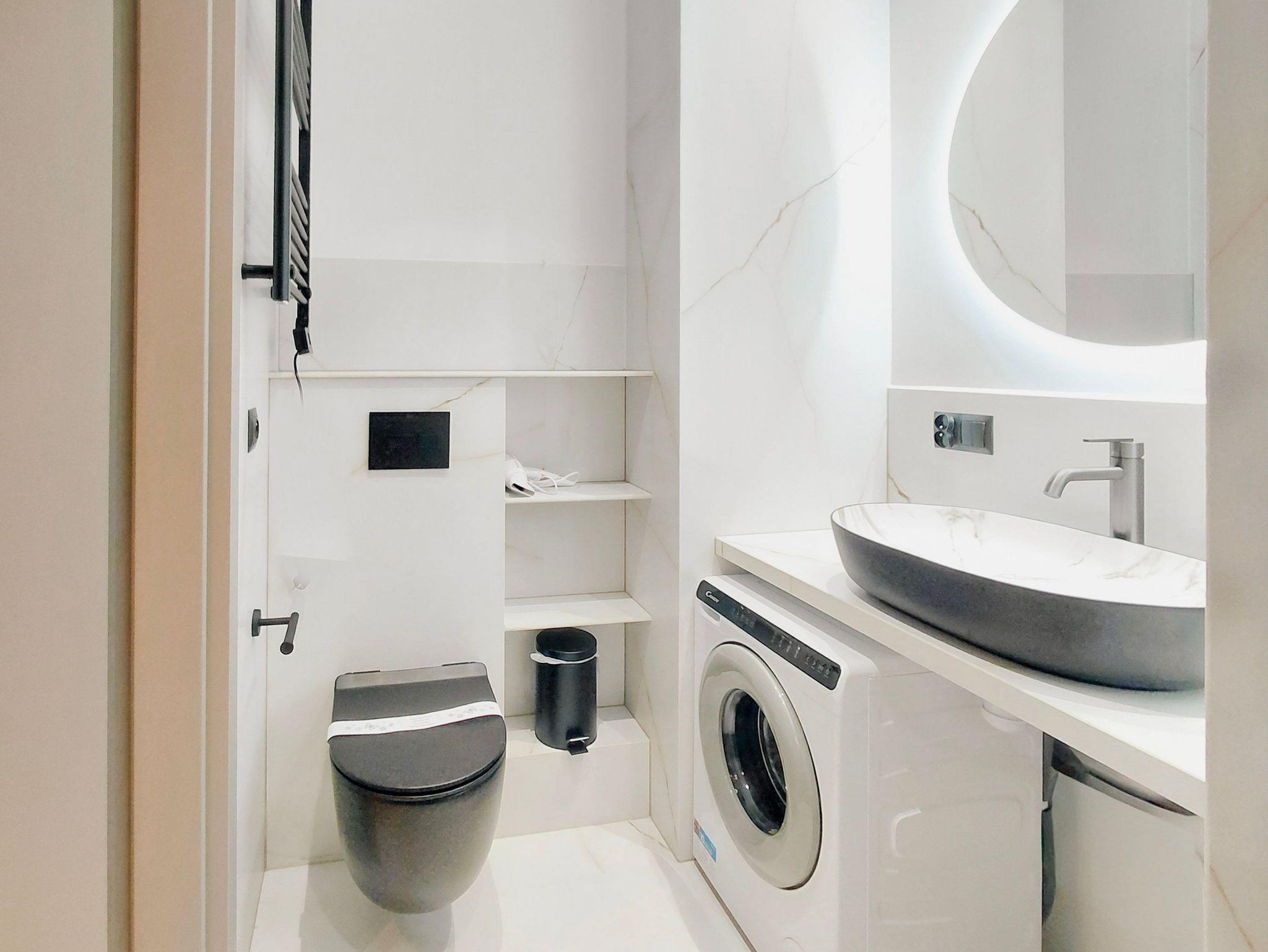 Das Badezimmer verfügt über eine barrierefreie Duschkabine, ein Waschbecken, eine Toilette und eine Waschmaschine.