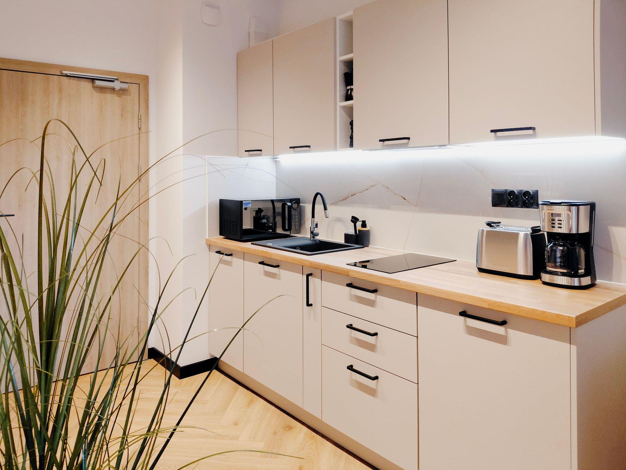 In der Küchenzeile befinden sich Geräte zum Zubereiten und Verzehren von Mahlzeiten sowie eine Spülmaschine, ein Unterbaukühlschrank, ein Wasserkocher, eine Filterkaffeemaschine und ein Toaster, ein 2-Flammen-Elektroherd und eine Mikrowelle mit Grillfunktion.