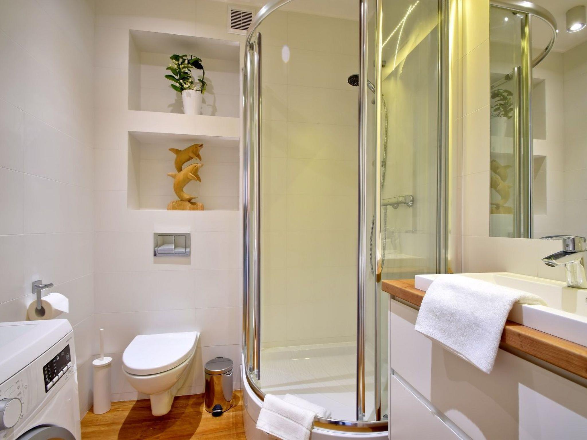 Es ist eine Wohnung mit sehr geräumigen Schlafzimmer, Wohnzimmer mit gut ausgestatteten Küchenzeile, Essbereich und modernen Badezimmer mit Gesamtfläche von 29 m2. Für einen ruhigen Schlaf sorgen ein sehr bequemes Doppelbett im Schlafzimmer und ein Sofa mit Schlaffunktion und italienischem Klapprahmen.Es ist eine sehr funktionale, komfortable und helle Wohnung. Es dominieren Weiß-, Grau- und helle Holztöne, die den Raum erwärmen und ihm einen gemütlicheren Charakter verleihen. Auch das Interieur zeichnet sich durch Harmonie, Schlichtheit, Mäßigung sowie klassische Proportionen aus, die ein zeitloses Dekor schaffen. Perfekt für Menschen, die Tradition und Einfachheit mit einem Hauch von Strenge schätzen, wie an Bord eines Schiffes, das zu einer ersehnten Reise aufbricht.