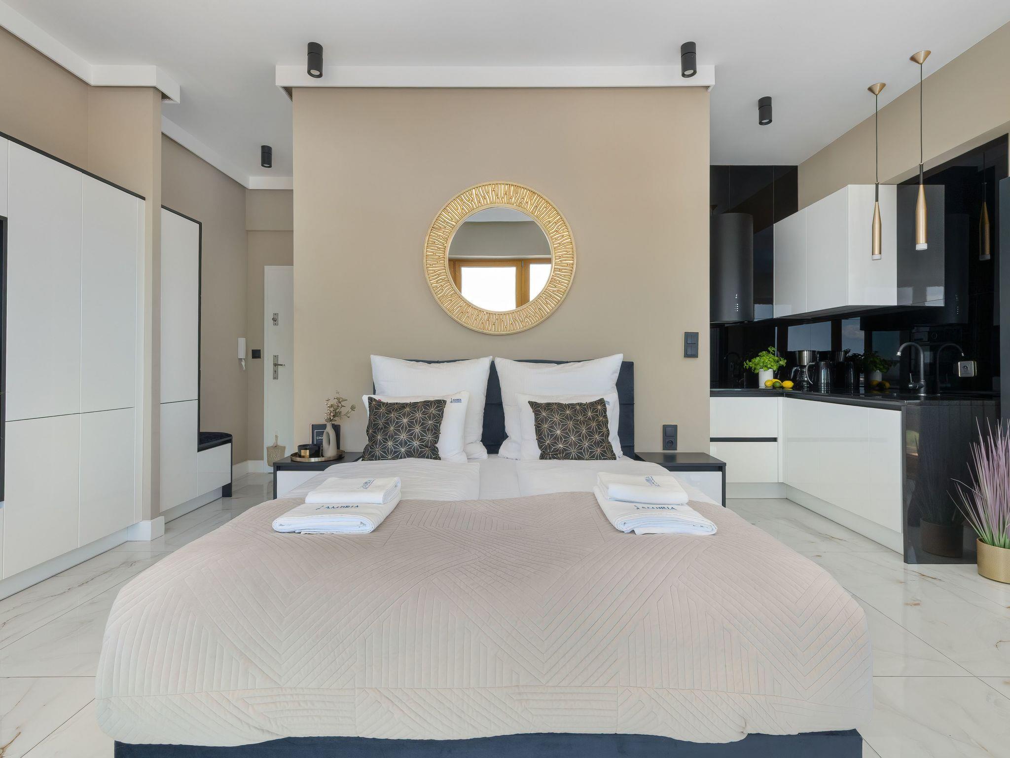 Dieses stilvolle Studio-Apartment erstreckt sich auf 31 m² und präsentiert sich in einem Design, inspiriert von der Leichtigkeit des Strandes, mit harmonischen Farben in Weiß, Beige und Gold, abgerundet durch elegante schwarze Akzente. Es bietet einen Wohn- und Schlafbereich mit einem großen Doppelbett und einem Schlafsofa, eine voll ausgestattete Küchenzeile für kulinarische Experimente und ein elegantes Badezimmer, das keine Wünsche offenlässt. Ideal geeignet für romantische Getaways oder einen entspannten Kurztrip an die Ostsee.