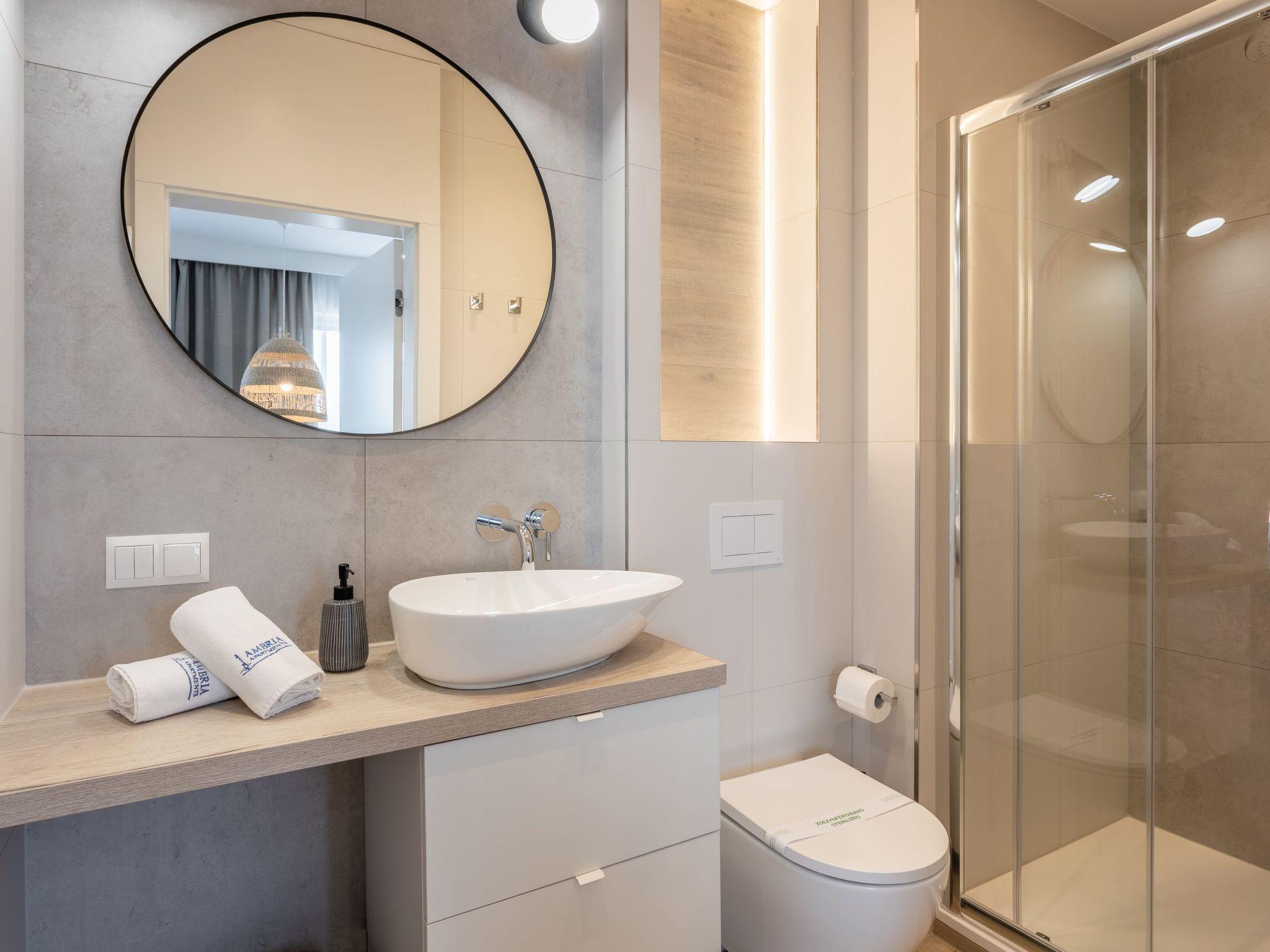 Das Apartment besteht aus Wohnbereich mit Küchenzeile, Schlafzimmer und sehr geräumigen Badezimmer - seine Gesamtfläche beträgt 34 ??m2. Sein zusätzlicher Vorteil ist der Balkon, der sehr praktische Erweiterung der Wohnung darstellt, von dem aus Sie das Meer sehen können. Das Interieur ist sehr ästhetisch und auf hohem Niveau eingerichtet, was sich in schönen modernen Möbeln sowie auffälligen Accessoires widerspiegelt, die sich durch ihre Textur und originelle Herstellungsweise auszeichnen. Es dominieren Weiß- und Grautöne, gebrochen mit einem tiefen Blauton, sowie Holzelemente, die das Arrangement natürlich ergänzen und perfekt zum Charakter des Gebäudes passen. Zahlreiche Verglasungen vergrößern optisch den Raum und machen die Wohnung äußerst hell und funktional. All dies gewährleistet den Komfort der Erholung und ermöglicht es Ihnen, sich nach den alltäglichen Herausforderungen zu regenerieren und garantiert Ruhe in der intimen Privatsphäre eines schönen Interieurs.Im Preis der Wohnung ist ein eigener Parkplatz enthalten, der zur Wohnung gehört, was den Reisekomfort erheblich erhöht und besonders für Familien mit Kindern wünschenswert sein kann.