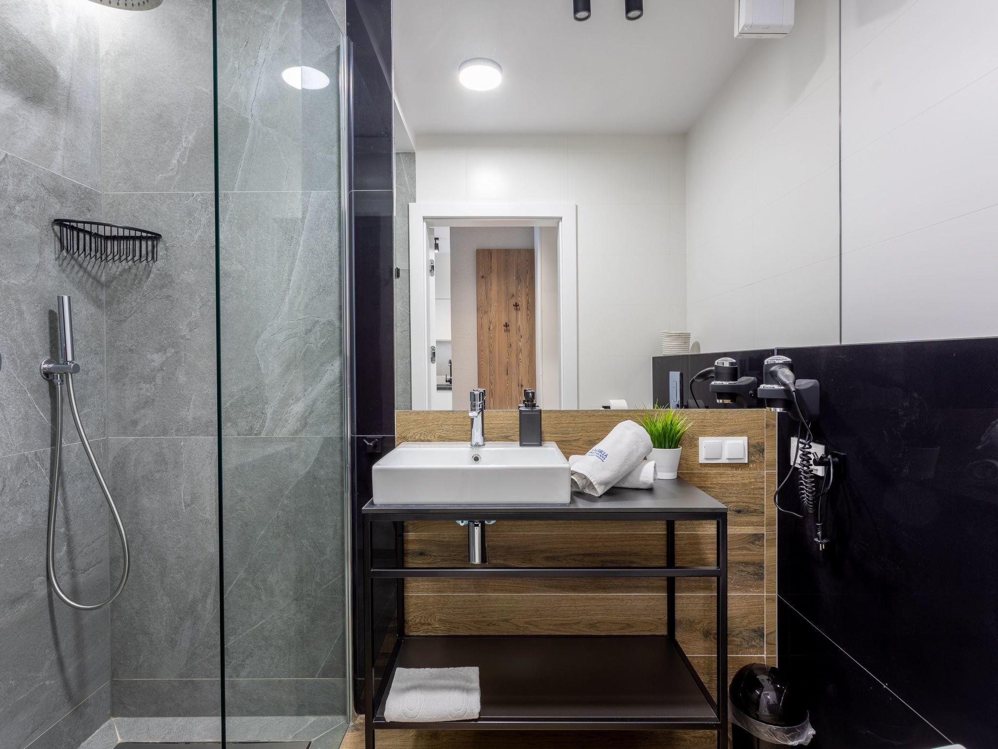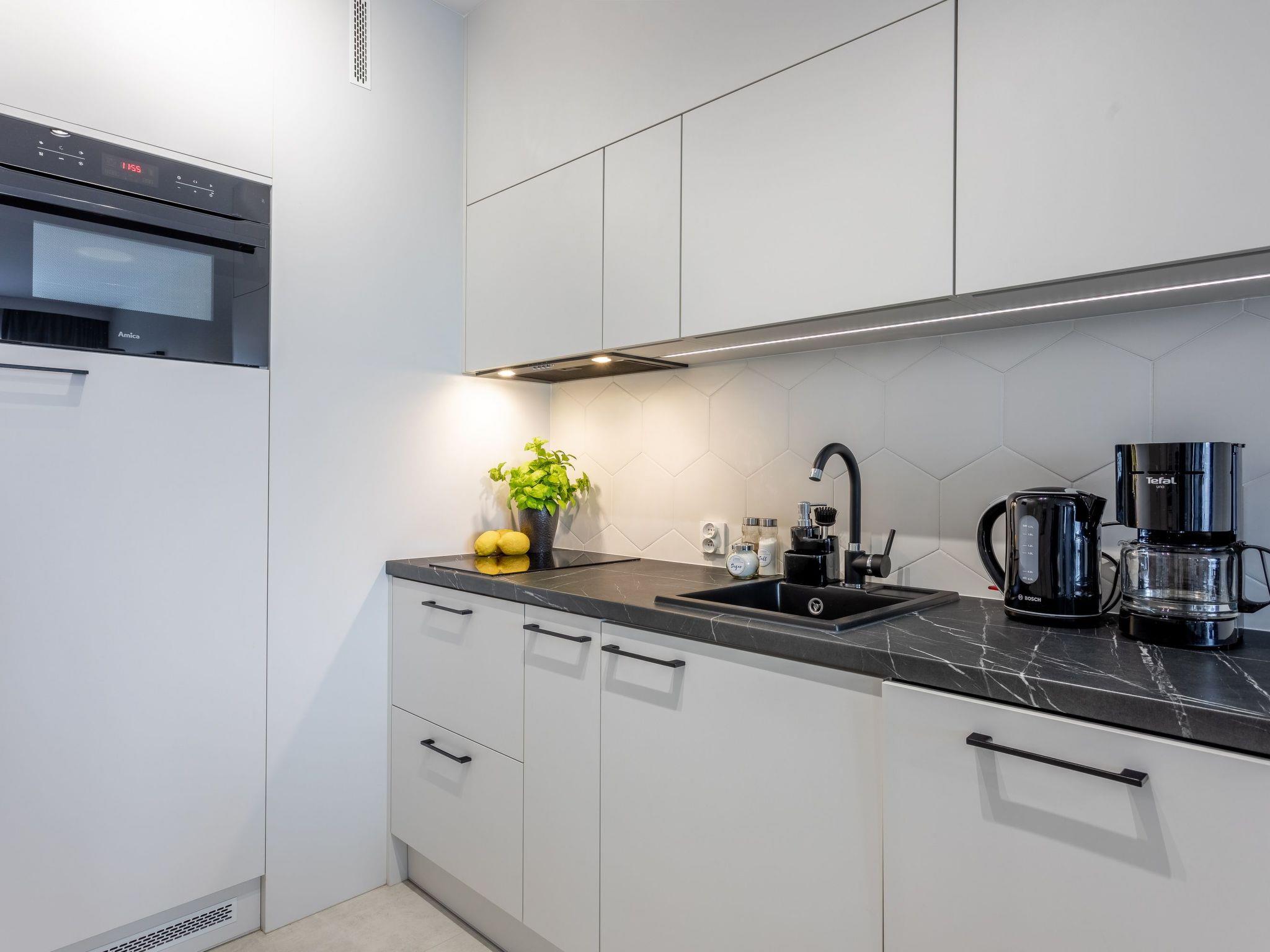 Es ist Apartment mit Schlafzimmer, Wohnzimmer mit gut ausgestatteten Küchenzeile, Essbereich und modernen Badezimmer mit Gesamtfläche von 35 m2. Die nutzbare Fläche wird durch den Balkon erweitert, wo Sie angenehme Momente bei einer Tasse frisch gebrühtem Kaffee oder einem Glas Ihres Lieblingsweins verbringen können. Sehr bequemes Doppelbett im Schlafzimmer und Sofa mit Schlaffunktion im Wohnbereich sorgen für erholsamen Schlaf. Eine komfortable Ausstattung garantiert einen angenehmen Aufenthalt, sowohl für private als auch für geschäftliche Zwecke. Es ist ein sehr modernes Interieur, das auf den Komfort der Bewohner ausgelegt ist, bei dem Funktionalität eine außerordentliche Rolle spielt, aber auch ein kühles, vom Himmel gebrochenes Grau, das nicht nur die einzigartige maritime Atmosphäre unterstreicht, sondern auch indirekt darauf verweist minimalistischen Stil, der eine angenehme Erholung nach einem ganzen Tag in der Sonne bietet. Den Gästen steht - gegen Gebühr - auch ein privater Außenparkplatz zur Verfügung, was den Reisekomfort erheblich erhöht und besonders für Familien mit Kindern wünschenswert sein kann.