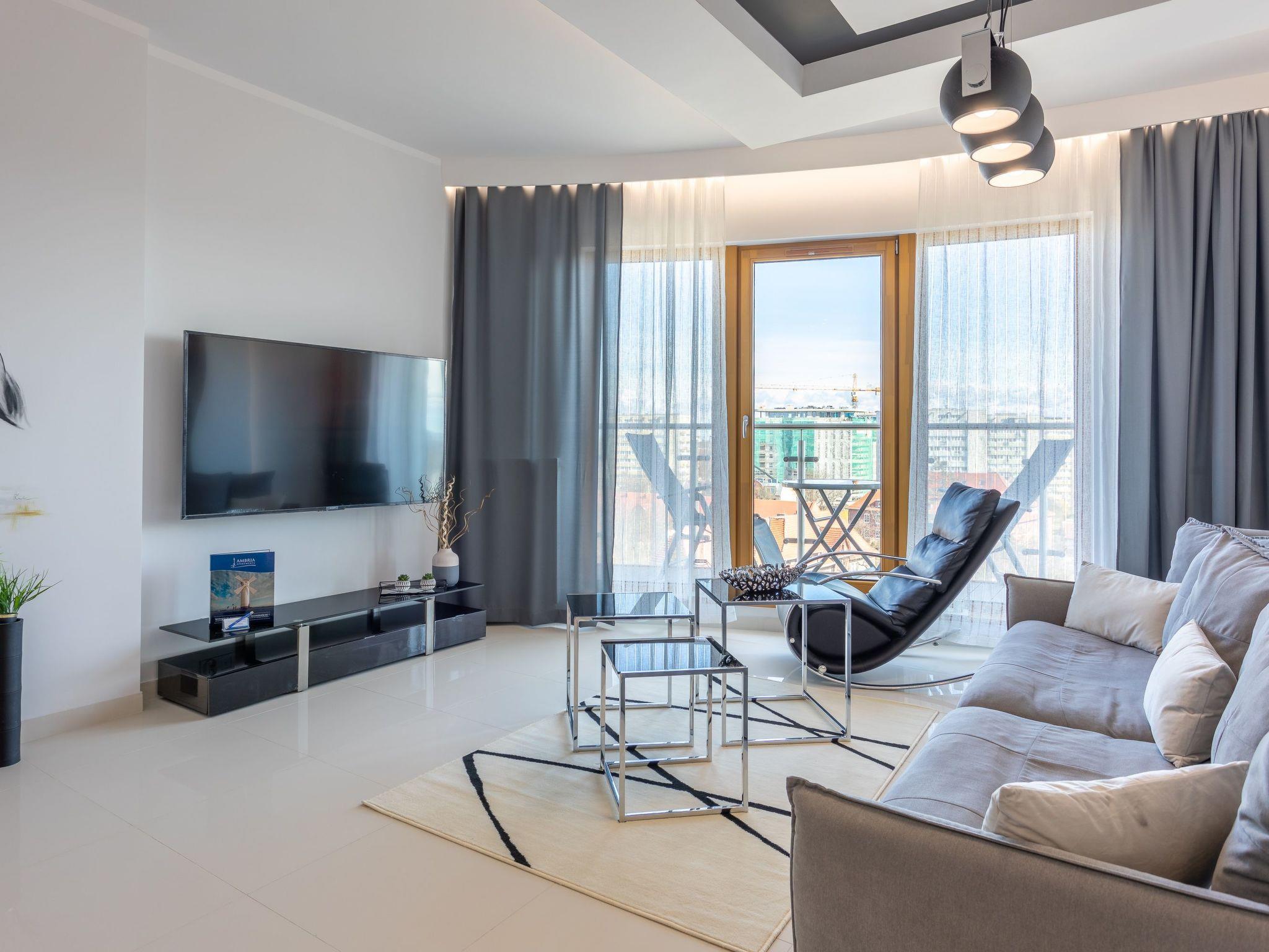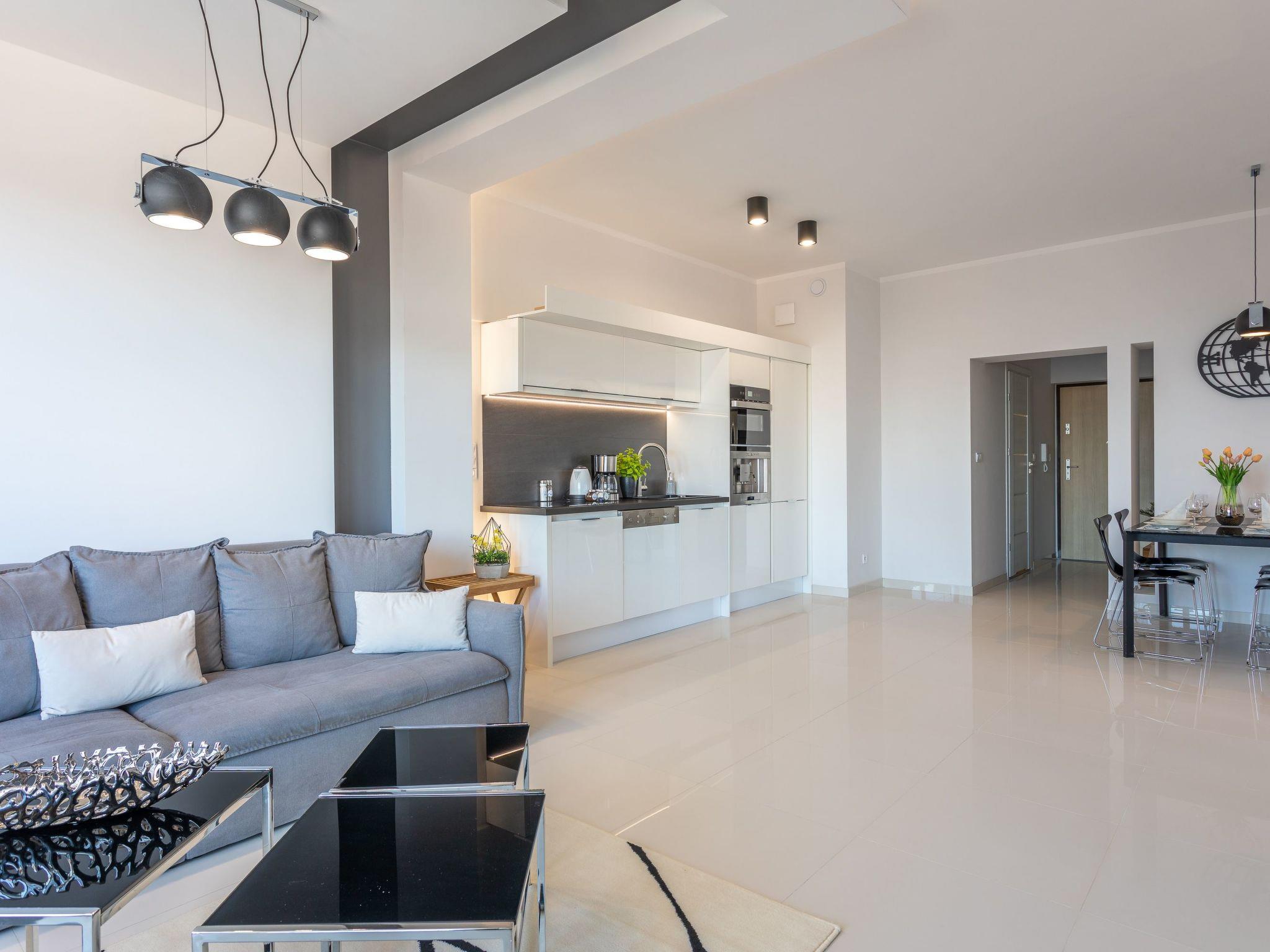 Es ist ein sehr geräumiges und luxuriöses Apartment im siebten Stock mit zwei großen Schlafzimmern, einem Ankleidezimmer, einem Wohnzimmer mit einer gut ausgestatteten Küchenzeile und einem Badezimmer. Seine Gesamtfläche beträgt 70 m2. Die nutzbare Fläche wird durch den Balkon erweitert, wo Sie angenehme Momente bei einer Tasse frisch gebrühtem Kaffee oder einem Glas Ihres Lieblingsweins verbringen und das schöne Panorama von Swinemünde genießen können. Den Gästen steht - gegen Gebühr - auch ein Parkplatz im Nachbargebäude zur Verfügung, was den Reisekomfort erheblich erhöht und besonders für Familien mit Kindern wünschenswert sein kann. Die Wohnung ist im minimalistischen Stil mit ausdrucksstarken Glamour-Motiven eingerichtet: Das Auge wird von gedeckten Farben dominiert, Grau, Beige und Weiß mit einem ausgewogenen gelben Akzent wie ein Sonnenstrahl, sowie schöne Holzdetails, dezent in die Moderne geschmuggelt Möbel oder Accessoires, die das Interieur erwärmen und mit ihrer Textur und ihrem unkonventionellen Aussehen entzücken. Darüber hinaus verleihen hochglänzend lackierte Möbel den einzelnen Elementen der Ausstattung nicht nur Eleganz und eine gewisse Leichtigkeit, sondern bringen auch einen ungezwungenen Stil in den Raum und ergänzen das Arrangement perfekt. Dadurch strahlt diese überaus großzügige Wohnung Ruhe aus und verspricht Behaglichkeit und Entspannung. Hier wird nicht nur auf den ästhetischen Wert des Raumes geachtet, sondern auch – unter anderem mit funktionellen Möbeln, wie einem großzügigen Sofa, großen und bequemen Betten oder einem Schminktisch – auf die individuellen Bedürfnisse der Gäste.