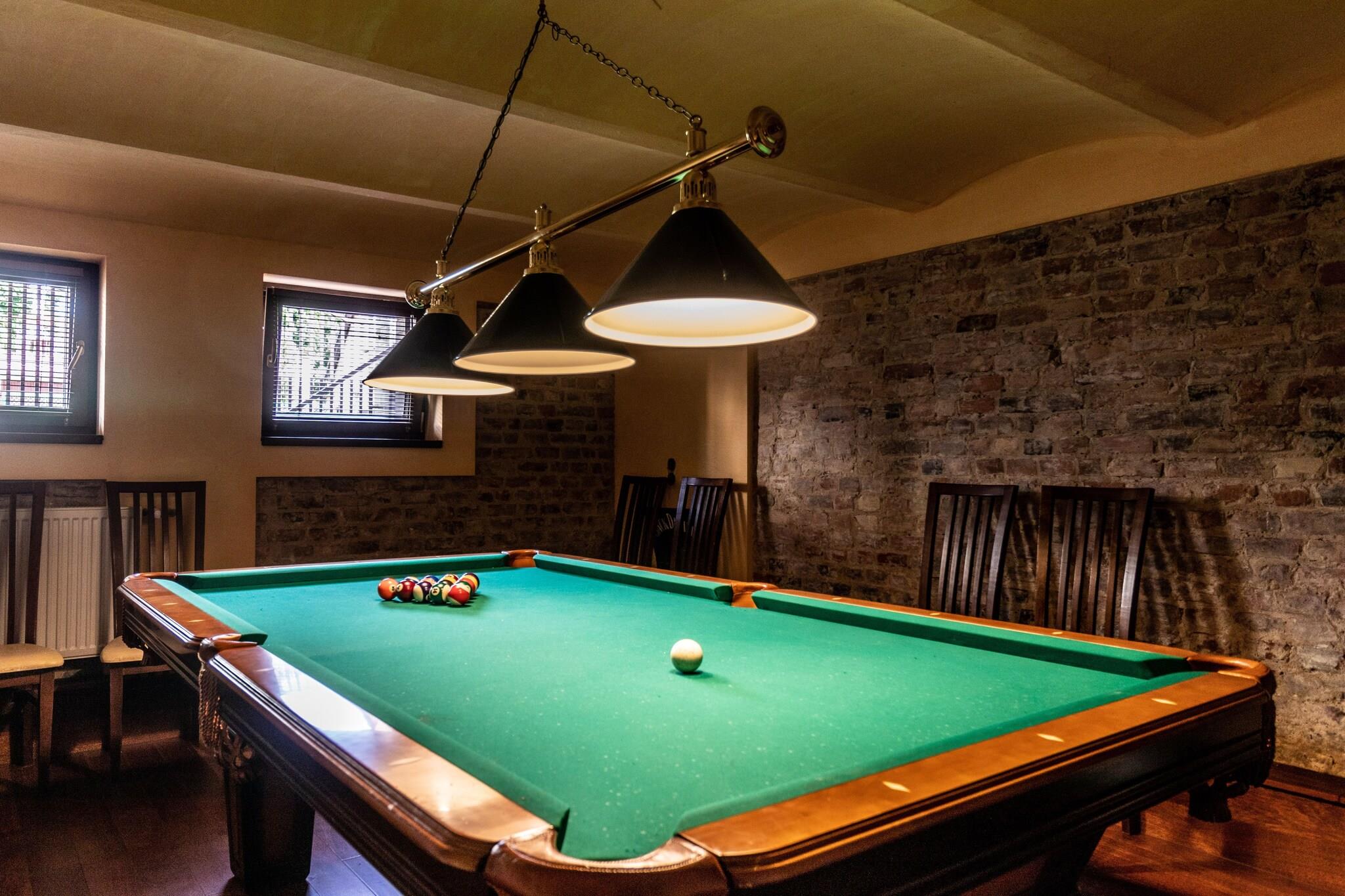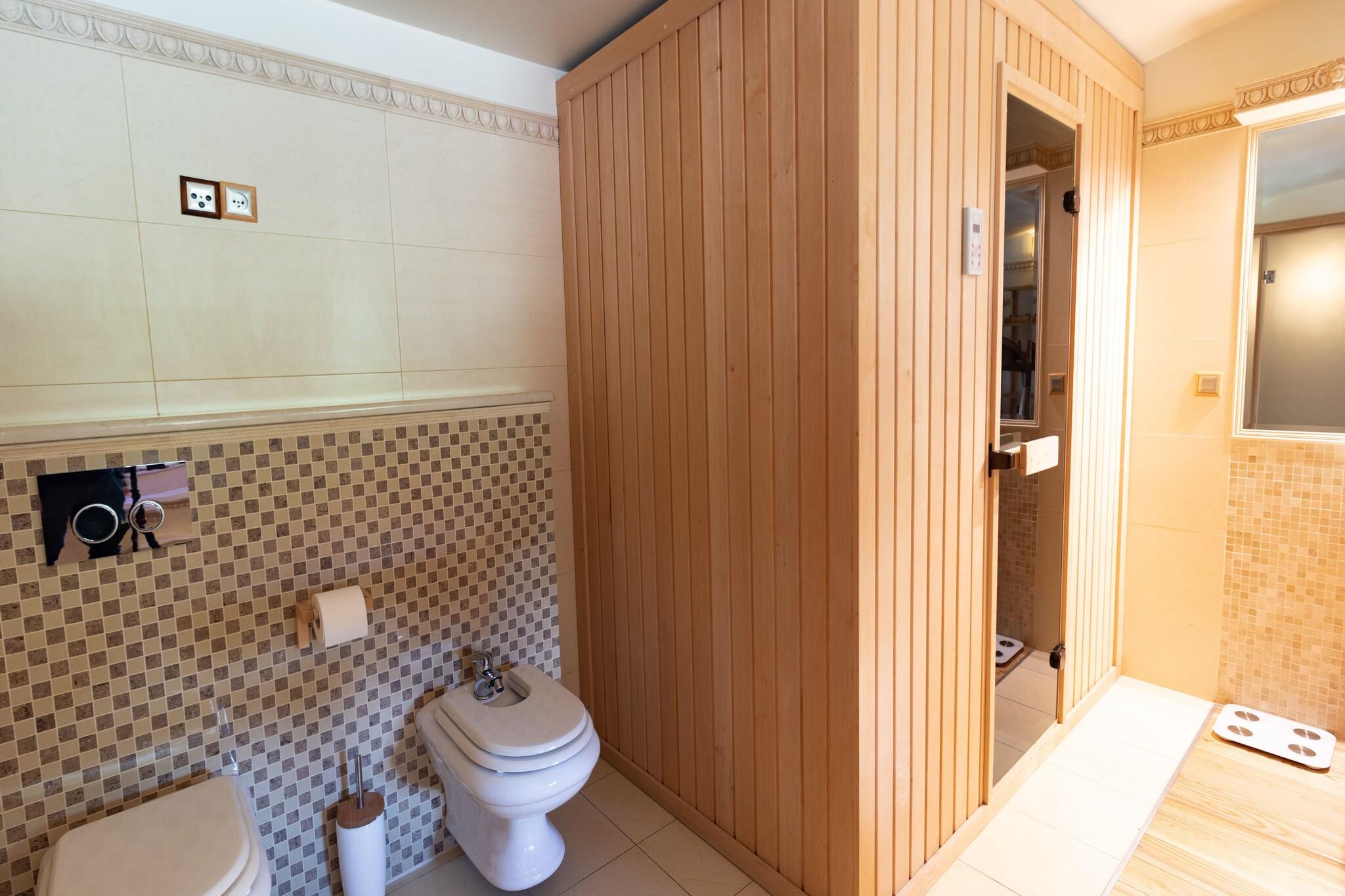 Parterre: (offene Küche(Esstisch, Wasserkocher, Kochendwasserhahn, Kochherd(4 Kochplatten, Induktion), Espressomaschine, Backofen, Mikrowelle, Spülmaschine, Kühl-/Gefrierkombination), Wohn/Esszimmer(TV(Satellit, Deutsch Fernsehsender), Sitzecke), Schlafzimmer(Doppelbett, TV), Schlafzimmer(Doppelschlafcouch), Badezimmer(Dusche, Waschbecken, Toilette), Badezimmer(Whirlwanne, Dusche, Infrarotsauna, Waschbecken, Toilette, Bidet), Toilette(Waschbecken, Toilette)) In der 1. Etage: (Schlafzimmer(Doppelbett, TV), Schlafzimmer(Schlafcouch 1 Pers., TV), Schlafzimmer(Schlafcouch 1 Pers.), Badezimmer(Dusche, Waschbecken, Toilette)) Carport, Heizung(Gas), Terrasse, Garten, Gartenmöbel, Grill, Billard, Fitnessgeräte