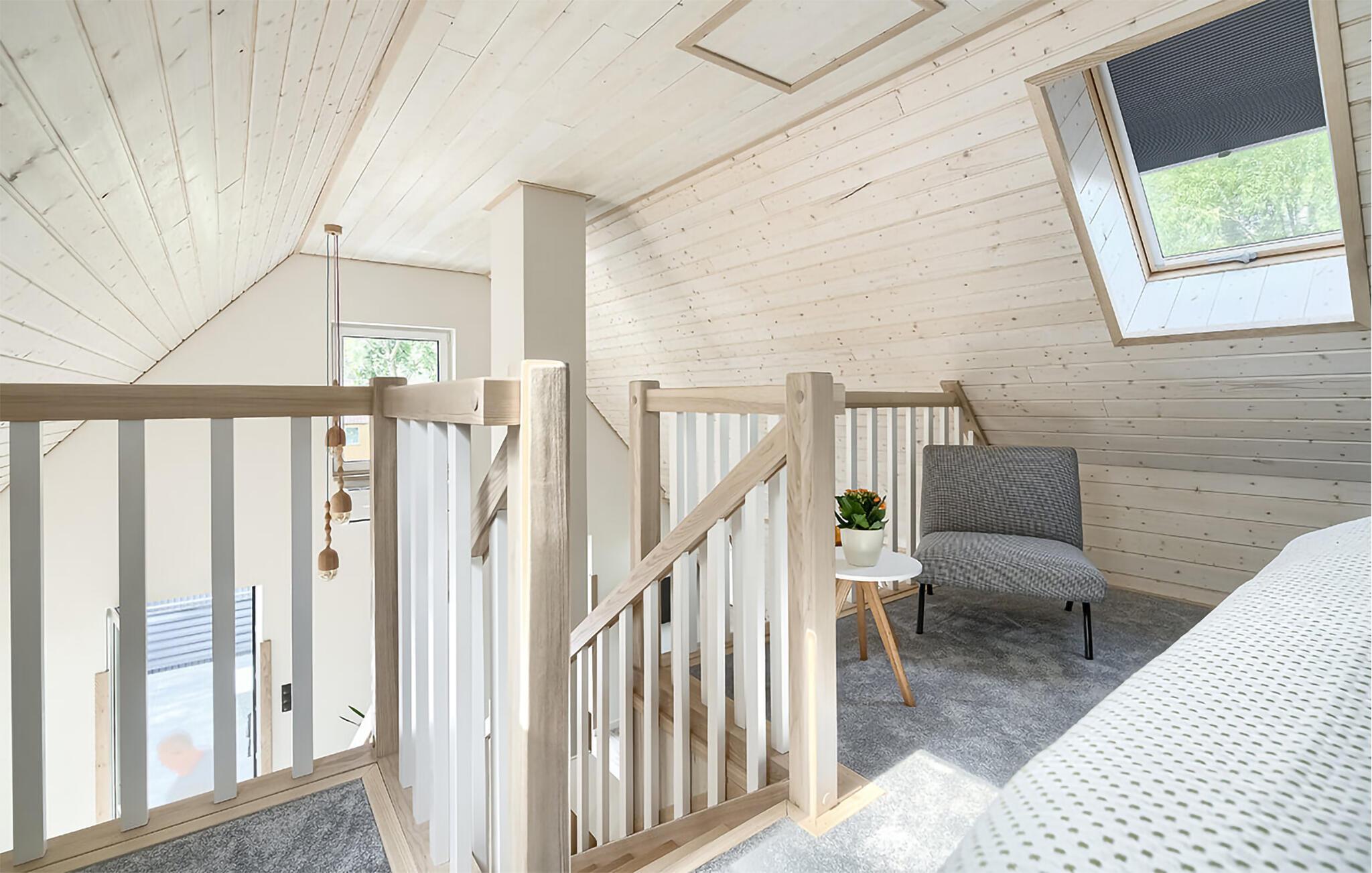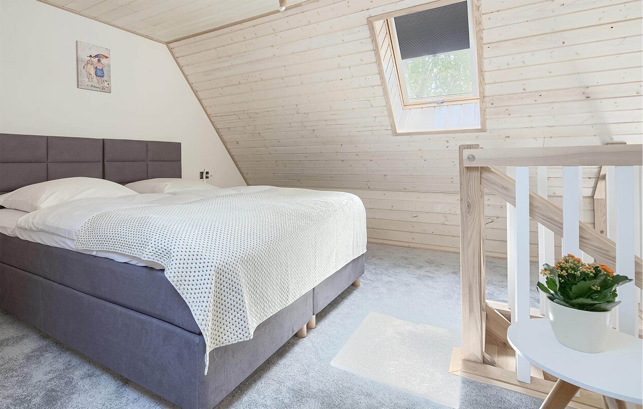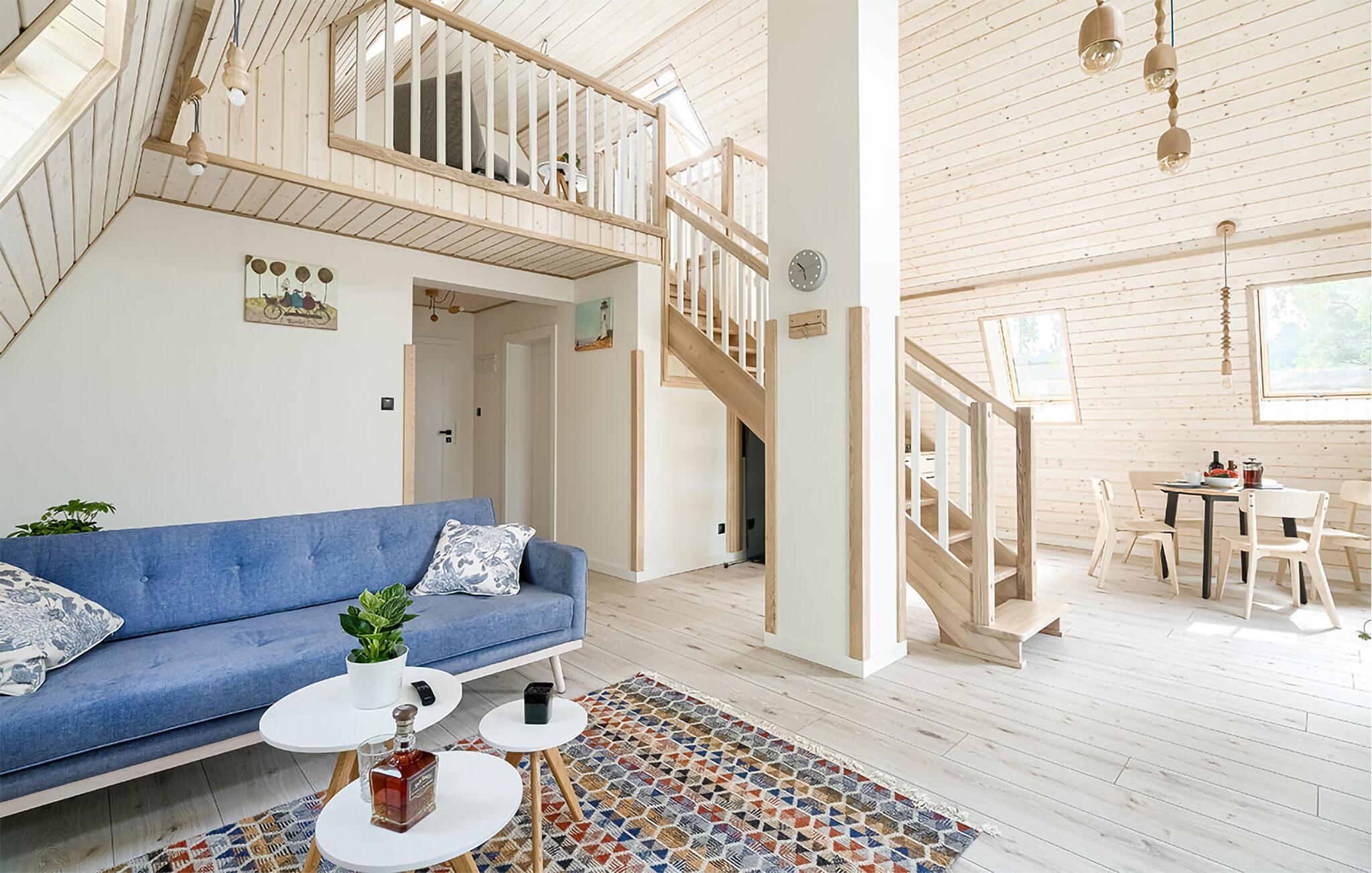 Eine hell und modern gestaltete Ferienwohnung mit einem besonderen Grundriss, der dem Wohnbereich ein luftiges Raumgefühl und offene Großzügigkeit verleiht. Das auffallende Wohnkonzept fördert Kommunikation und Geselligkeit: Niemand muss in der Küche alleinstehen, während sich der Rest der Familienmitglieder mit Kartenspielen amüsiert. Eine Treppe führt hinauf zum ersten Stock und damit auch zur Galerie, die ebenfalls die Kommunikation erleichtert. Frühstücken Sie auf der geschlossenen Terrasse und genießen Sie ausgiebig die ersten Sonnenstrahlen. Wenn Sie von einem Ausflug zurückkommen, können Ihre Kinder auf dem Rasen herumtollen, während Sie das Abendessen zubereiten.