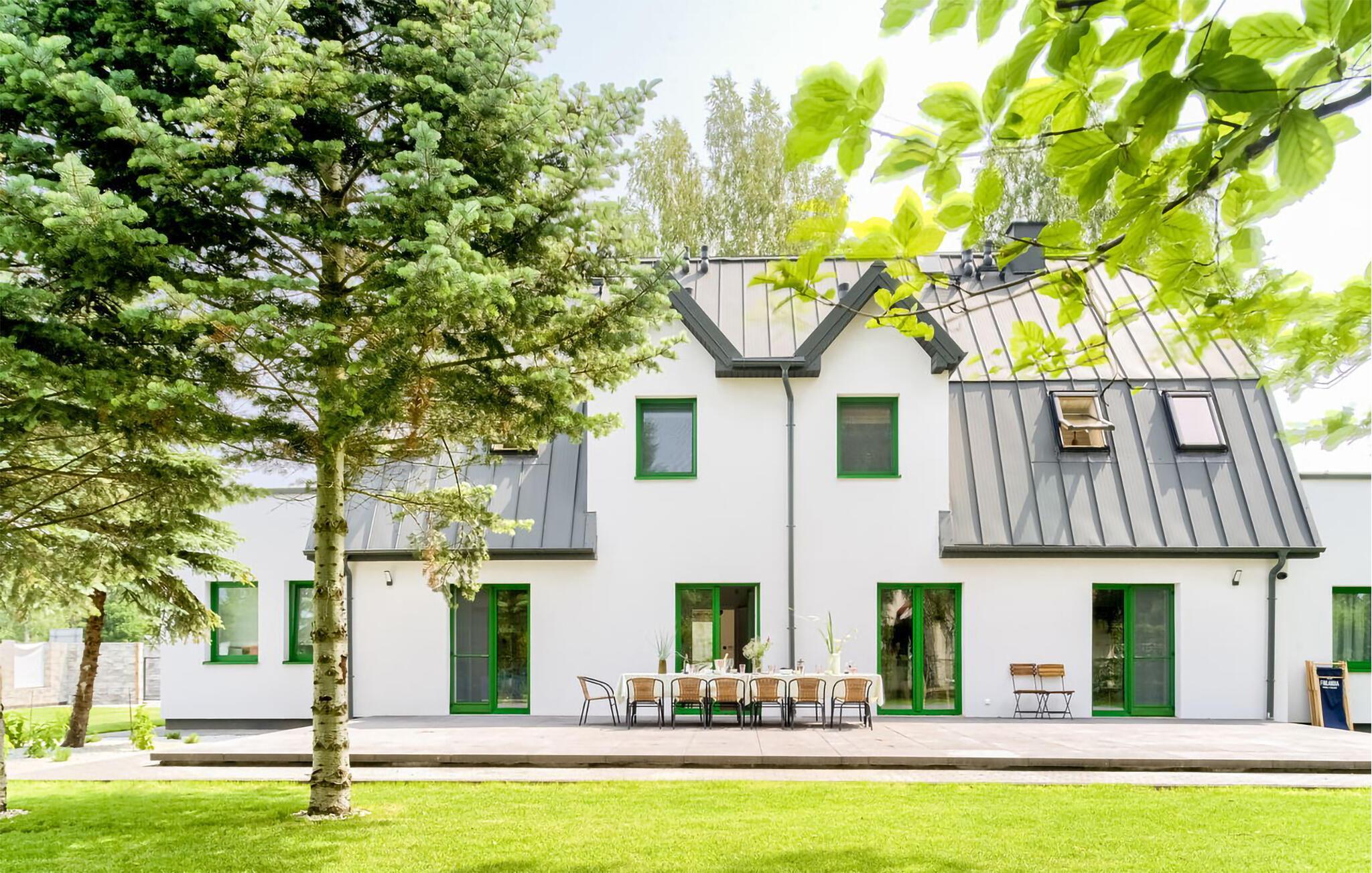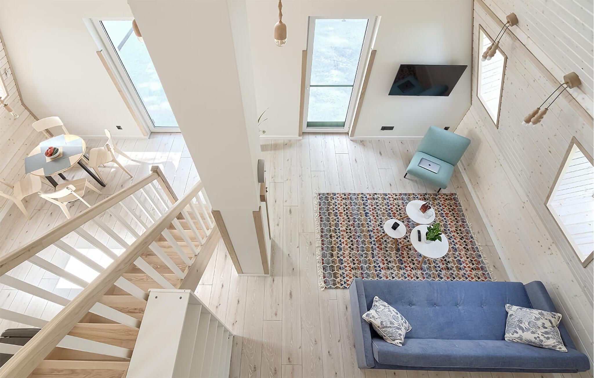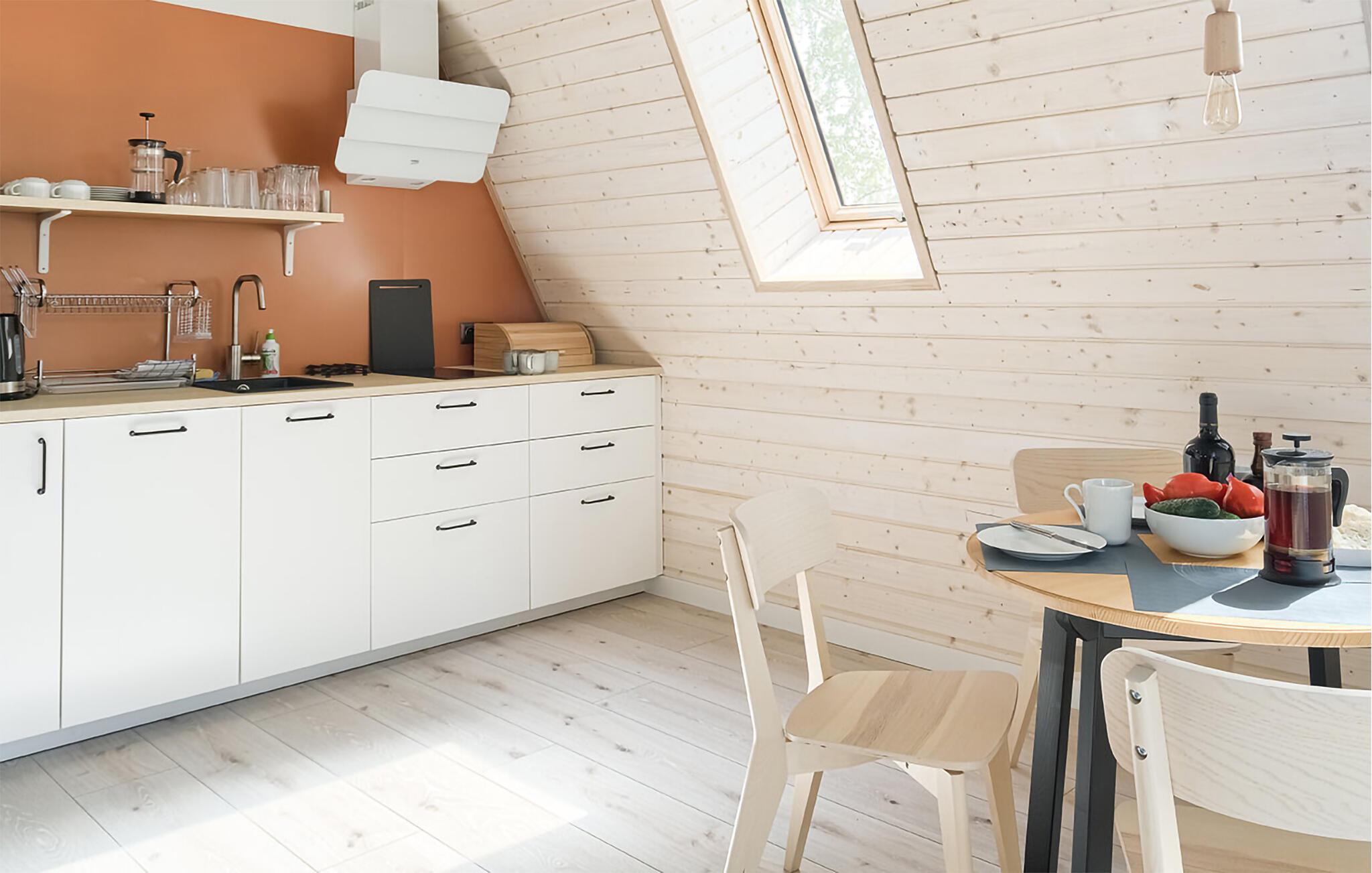 Eine hell und modern gestaltete Ferienwohnung mit einem besonderen Grundriss, der dem Wohnbereich ein luftiges Raumgefühl und offene Großzügigkeit verleiht. Das auffallende Wohnkonzept fördert Kommunikation und Geselligkeit: Niemand muss in der Küche alleinstehen, während sich der Rest der Familienmitglieder mit Kartenspielen amüsiert. Eine Treppe führt hinauf zum ersten Stock und damit auch zur Galerie, die ebenfalls die Kommunikation erleichtert. Frühstücken Sie auf der geschlossenen Terrasse und genießen Sie ausgiebig die ersten Sonnenstrahlen. Wenn Sie von einem Ausflug zurückkommen, können Ihre Kinder auf dem Rasen herumtollen, während Sie das Abendessen zubereiten.
