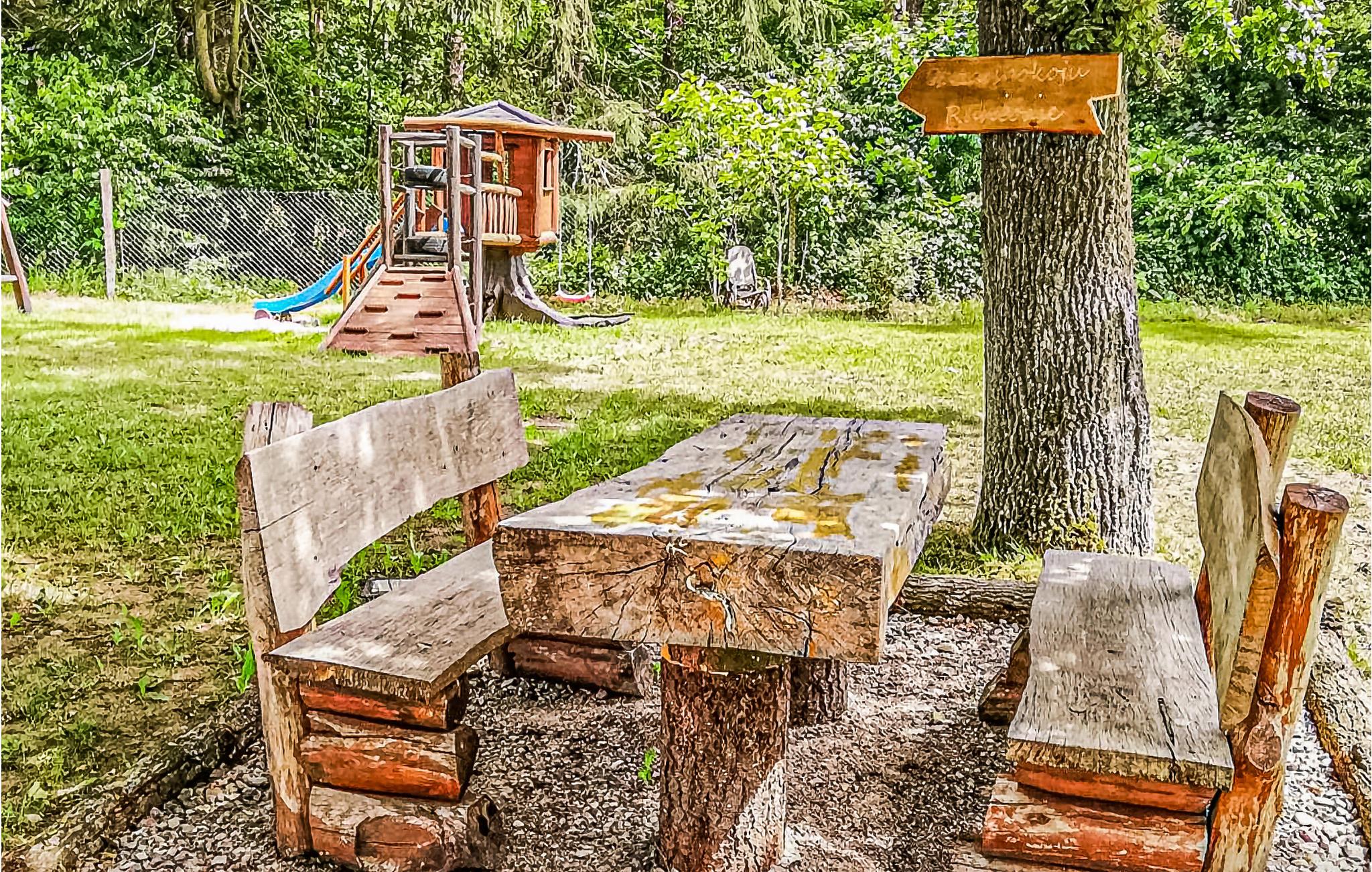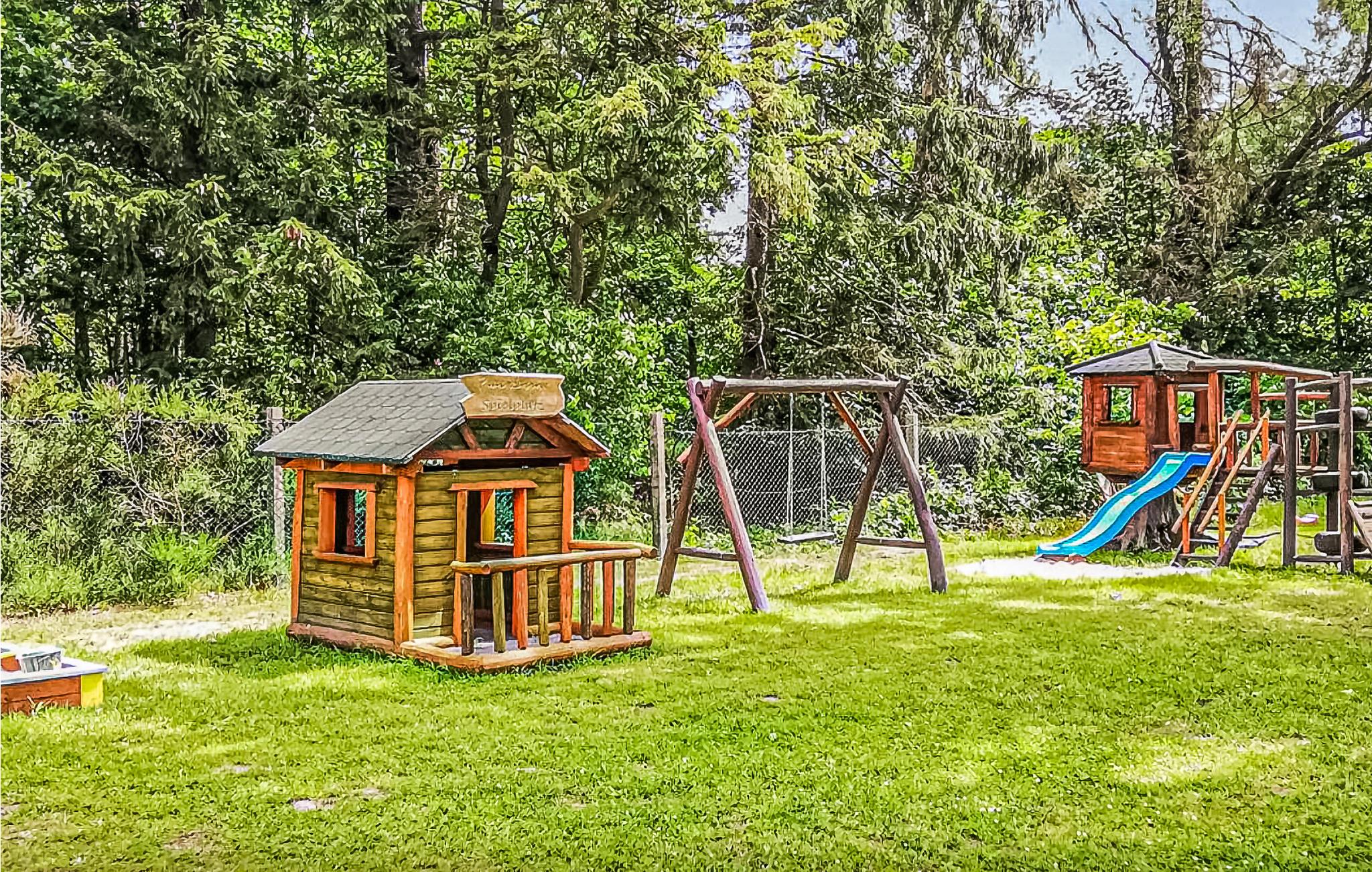Das Haus ist komfortabel eingerichtet und die vielen Holzelemente strahlen viel Gemütlichkeit aus. Das Haus befindet sich auf einem großen gemeinsam mit einem weiteren Haus genutzten Grundstück. Im Garten mit Gartenmöbeln können Sie gut entspannen, während die Jüngsten den gut ausgestatteten Spielplatz erkunden.