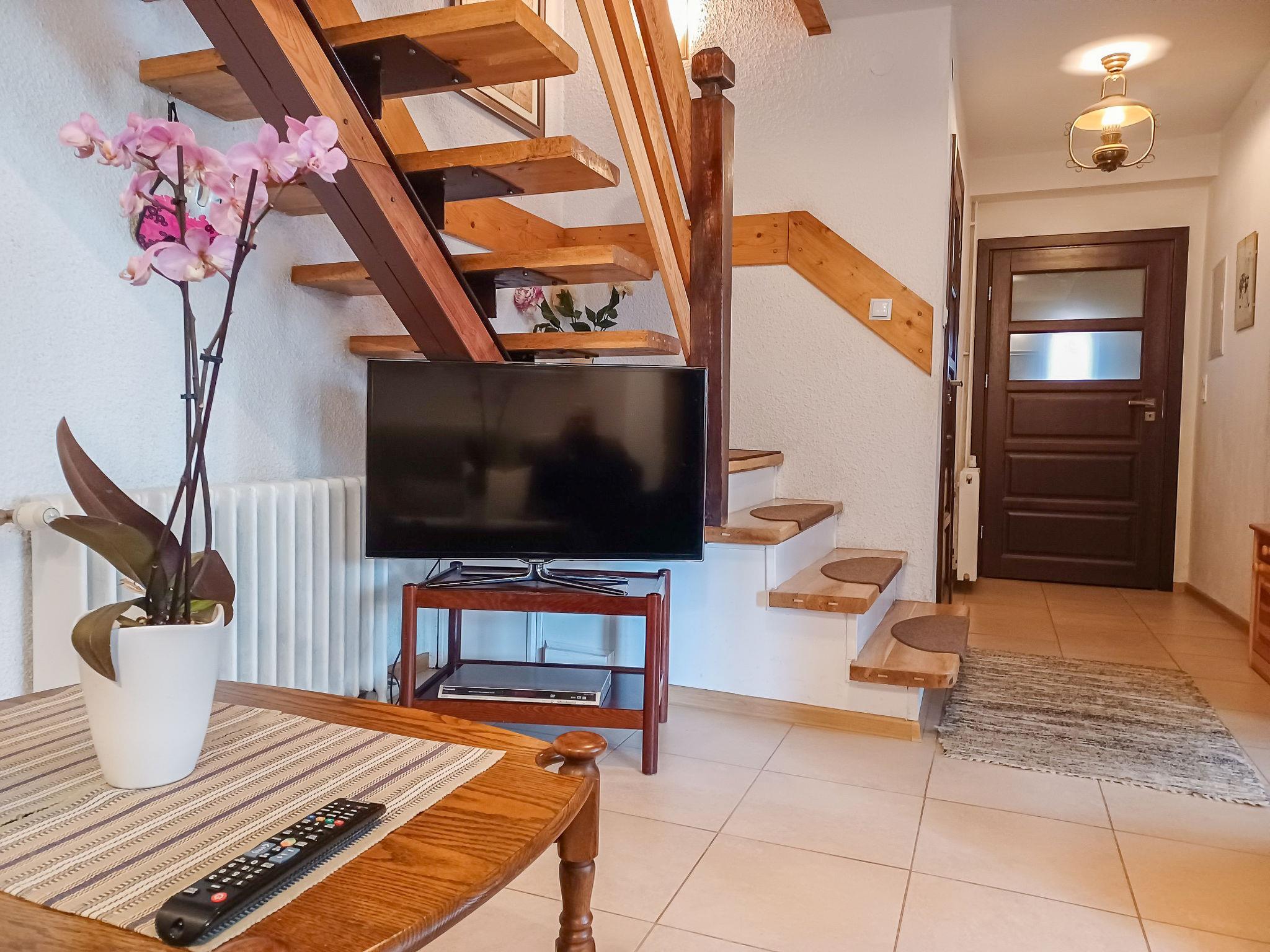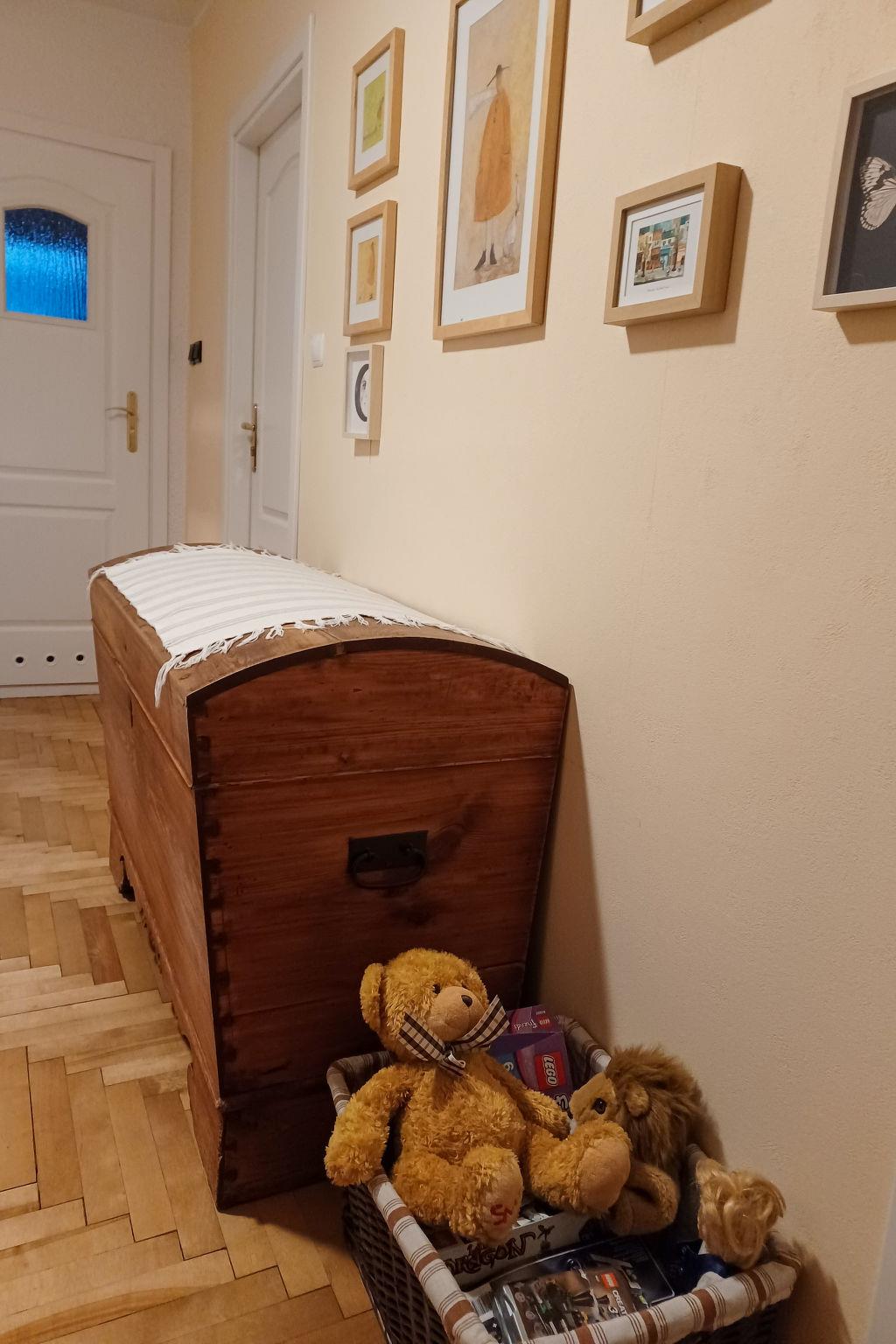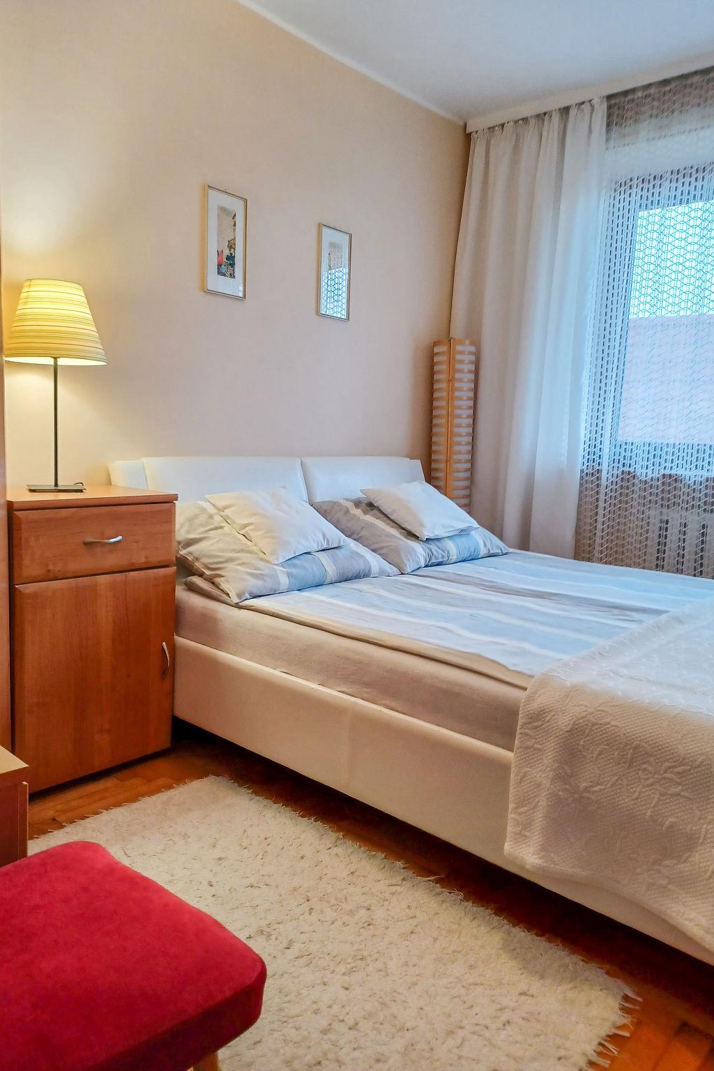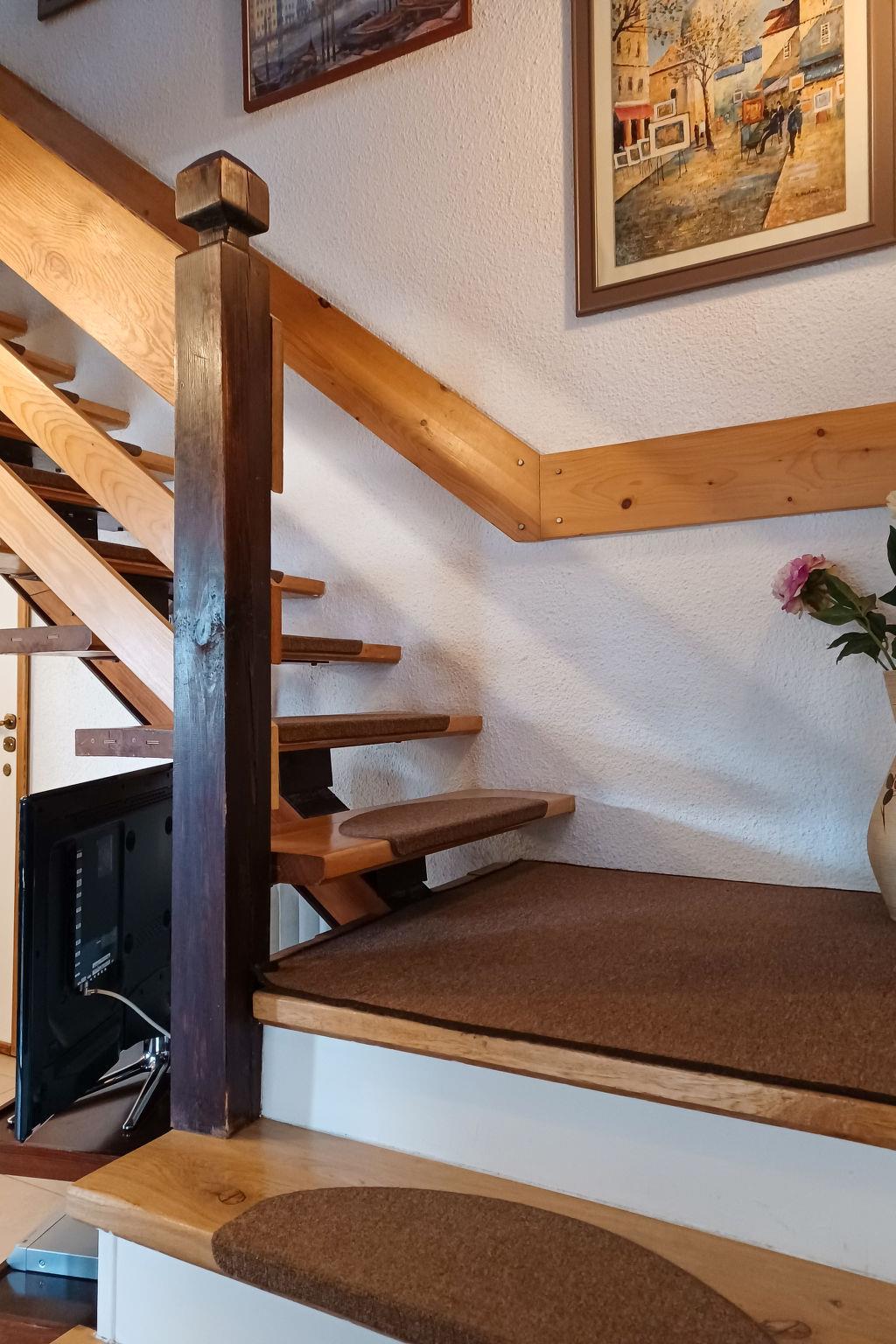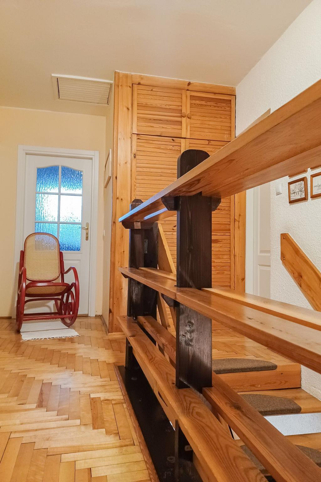 4-Zimmer-Wohnung 105 m2 auf 2 Stockwerken. Eingang mit 1 Diwanbett, Sat-TV und Radio. Ausgang zum Garten. Küche (Backofen, Geschirrspüler, elektrische Kaffeemaschine) mit Essecke. Dusche/WC. Obergeschoss: 1 Zimmer 13 m2 mit 1 franz. Bett (180 cm, Länge 200 cm). Ausgang zum Balkon. 1 Zimmer 10 m2 mit 1 franz. Bett (160 cm, Länge 200 cm). 1 Zimmer 12 m2 mit 2 Betten (80 cm, Länge 200 cm). 1 Zimmer 10 m2 mit 2 Betten (80 cm, Länge 200 cm). Dusche/WC, Bad/Dusche/WC. G-Heizung, Solarheizung, Boiler (300 Liter). Balkon 8 m2. Zur Verfügung: Kinderhochstuhl. Internet (Wireless LAN, gratis). Parkplatz (2 Autos). Bitte beachten: Nichtraucher-Unterkunft. Eigener Eingang.