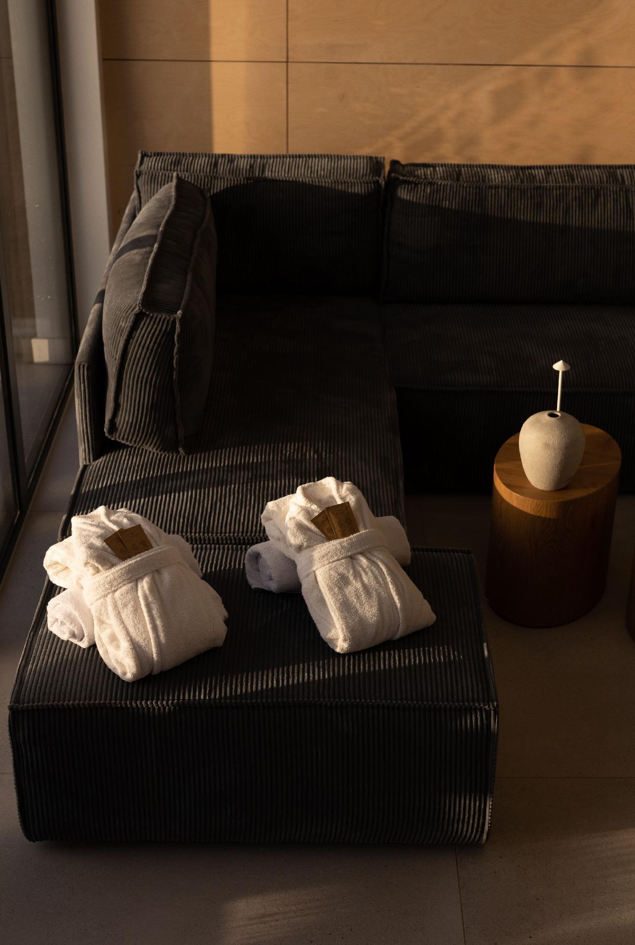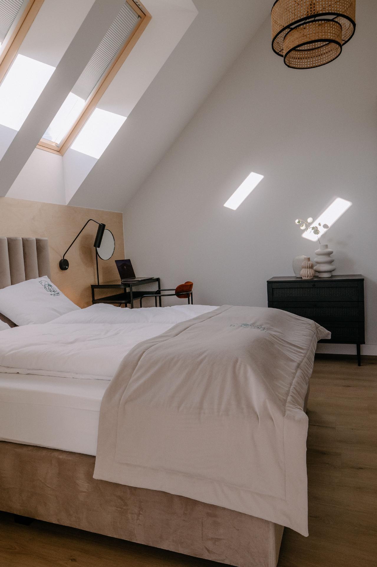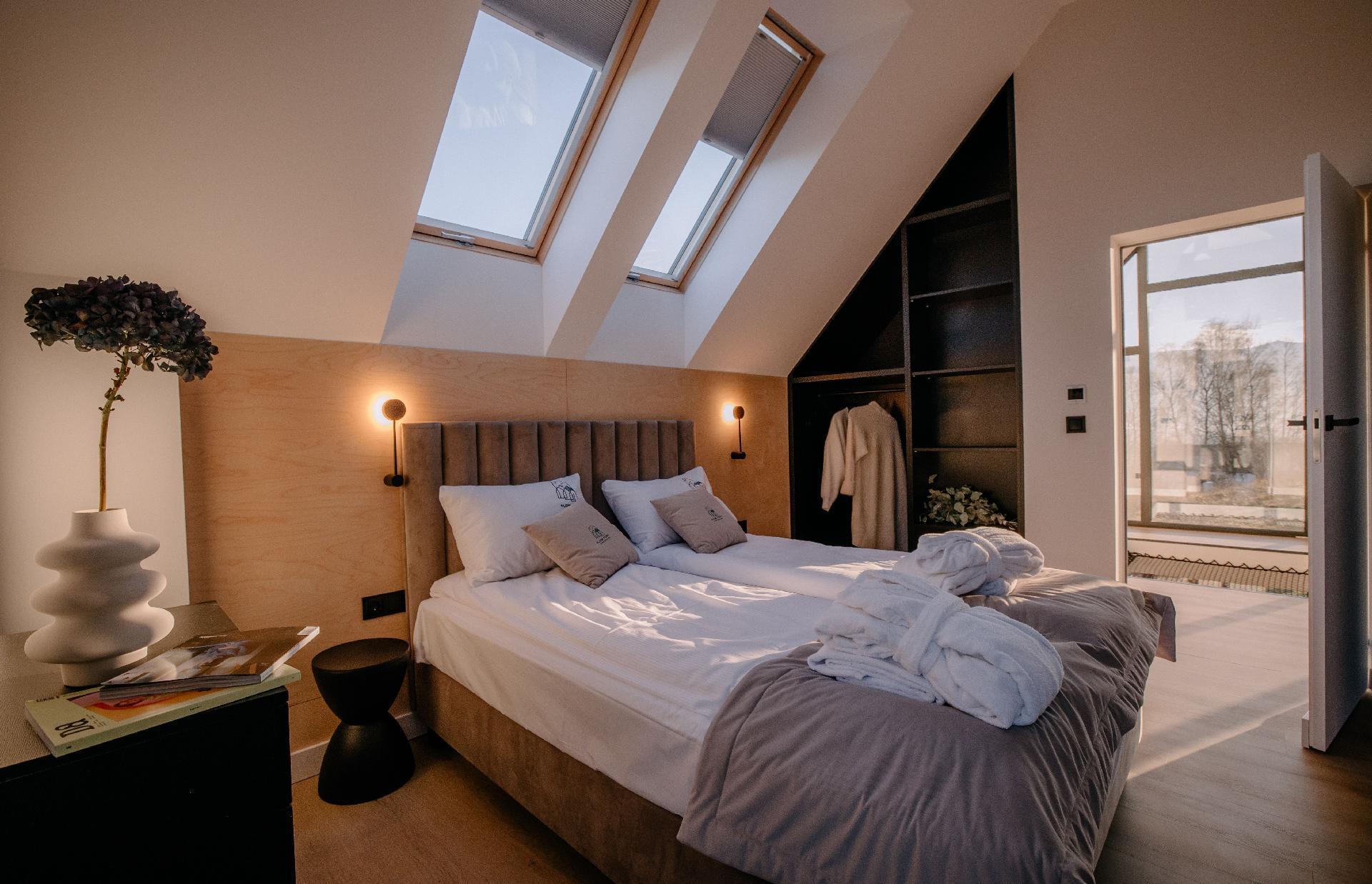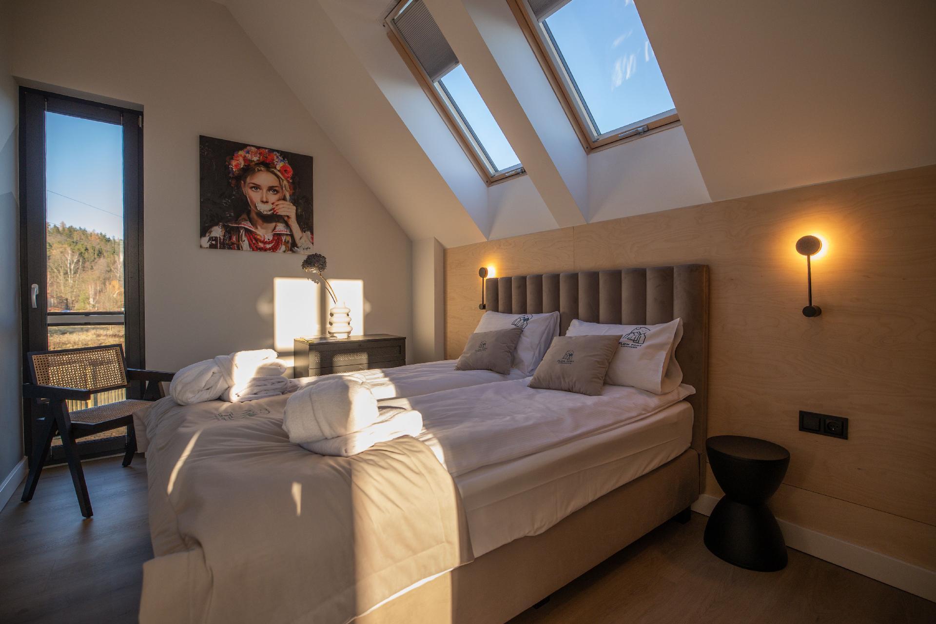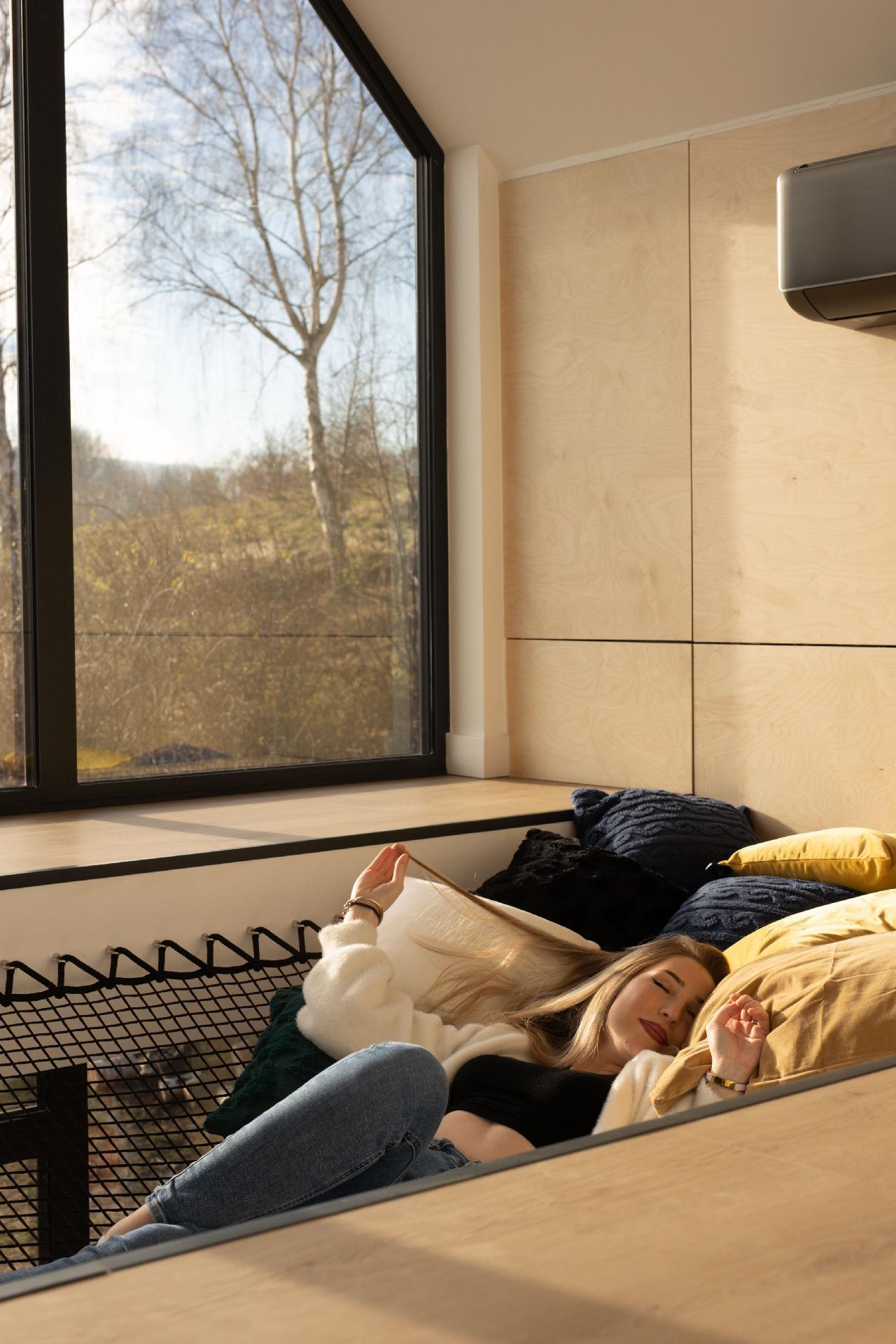 Das Innere jedes Ferienhauses ist mit Komfort und Luxus ausgestattet. Für eine angenehme Nachtruhe sorgen Betten in Hotelqualität: Im Hauptschlafzimmer und im zweiten Schlafzimmer stehen Doppelbetten (160×200 cm), im Wohnzimmer ein Schlafsofa (150×200 cm, für zwei Personen) und für eine weitere Person ein ausklappbares Hotelbett (90×200 cm). Für die kleinsten Gäste stehen zwei Reisebetten (60×120 cm) zur Verfügung. Jedes Cottage ist mit einem Smart-TV und kostenlosem WiFi ausgestattet, um Unterhaltung und Komfort in Reichweite zu haben.