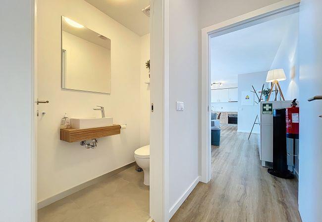 Das Apartment verfügt über ein Schlafzimmer mit Queen-Size-Bett und ein Schlafsofa im Wohnzimmer. Es gibt zwei Bäder: eines mit Dusche und ein zusätzliches Gäste-WC. Die Küche ist mit Kühlschrank, Gefrierschrank, Backofen, Mikrowelle, Kochfeld, Geschirrspüler, Besteck, Tellern und weiteren Küchenutensilien ausgestattet. Eine Waschmaschine und ein Haartrockner stehen ebenfalls zur Verfügung.
