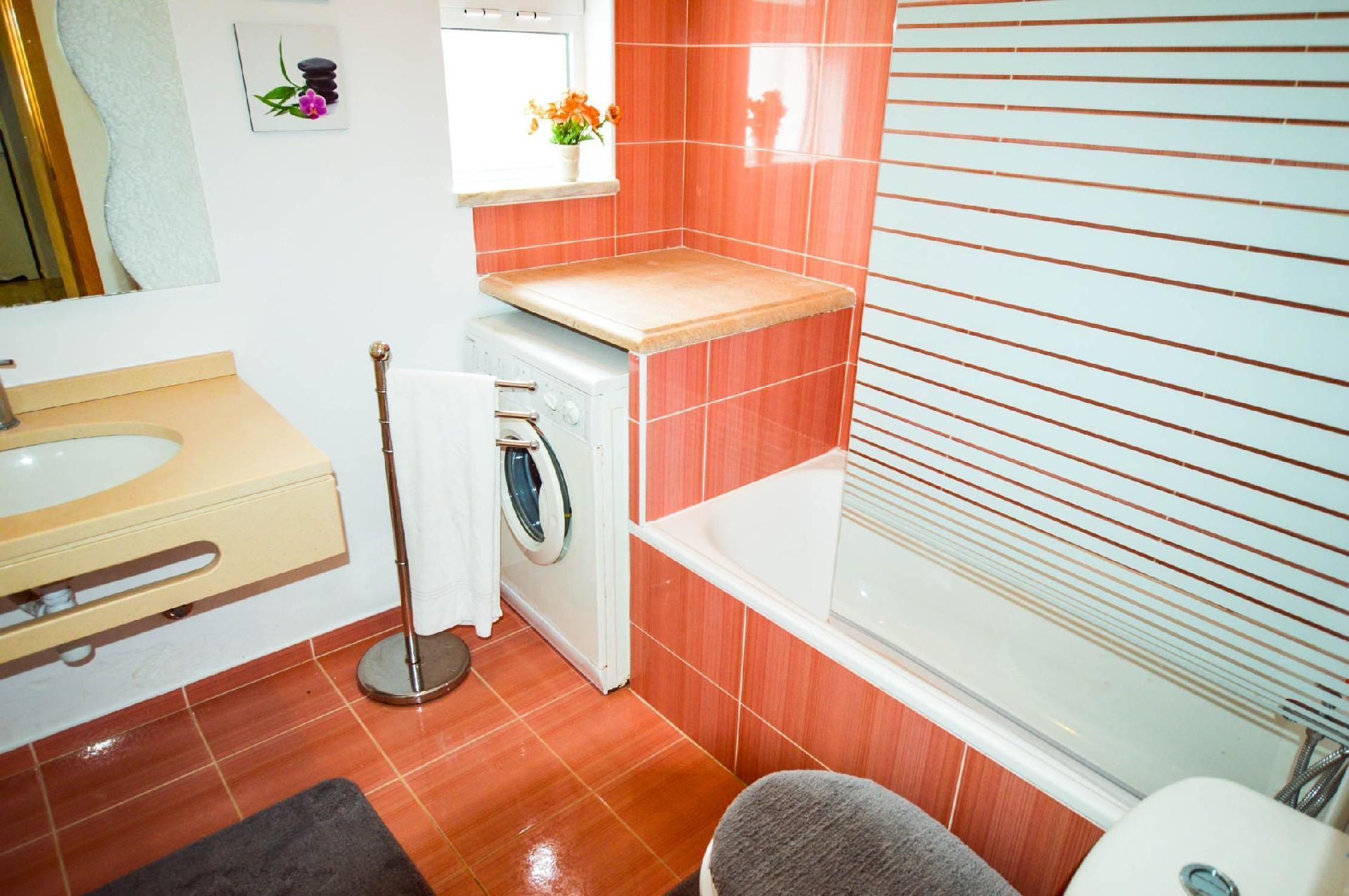 Herd, Backofen, Kühlschrank, Mikrowelle, Wasserkocher und Kaffeemaschine. Die Wohnung verfügt über ein Badezimmer mit Badewanne, Waschmaschine und Toilette. Es ist mit Klimaanlage und Heizung ausgestattet (gegen Aufpreis).