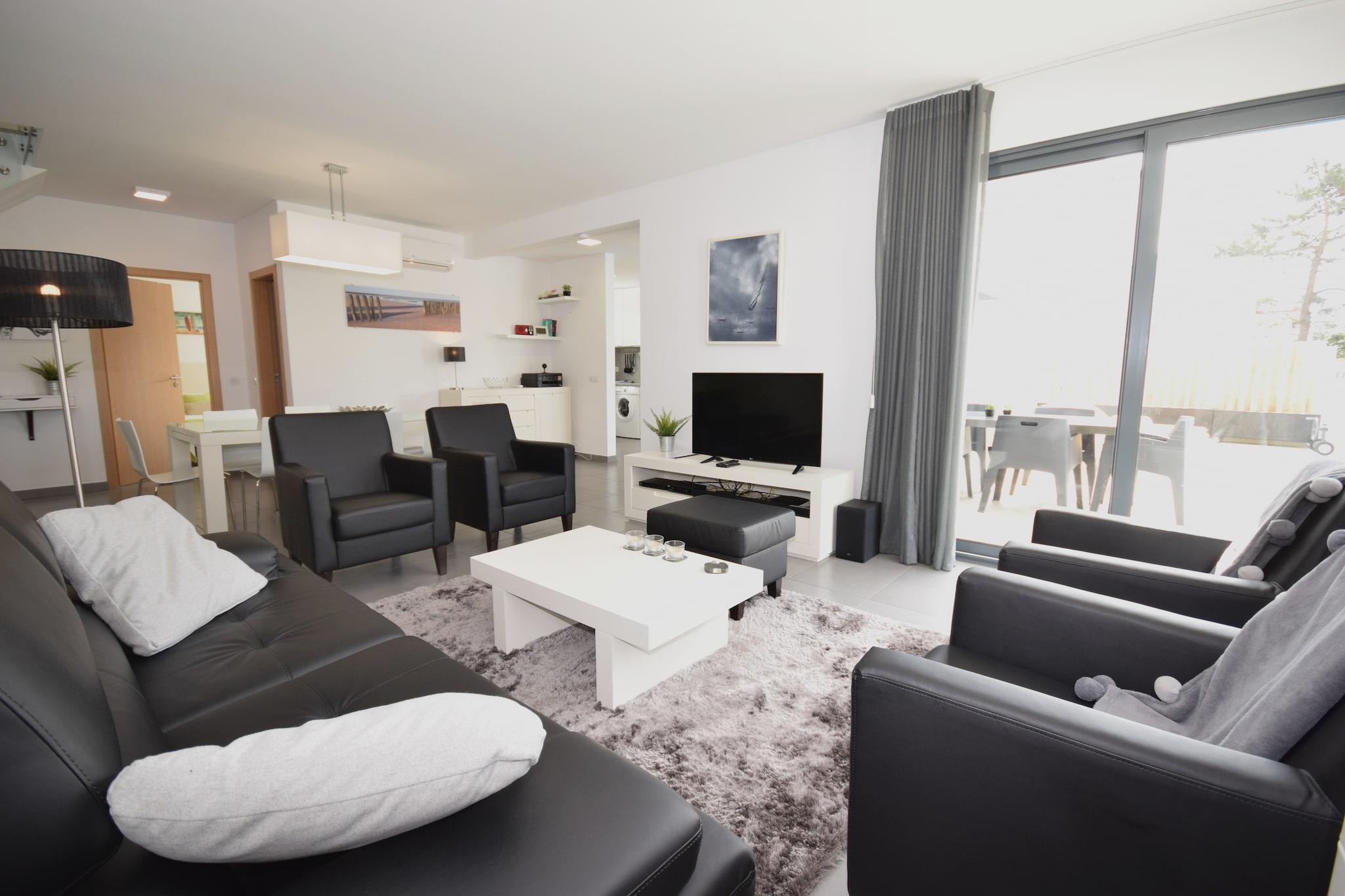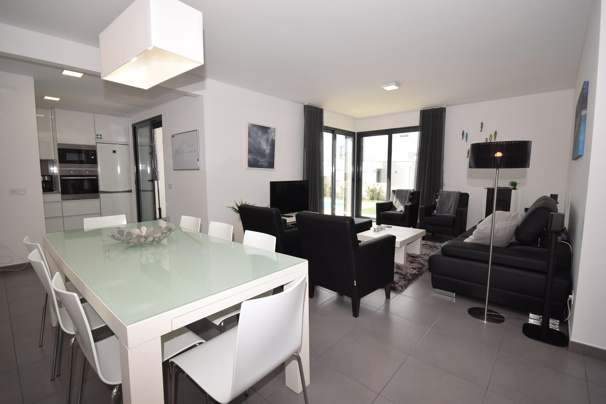 Parterre: (offene Küche(Kochplatte(4 Kochplatten, Ceranfeld), Wasserkocher, Toaster, Kaffeemaschine, Backofen, Mikrowelle, Spülmaschine, Kühl-/Gefrierkombination, Waschmaschine), Wohn/Esszimmer(TV(internationale TV-Kanäle, keine niederländischen Fernsehsender), Esstisch, Sitzecke, Klimaanlage), Schlafzimmer mit Badezimmer(2x Einzelbett, Badewanne mit Dusche, Waschbecken, Toilette, Bidet, Klimaanlage), Toilette) In der 1. Etage: (Schlafzimmer(Doppelbett, Balkon, Klimaanlage), Schlafzimmer(Doppelbett, Balkon, Klimaanlage), Badezimmer(Dusche, Waschbecken, Toilette), Terrasse(30 m2)) Terrasse, Garten(umzäunt), Gartenmöbel, Liegen, Grill, Parkplatz, Sonnenschirm, Pool(alleinige Nutzung, 7 x 3 m.), Kinderbett, Hochstuhl, Bügelbrett, Bügeleisen