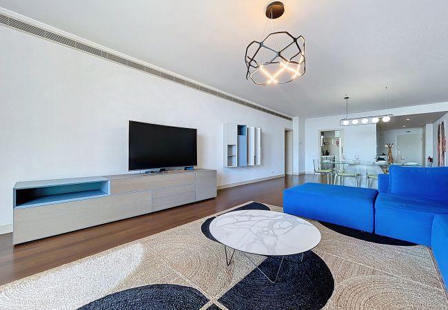Die Wohnung ist für bis zu sechs Gäste ausgelegt und verfügt über zwei Schlafzimmer, eines mit einem Queen-Size-Bett und eines mit einem Queen-Size-Bett, das auf Anfrage in zwei Einzelbetten geteilt werden kann. Das Wohnzimmer bietet ein Schlafsofa für zwei Personen. Es gibt zwei Badezimmer, eines mit Dusche und eines mit Badewanne, was Komfort für alle garantiert.