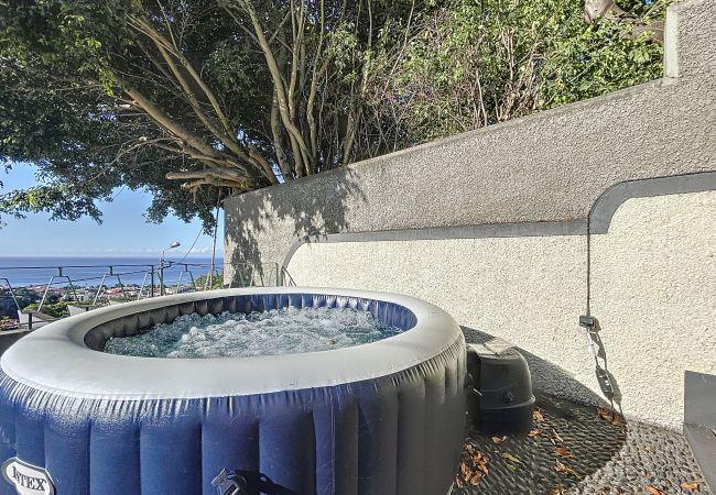 Im Außenbereich lädt ein Jacuzzi mit Blick über Funchal zum Entspannen ein. Ein Grill steht für Mahlzeiten im Freien bereit.