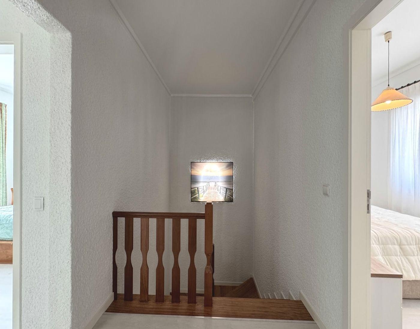 Das Innere des Hauses ist so ausgestattet, dass alle Ihre Bedürfnisse während Ihres Aufenthalts erfüllt werden. Sie finden eine komplett eingerichtete Küche mit Gasherd, Geschirrspüler, Kaffeemaschine und Wasserkocher, sodass Sie Ihre Mahlzeiten wie zu Hause zubereiten können. Das Haus verfügt außerdem über einen praktischen Waschraum mit Waschmaschine zur privaten Nutzung. Für gesellige Abende sorgt der Kamin, der dem Wohnbereich einen Hauch von Wärme und Gemütlichkeit verleiht. Perfekt konzipiert, um bequem bis zu acht Personen zu beherbergen, wurde jedes Detail durchdacht, um Ihnen während Ihres Aufenthalts optimalen Komfort zu garantieren.