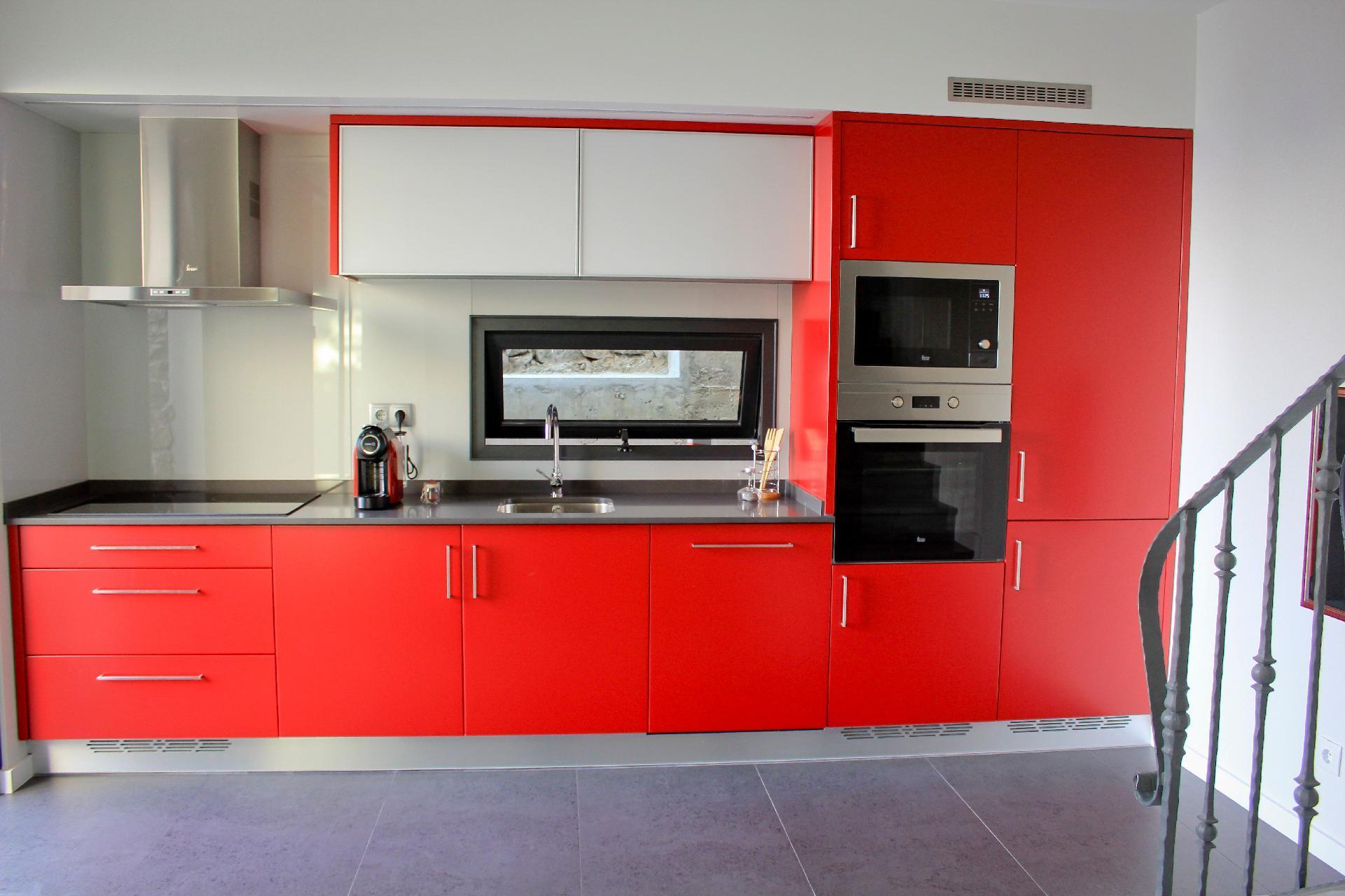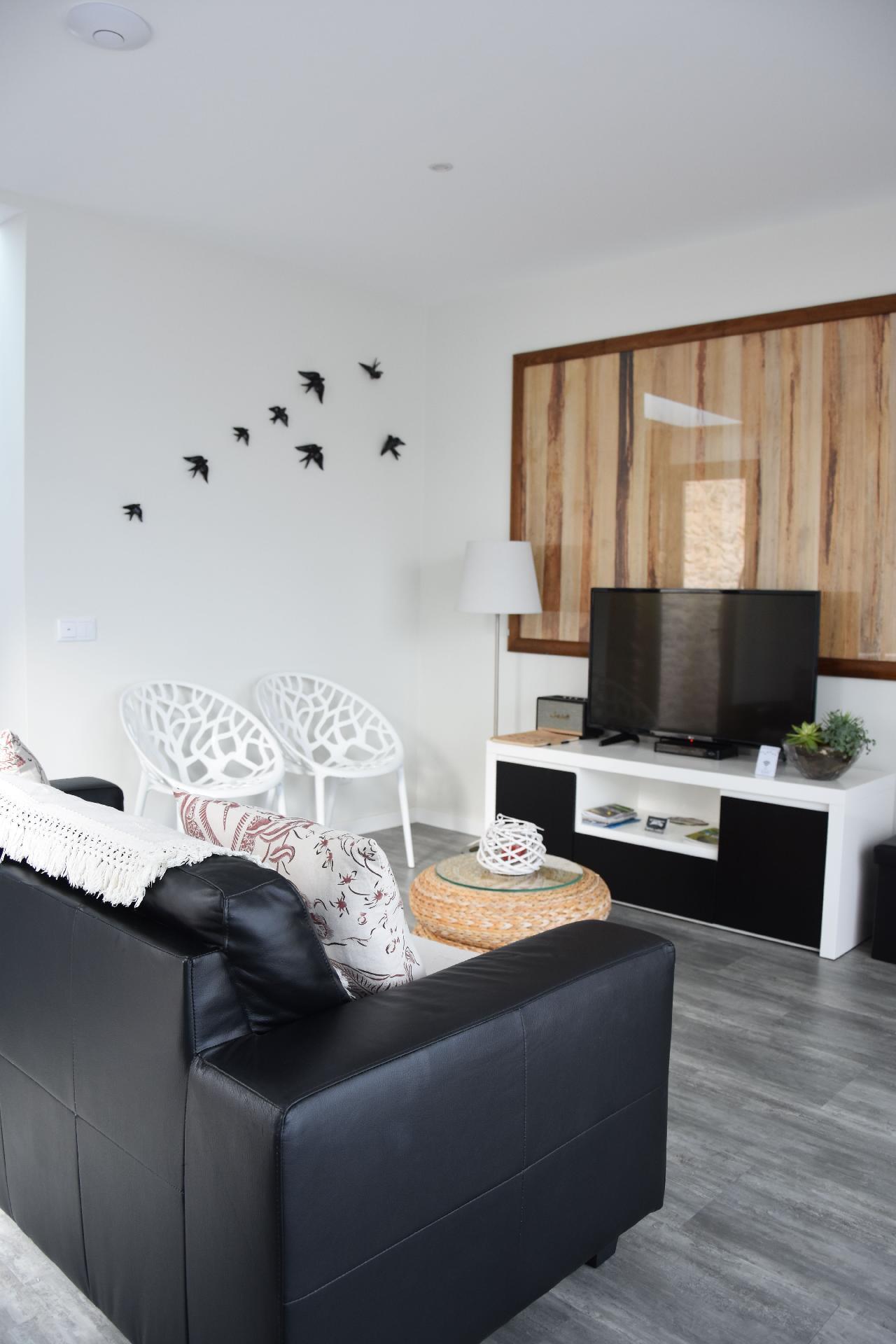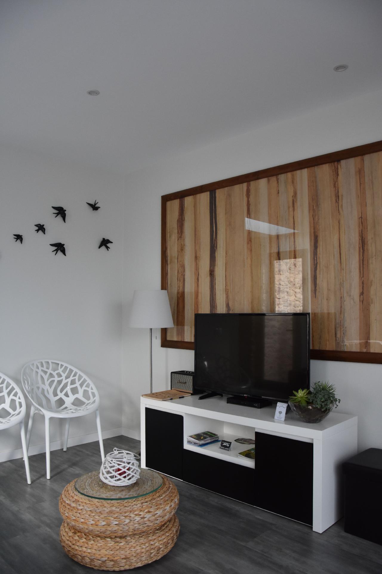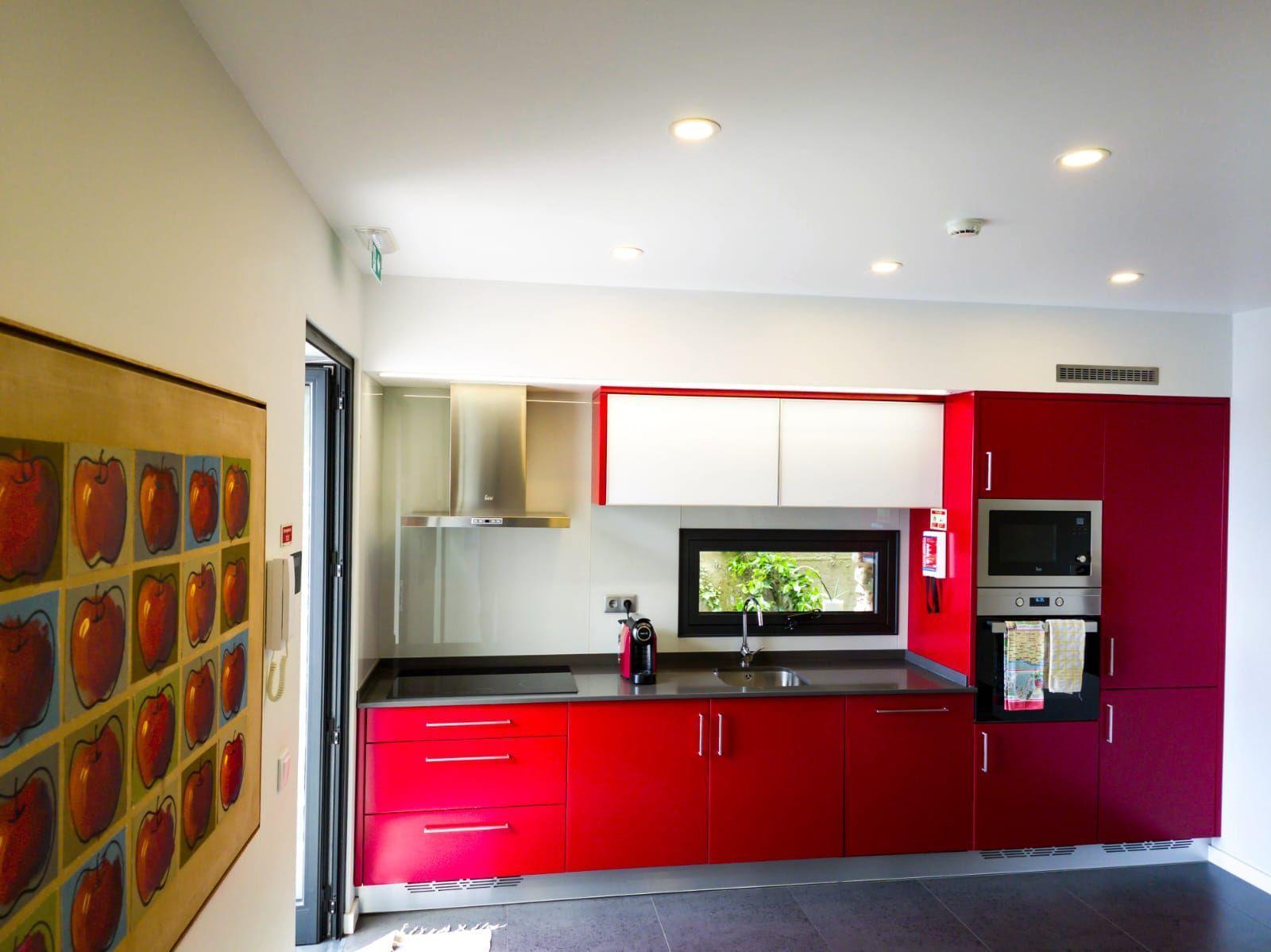 Die zweistöckige Ferienvilla verfügt über zwei Schlafzimmer und bietet Platz für vier Personen. Das Erdgeschoss ist ca. 70 m² groß und bietet folgende Räume: Ein Wohnzimmer mit schwarzem Ledersofa, einem großen Flachbildfernseher und einem Essbereich. Daneben befindet sich ein Schlafzimmer mit zwei Einzelbetten (90 x 200 cm), die Sie zu einem Doppelbett zusammenschieben können. Außerdem gibt es noch eine stilvolle, vollständig ausgestattete rote Hochglanz-Einbauküche mit Cerankochfeld und Dunstabzugshaube aus Edelstahl, Backofen, Mikrowelle, Kühlschrank mit Gefrierfach und Kaffeemaschine. Das Badezimmer im Erdgeschoss ist mit einer begehbarer Regendusche, einem Waschbecken und einer Toilette ausgestattet.