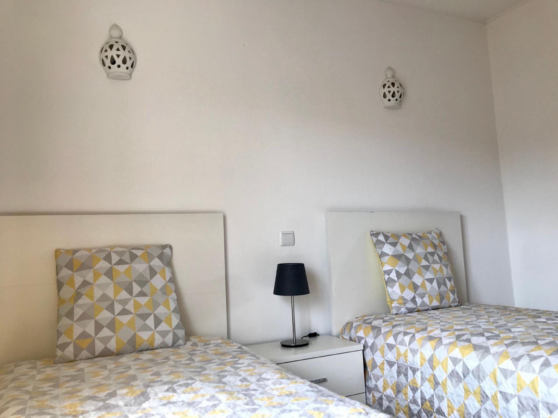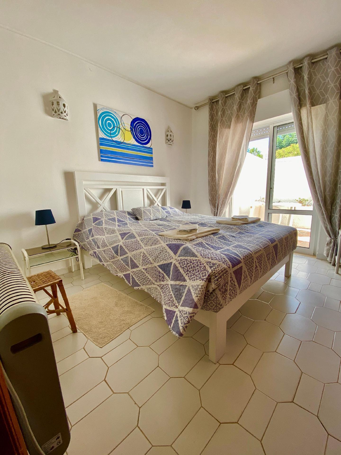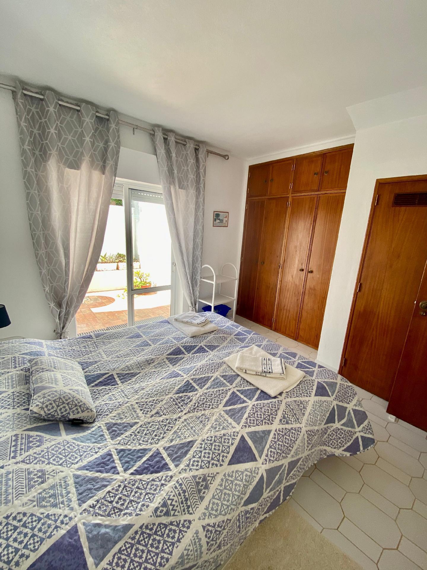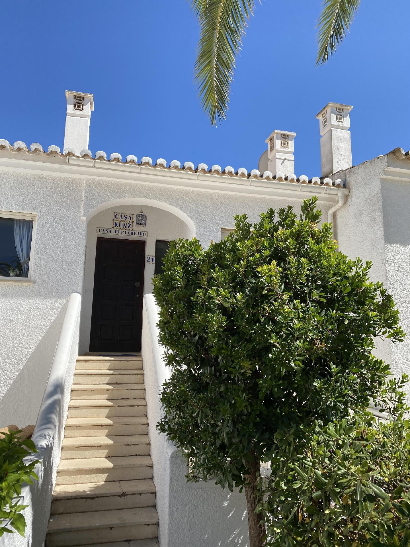 Vorbei an einer schönen Palme im Vorgarten gelangen Sie über eine Treppe direkt in das Obergeschoss des Ferienhauses. Hier befinden sich eine Diele, die Küche, das große Wohn-/Esszimmer sowie der Balkon. Die Küche verfügt über einen großen Kühl- und Gefrierschrank, einen Gasherd und -ofen, eine Mikrowelle, einen Toaster, einen Wasserkocher, eine Kaffeemaschine und einen elektrischen Entsafter. Selbstverständlich gibt es ausreichend Gläser, Geschirr und Besteck, Töpfe und Pfannen und sonstiges Zubehör. Auch die Waschmaschine befindet sich dort, die Sie gerne nutzen dürfen. Speisen und Getränke können einfach über eine Durchreiche von der Küche in den Essbereich gegeben werden. Dort steht ein Esstisch aus Holz mit einer Glasplatte und vier Stühlen. Im Wohnbereich finden Sie eine Couch mit zwei kleineren Tischen und zwei bequemen Hockern. Ein Flachbild-Fernseher mit Satelliten-Receiver und Kabelanschluss bietet Ihnen deutsche, englischsprachige und portugiesische Programme. Vom Wohn-/Esszimmer aus gelangen Sie auf den Balkon. Eine Innentreppe führt Sie vom Wohn-/Essbereich in das Erdgeschoss. Hier befinden sich die beiden Schlafzimmer: das erste mit einem bequemen Doppelbett (ca. 1,8x2m, Premiummatratze), das zweite mit zwei Einzelbetten (jeweils ca. 1x2m, Premiummatratzen), die bei Bedarf auch zusammengeschoben werden können. Vom ersten Schlafzimmer aus gelangen Sie zum kleinen Innenhof. Vom zweiten Schlafzimmer führt die Tür hinaus auf die Terrasse. Das Badezimmer im Haus wurde im Jahr 2020 komplett erneuert. Das modern geflieste Bad verfügt über eine bodenebene Walk-in-Dusche mit großem Duschkopf oben und einer zusätzlichen Handbrause an der Seite, eine Toilette und ein Waschbecken sowie einen großen Spiegel mit integriertem Licht. Sowohl das Wohn-/Esszimmer, als auch die beiden Schlafzimmer verfügen über Heizkörper. Für die Sommermonate steht ein mobiler Ventilator bereit.