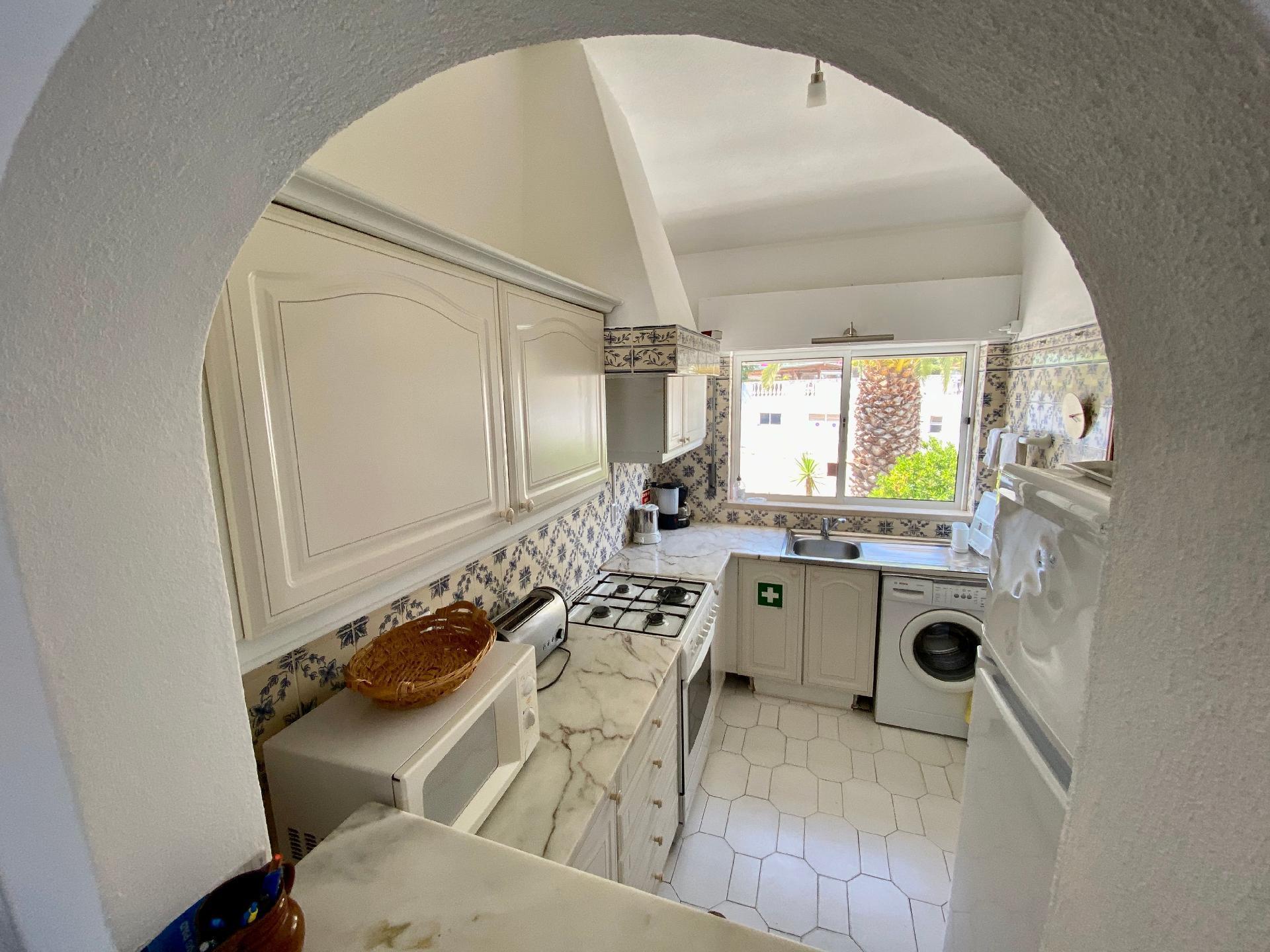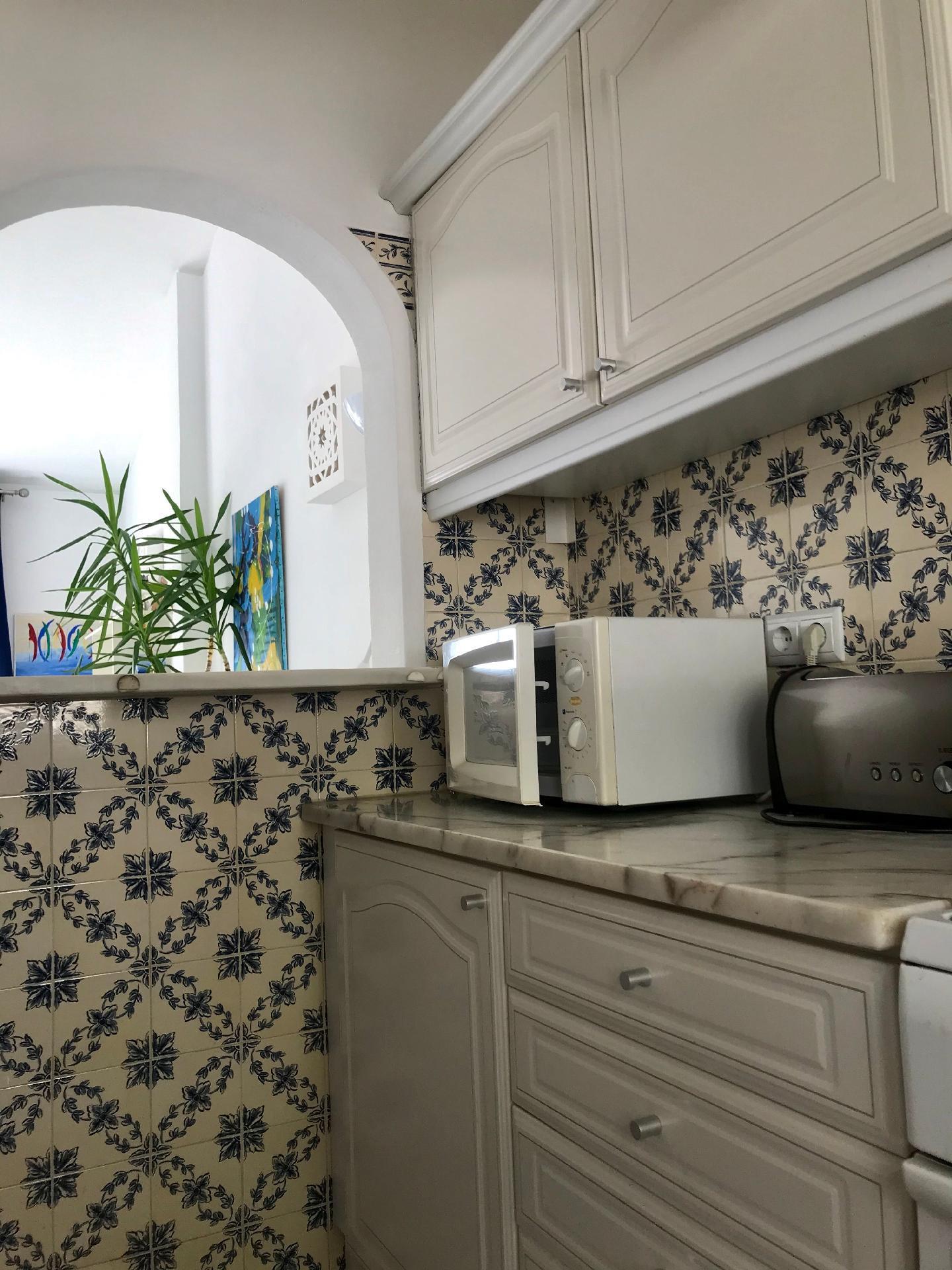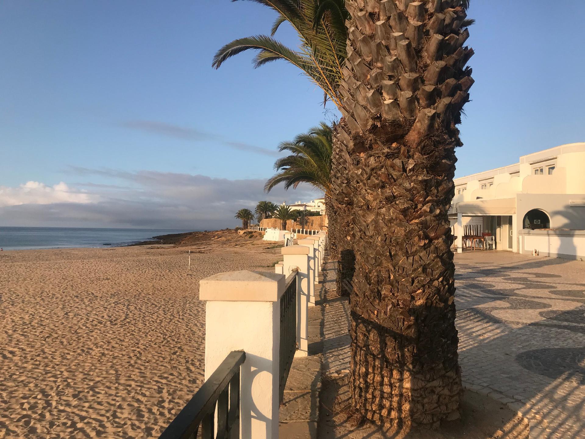 Vorbei an einer schönen Palme im Vorgarten gelangen Sie über eine Treppe direkt in das Obergeschoss des Ferienhauses. Hier befinden sich eine Diele, die Küche, das große Wohn-/Esszimmer sowie der Balkon. Die Küche verfügt über einen großen Kühl- und Gefrierschrank, einen Gasherd und -ofen, eine Mikrowelle, einen Toaster, einen Wasserkocher, eine Kaffeemaschine und einen elektrischen Entsafter. Selbstverständlich gibt es ausreichend Gläser, Geschirr und Besteck, Töpfe und Pfannen und sonstiges Zubehör. Auch die Waschmaschine befindet sich dort, die Sie gerne nutzen dürfen. Speisen und Getränke können einfach über eine Durchreiche von der Küche in den Essbereich gegeben werden. Dort steht ein Esstisch aus Holz mit einer Glasplatte und vier Stühlen. Im Wohnbereich finden Sie eine Couch mit zwei kleineren Tischen und zwei bequemen Hockern. Ein Flachbild-Fernseher mit Satelliten-Receiver und Kabelanschluss bietet Ihnen deutsche, englischsprachige und portugiesische Programme. Vom Wohn-/Esszimmer aus gelangen Sie auf den Balkon. Eine Innentreppe führt Sie vom Wohn-/Essbereich in das Erdgeschoss. Hier befinden sich die beiden Schlafzimmer: das erste mit einem bequemen Doppelbett (ca. 1,8x2m, Premiummatratze), das zweite mit zwei Einzelbetten (jeweils ca. 1x2m, Premiummatratzen), die bei Bedarf auch zusammengeschoben werden können. Vom ersten Schlafzimmer aus gelangen Sie zum kleinen Innenhof. Vom zweiten Schlafzimmer führt die Tür hinaus auf die Terrasse. Das Badezimmer im Haus wurde im Jahr 2020 komplett erneuert. Das modern geflieste Bad verfügt über eine bodenebene Walk-in-Dusche mit großem Duschkopf oben und einer zusätzlichen Handbrause an der Seite, eine Toilette und ein Waschbecken sowie einen großen Spiegel mit integriertem Licht. Sowohl das Wohn-/Esszimmer, als auch die beiden Schlafzimmer verfügen über Heizkörper. Für die Sommermonate steht ein mobiler Ventilator bereit.