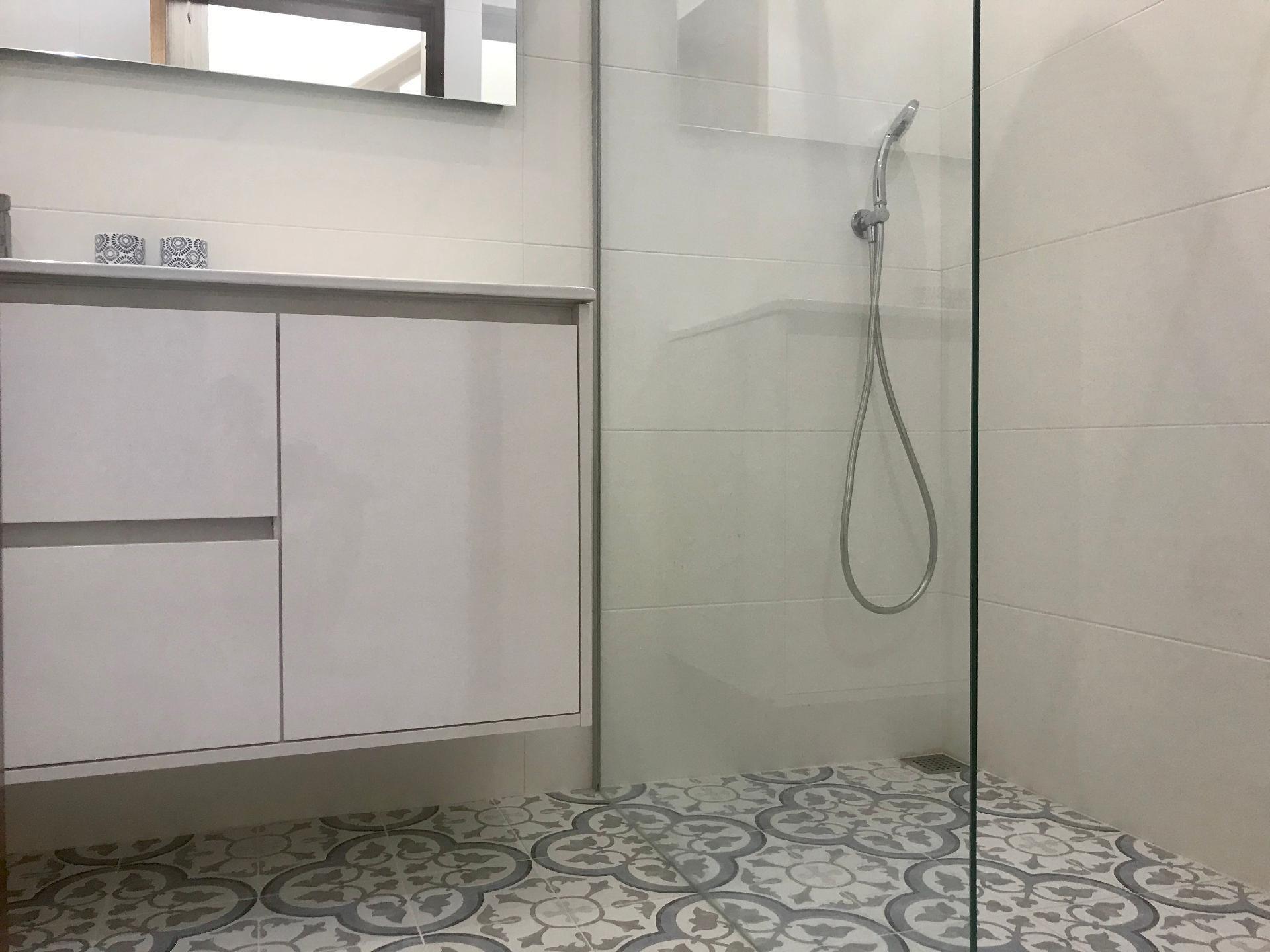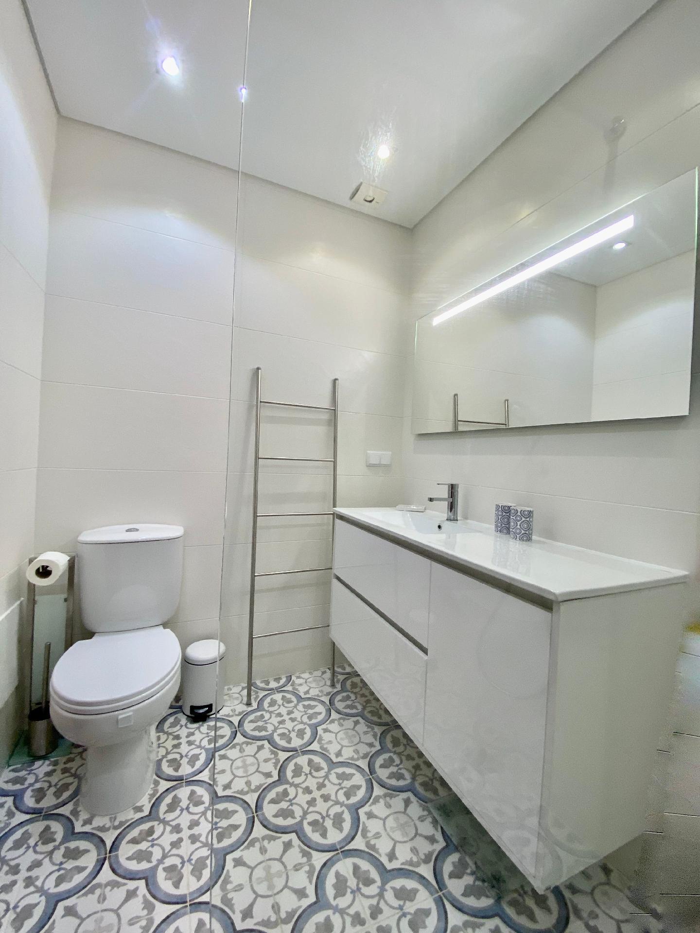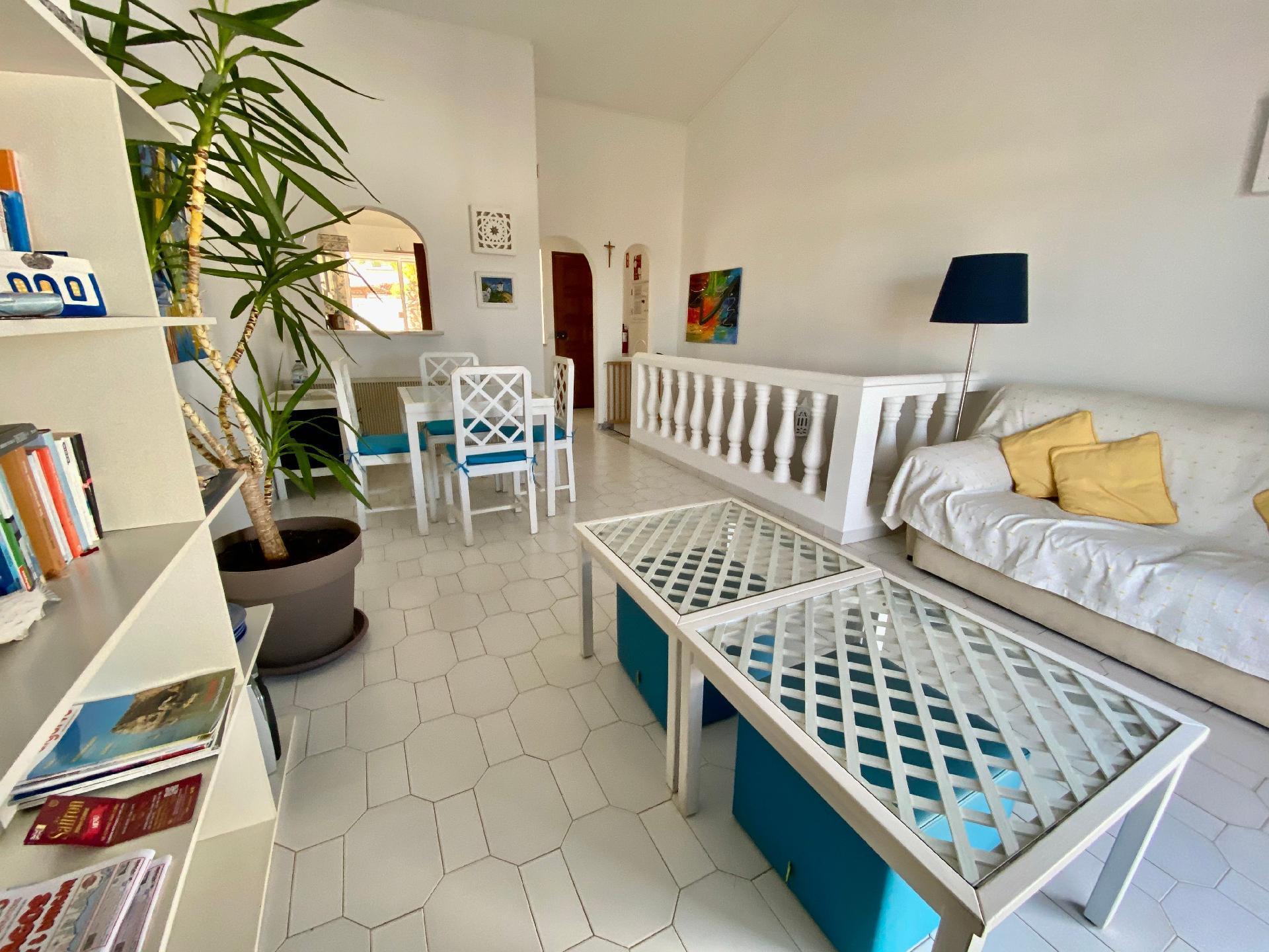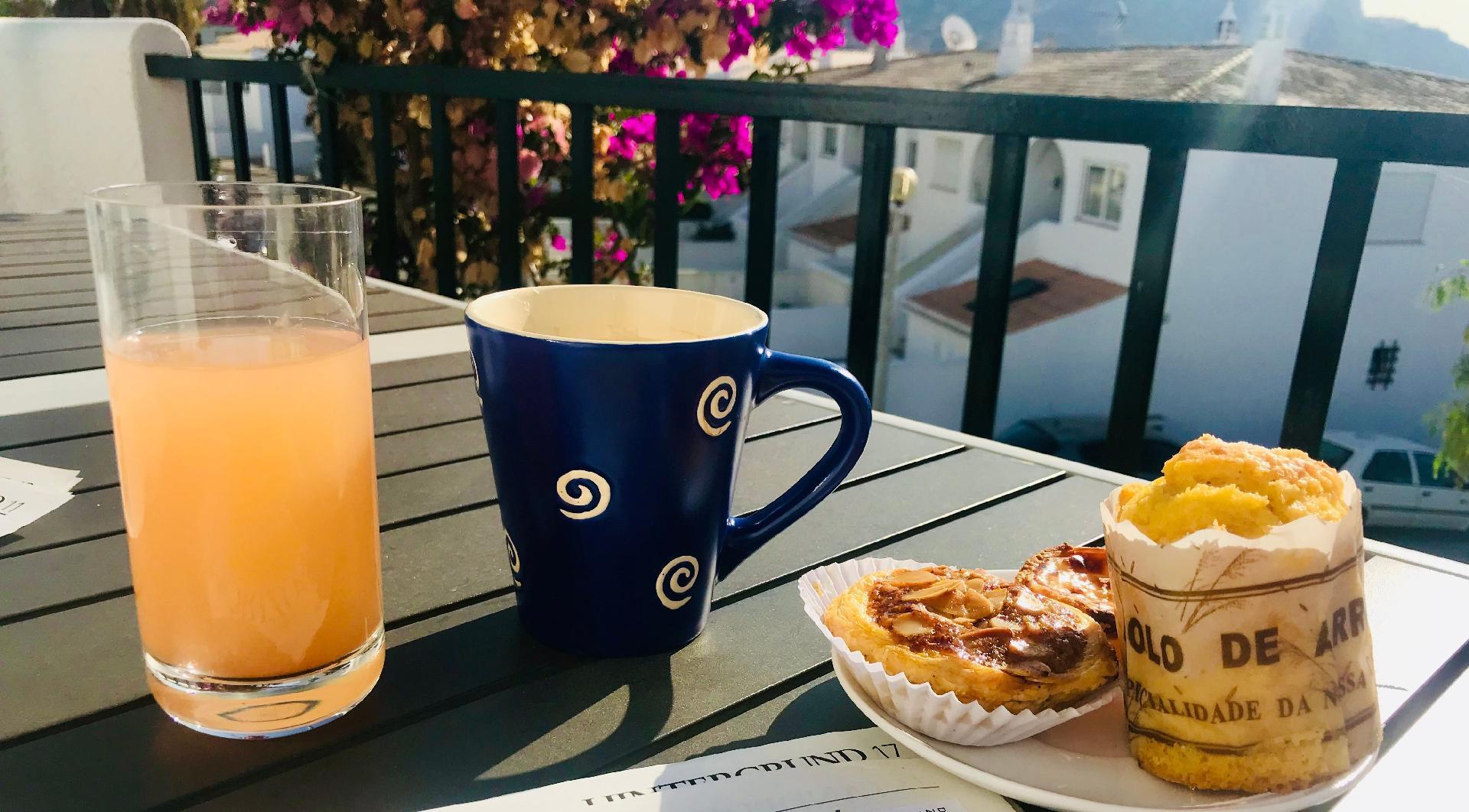 Vorbei an einer schönen Palme im Vorgarten gelangen Sie über eine Treppe direkt in das Obergeschoss des Ferienhauses. Hier befinden sich eine Diele, die Küche, das große Wohn-/Esszimmer sowie der Balkon. Die Küche verfügt über einen großen Kühl- und Gefrierschrank, einen Gasherd und -ofen, eine Mikrowelle, einen Toaster, einen Wasserkocher, eine Kaffeemaschine und einen elektrischen Entsafter. Selbstverständlich gibt es ausreichend Gläser, Geschirr und Besteck, Töpfe und Pfannen und sonstiges Zubehör. Auch die Waschmaschine befindet sich dort, die Sie gerne nutzen dürfen. Speisen und Getränke können einfach über eine Durchreiche von der Küche in den Essbereich gegeben werden. Dort steht ein Esstisch aus Holz mit einer Glasplatte und vier Stühlen. Im Wohnbereich finden Sie eine Couch mit zwei kleineren Tischen und zwei bequemen Hockern. Ein Flachbild-Fernseher mit Satelliten-Receiver und Kabelanschluss bietet Ihnen deutsche, englischsprachige und portugiesische Programme. Vom Wohn-/Esszimmer aus gelangen Sie auf den Balkon. Eine Innentreppe führt Sie vom Wohn-/Essbereich in das Erdgeschoss. Hier befinden sich die beiden Schlafzimmer: das erste mit einem bequemen Doppelbett (ca. 1,8x2m, Premiummatratze), das zweite mit zwei Einzelbetten (jeweils ca. 1x2m, Premiummatratzen), die bei Bedarf auch zusammengeschoben werden können. Vom ersten Schlafzimmer aus gelangen Sie zum kleinen Innenhof. Vom zweiten Schlafzimmer führt die Tür hinaus auf die Terrasse. Das Badezimmer im Haus wurde im Jahr 2020 komplett erneuert. Das modern geflieste Bad verfügt über eine bodenebene Walk-in-Dusche mit großem Duschkopf oben und einer zusätzlichen Handbrause an der Seite, eine Toilette und ein Waschbecken sowie einen großen Spiegel mit integriertem Licht. Sowohl das Wohn-/Esszimmer, als auch die beiden Schlafzimmer verfügen über Heizkörper. Für die Sommermonate steht ein mobiler Ventilator bereit.