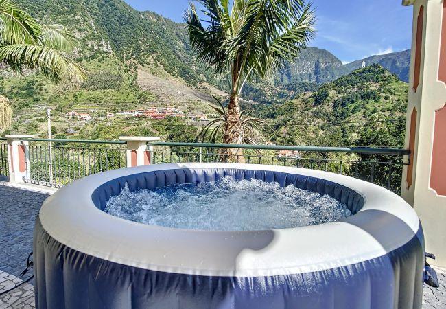 Mountain View Villa, ein Ferienhaus in São Vicente mit spektakulärem Blick auf die Berge der Insel Madeira. Mit Platz für 7 Personen verfügt das Haus über 3 Schlafzimmer, von denen 2 ein Doppelbett und das andere ein Einzelbett haben. Darüber hinaus verfügt das Haus über 2 Badezimmer, eins mit Dusche und eins mit Badewanne.