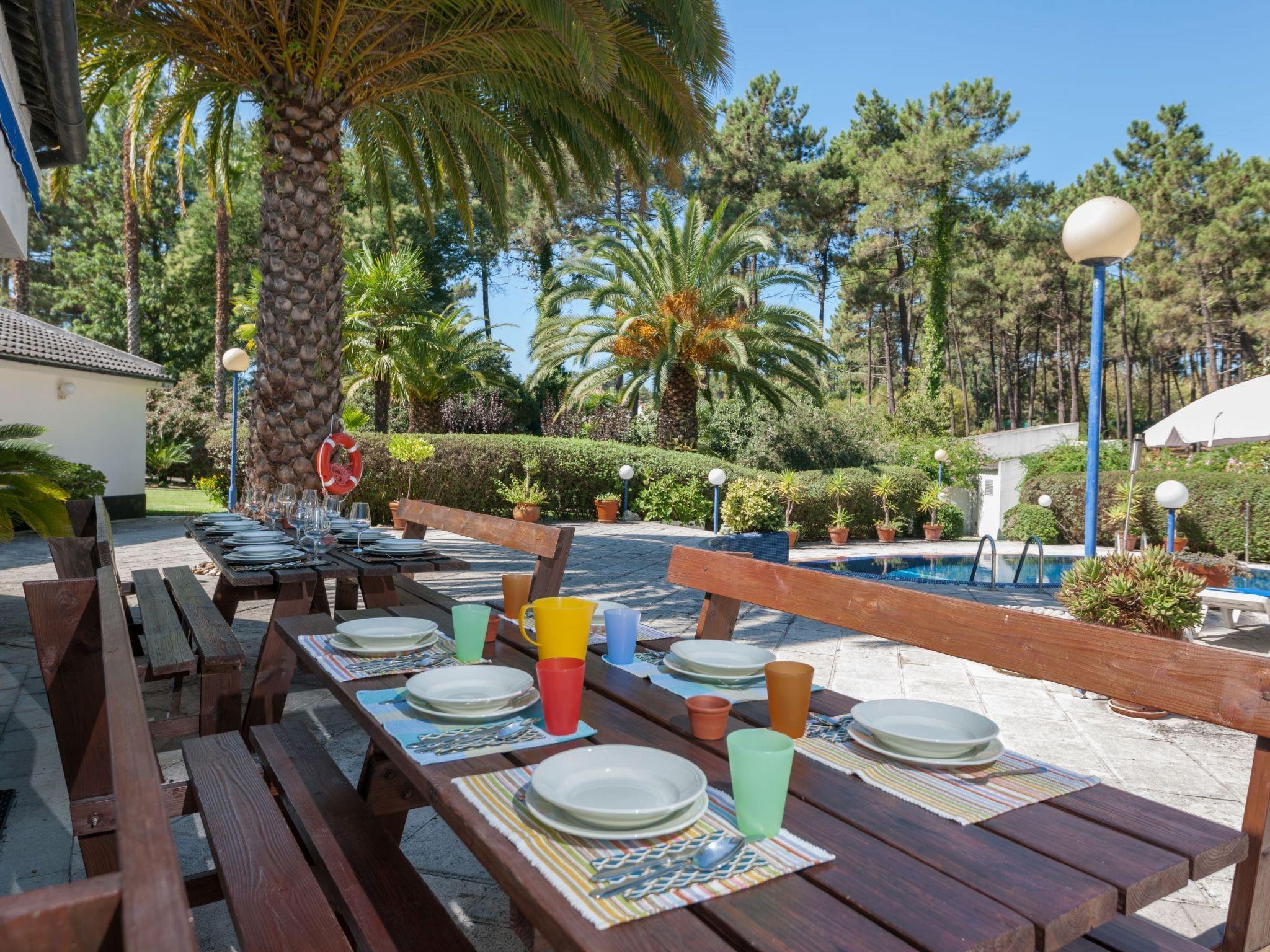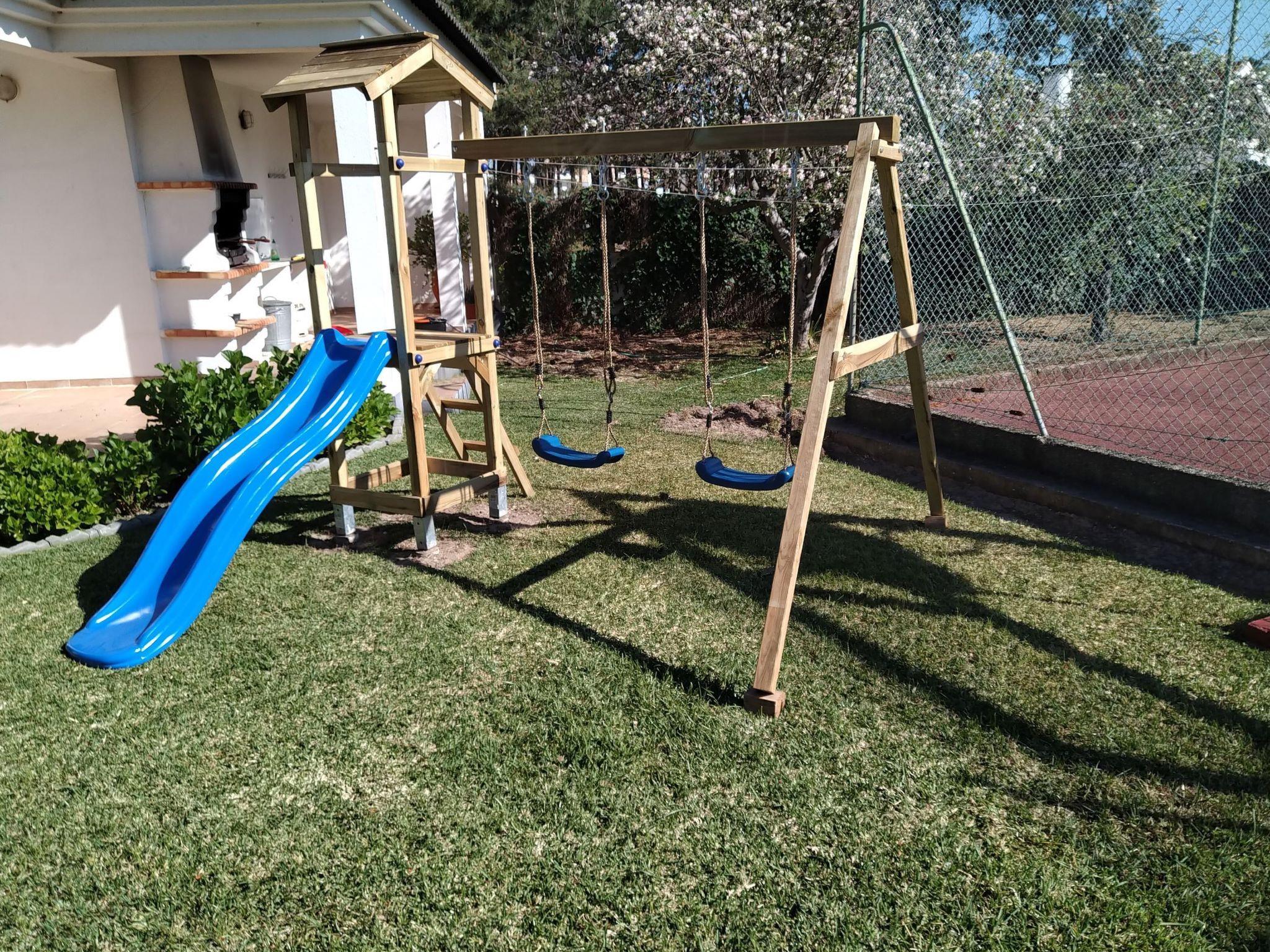Es gibt einen großen Garten, einen großen Swimmingpool, einen Tennisplatz, eine Tischtennisplatte, einen Spielplatz und einen Parkplatz im Haus, alles privat.