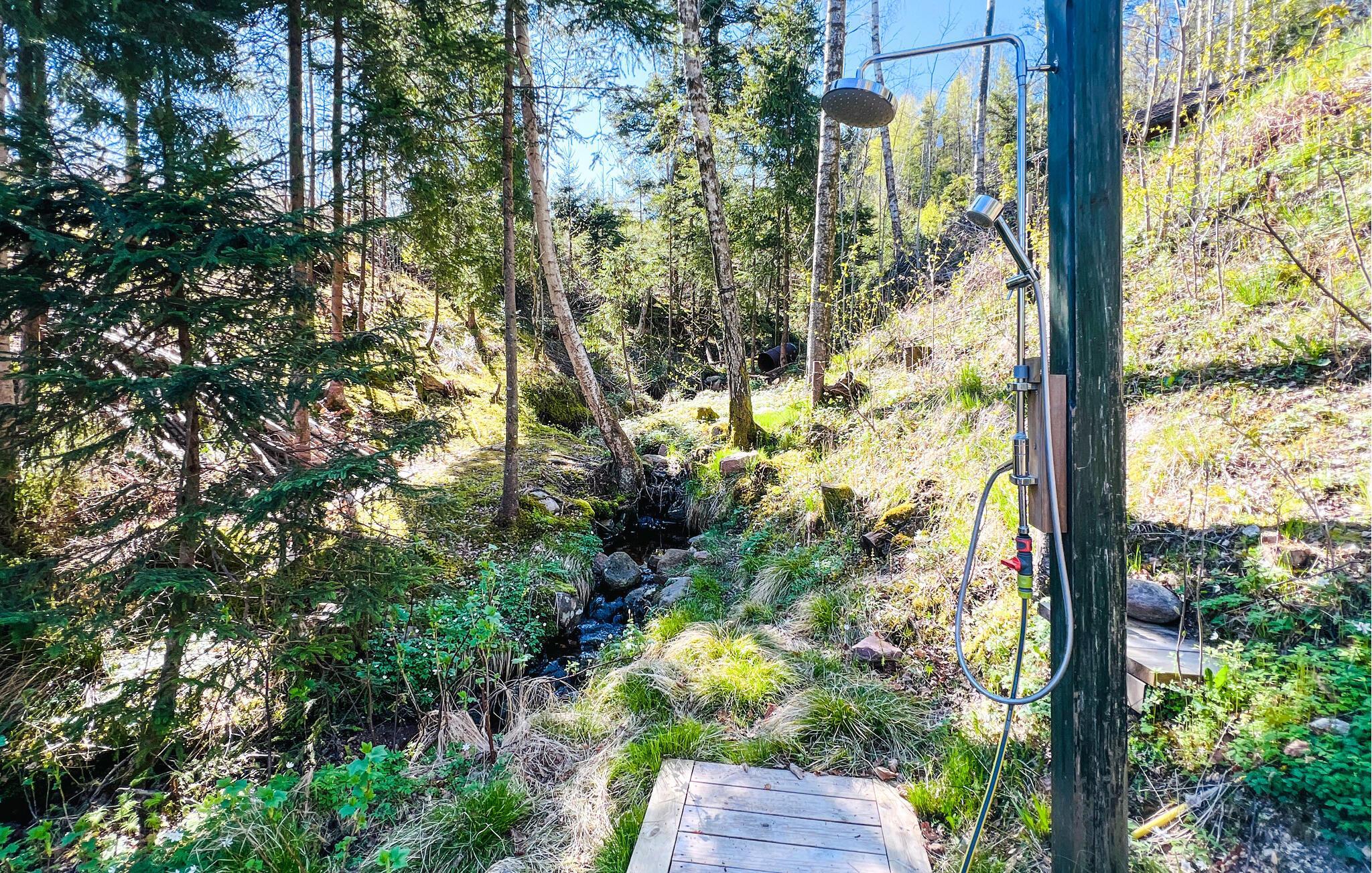 Servieren Sie sich ein Frühstück auf der erhöhten Veranda und lassen Sie den Blick über die ruhige Landschaft schweifen. Erfrischen Sie sich unter der Außendusche und lauschen Sie bei stimmungsvollen Grillabenden dem leisen Plätschern des Baches, der durch das Grundstück fließt.
