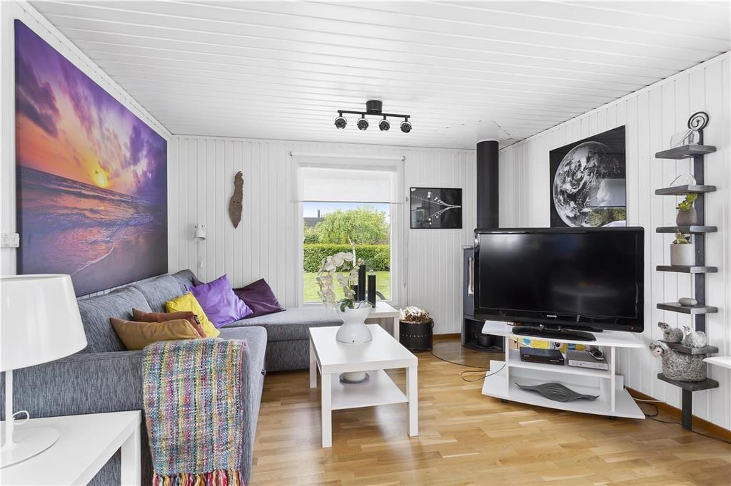 Dieses attraktive, moderne Ferienhaus hat eine Wohnfläche von etwa 90 m², das man von der Stirnseite aus betritt. Von dem sich anschließenden, in der Hausmitte liegenden Flur zweigen linker Hand zunächst zwei Schlafzimmer ab, die beide mit einem Etagenbett möbliert sind. Rechter Hand befinden sich das Elternschlafzimmer mit zwei Einzelbetten sowie ein Duschbad mit WC und Waschmaschine. Danach mündet der Flur in einen hellen, freundlichen Wohnbereich, in den auch eine moderne Küche integriert wurde. Diese ist mit Elektroherd mit Ceranfeld und Backofen, Kühlschrank mit Gefrierfach sowie Geschirrspüler und Mikrowelle ausgestattet. Zum Wohnbereich hin schließt sich der Küche zunächst ein großer Esstisch an, hinter dem ein gemütliches Ecksofa, dem modernen Flatscreen mit SAT-TV gegenüber, Platz gefunden hat. In einer zur integrierten Terrasse hinaus gebauten, seitlichen Ecke des Zimmers befindet sich ein Kaminofen sowie ein Sofa, das auch zum Schlafen genutzt werden kann. Der zwischen Schlaftrakt und Wohnbereich liegende Terrassenteil ist überdacht, mit Wärmestrahlern ausgestattet und mit sehr guten Gartenmöbeln möbliert. Außerdem stehen den Gästen Sonnenliegen sowie ein Grillgerät zur Verfügung; Boote können im nahen Köpingsvik angemietet werden.