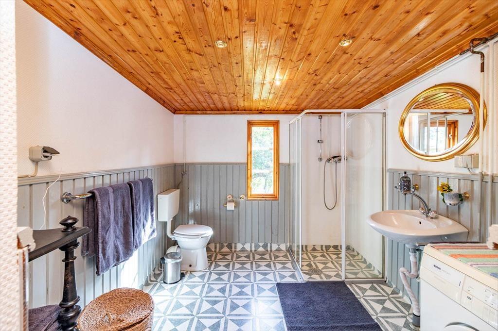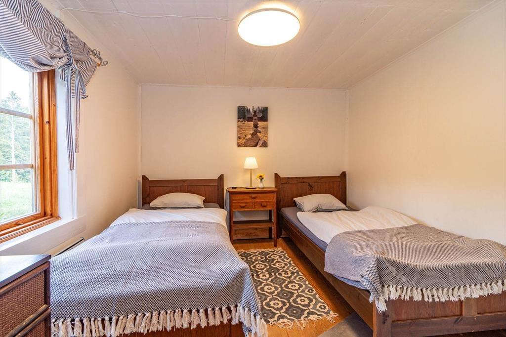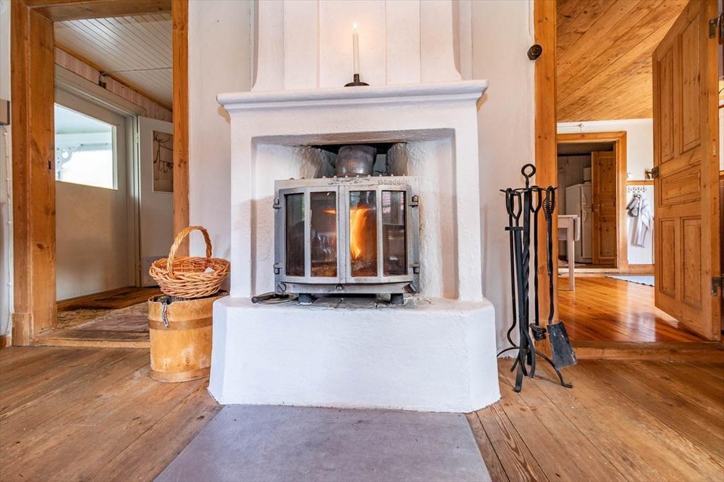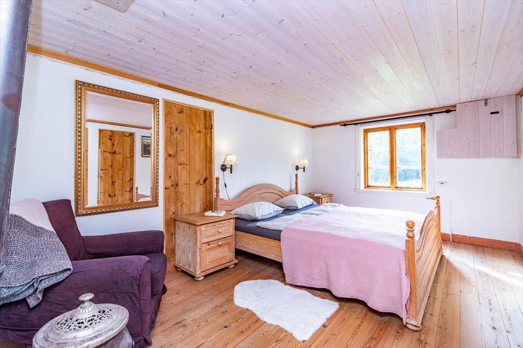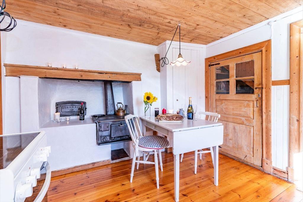 Auf 75 m² bietet das Haus Platz für 4 Erwachsene und auf Nachfrage hin auch gerne ein Kleinkind von höchstens 2 Jahren. Auch zwei Haustiere sind willkommen. Du betrittst das Haus über die mit wunderschönen Holzornamenten verzierte Veranda mit Gartenmöbeln und befindest dich in einem Eingangsbereich. Linker Hand von diesem liegt das erste der beiden Schlafzimmer mit zwei Einzelbetten. Rechts vom Eingangsbereich liegt das geräumige Wohnzimmer mit einem großen Esstisch und zwei bequemen Sofas, auf denen du dich vor dem Smart-TV mit deutschen Programmen oder dem prasselnden Kaminofen entspannen kannst. Links am Kaminofen vorbei geht es weiter in die urgemütliche Küche, in der sich sogar noch ein historischer Ofen befindet. Heute steht dir natürlich neben einem modernen Ofen, Herd, Kühlschrank, Gefrierfach, Tischspülmaschine, Kaffeemaschine und Wasserkocher alles zur Verfügung, was du zum Zubereiten und Servieren gängiger Gerichte für 4 Personen benötigst. Von der Küche aus führt eine weitere Eingangstür hinaus in den Garten. Über ein paar Treppenstufen erreichen Sie die Holzterrasse mit Tisch, Stühlen und Grill, auf der du bei schönem Wetter Ihre Mahlzeiten genießen oder den Tag ausklingen lassen kannst. Nach der Küche schließt sich linker Hand das Badezimmer mit WC, Dusche und Waschmaschine an. Gegenüber vom Badezimmer führt eine Treppe ins Obergeschoss, wo sich das zweite Schlafzimmer befindet, das mit einem Doppelbett eingerichtet ist. Ein Babybett und ein Kinderhochstuhl sind ebenfalls vorhanden.
