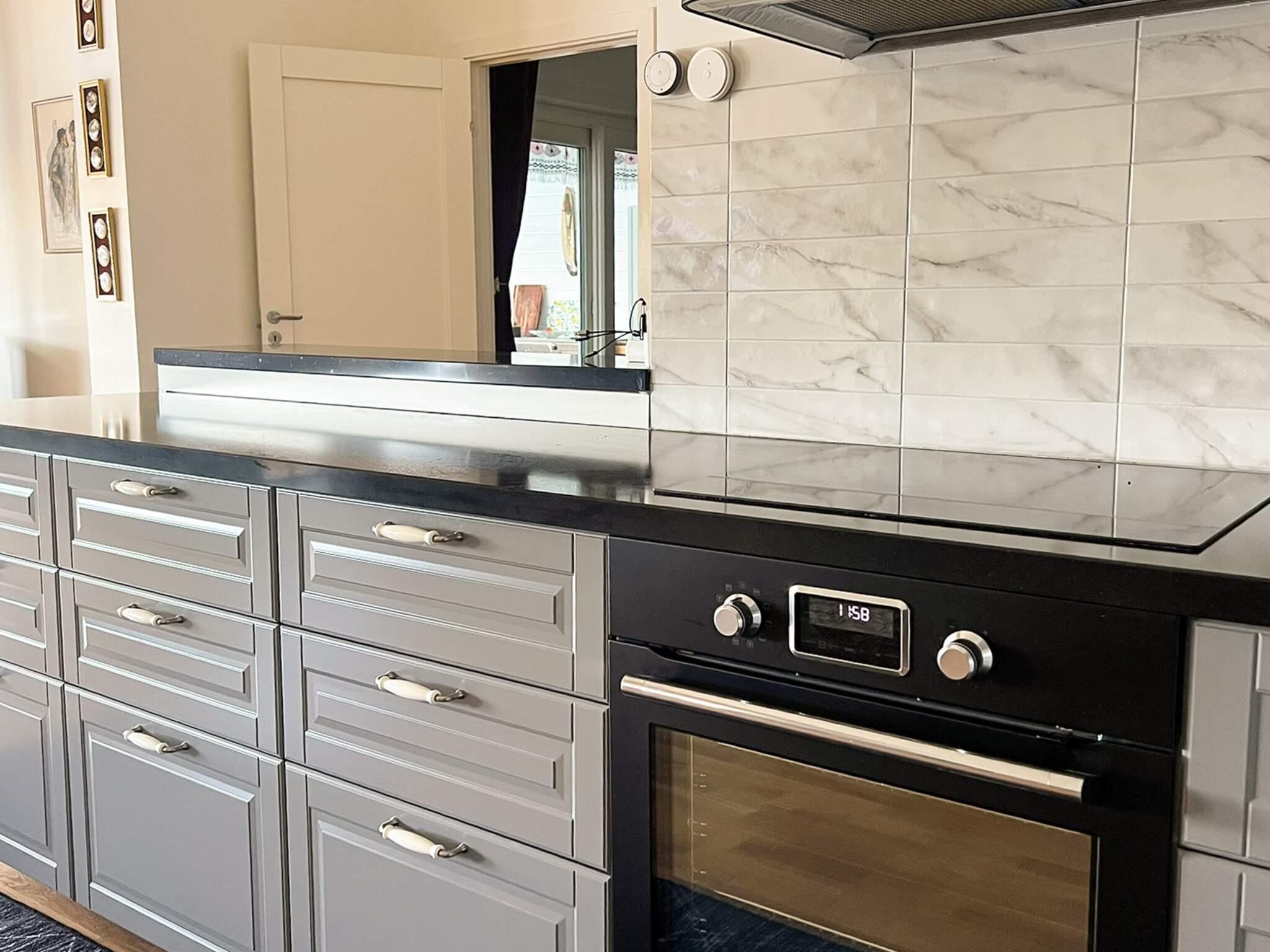 Küche: E-Herd, Mikrow., Abzugsh., Kaffeem., Spülm.
