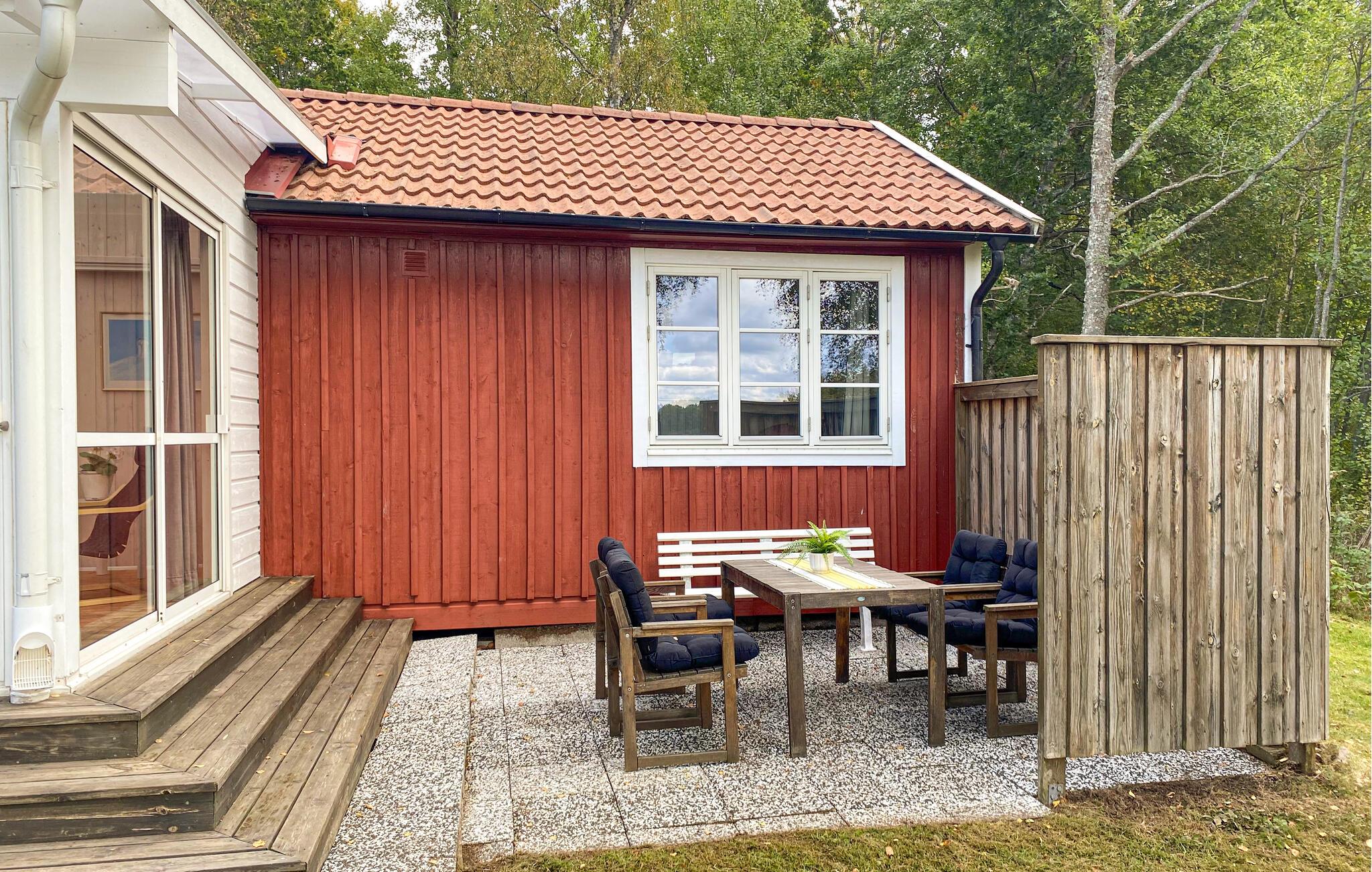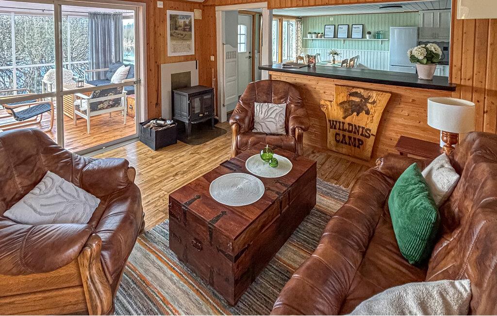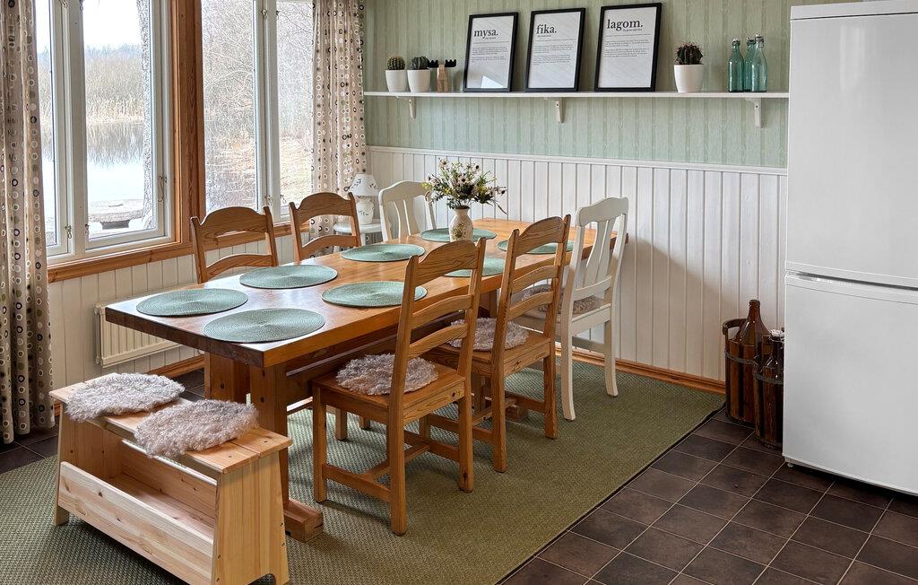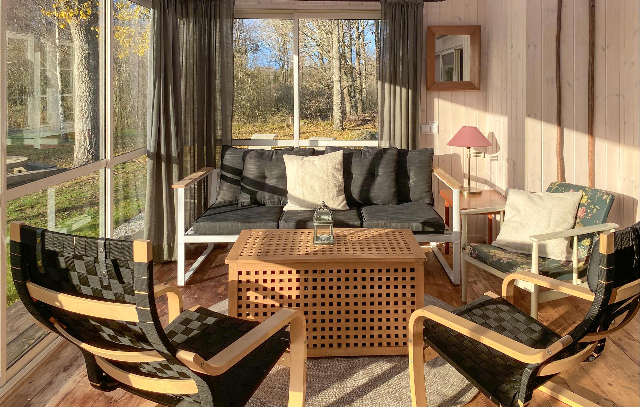 Ihr Ferienhaus liegt inmitten einer grünen Oase am See Kyrksjön und ist der ideale Ort, um dem Alltag zu entfliehen. Im Inneren erwartet Sie ein warmes, gemütliches Ambiente mit viel Holz und liebevollen Details. Entspannen Sie im einladenden Wohnzimmer mit bequemen Sesseln und Kaminofen, der an kühlen Abenden für eine behagliche Atmosphäre sorgt. In der großen, hellen Küche mit angrenzendem Essbereich finden Sie alles, was Sie für gemeinsame Mahlzeiten benötigen. Der Wintergarten mit seinen großen Fenstern bietet einen wunderbaren Blick ins Grüne und lädt zu entspannten Stunden bei jeder Wetterlage ein.