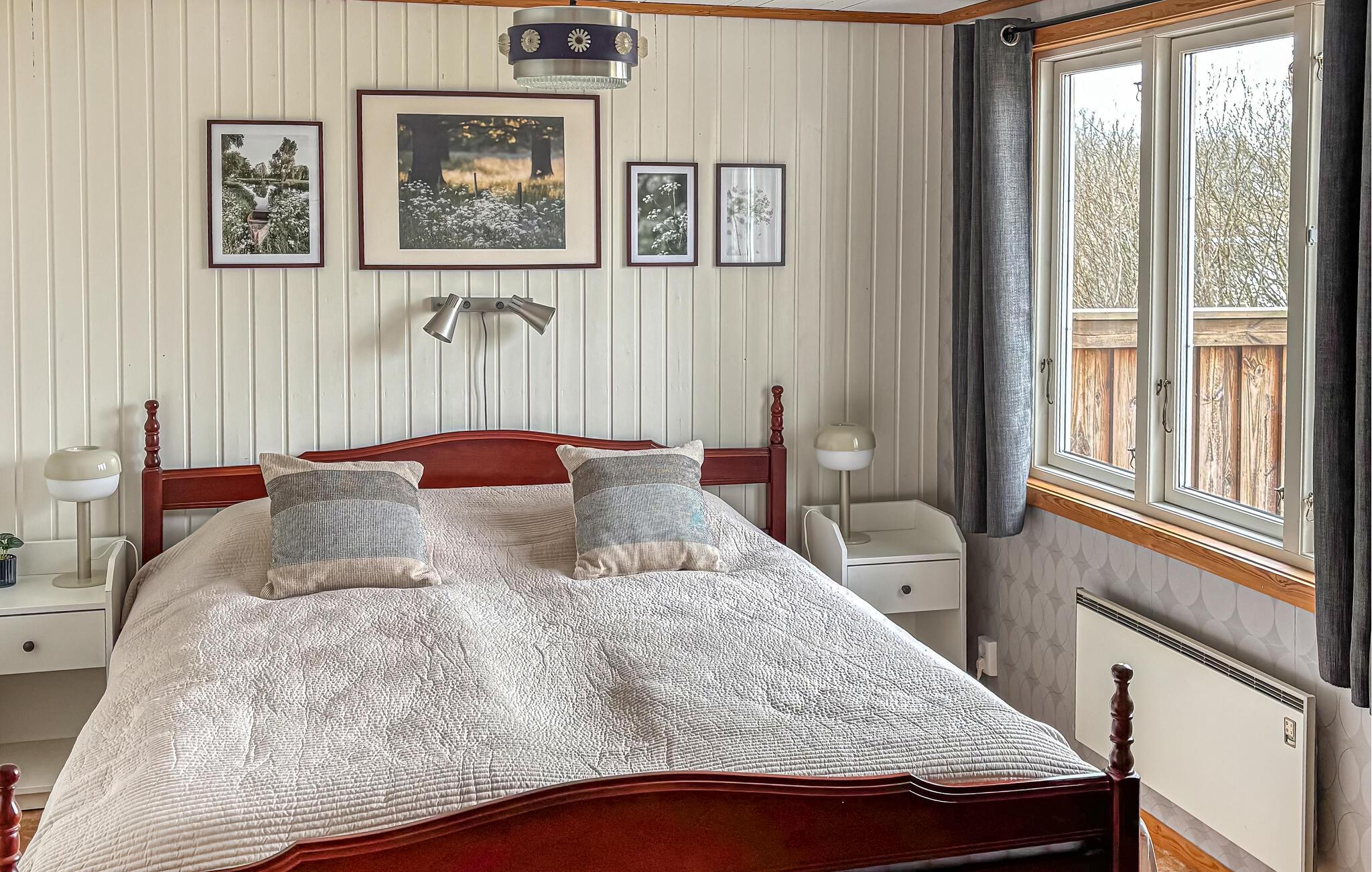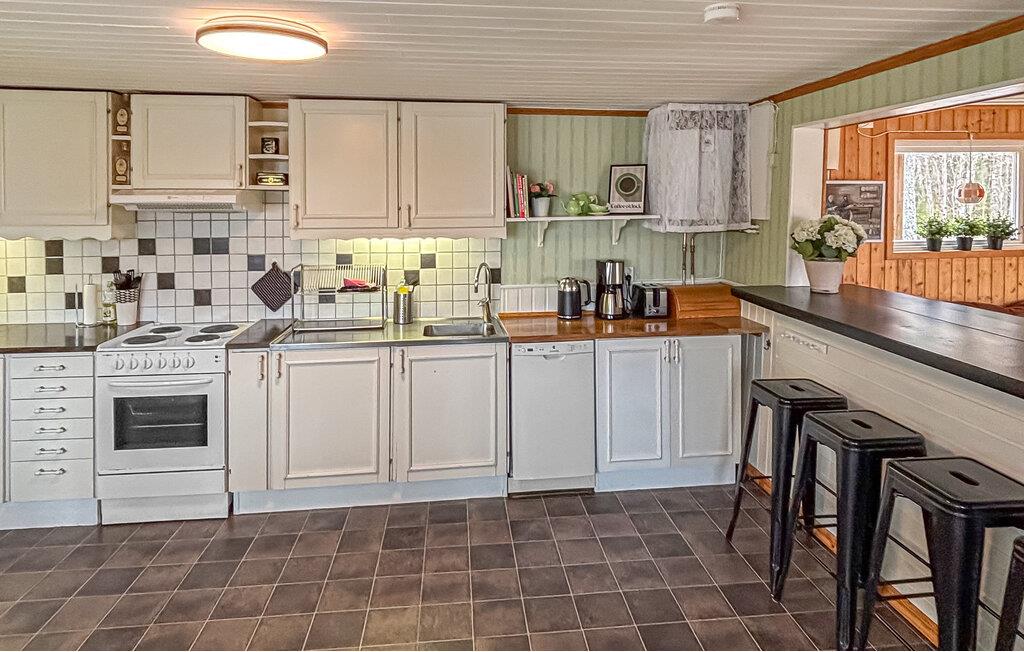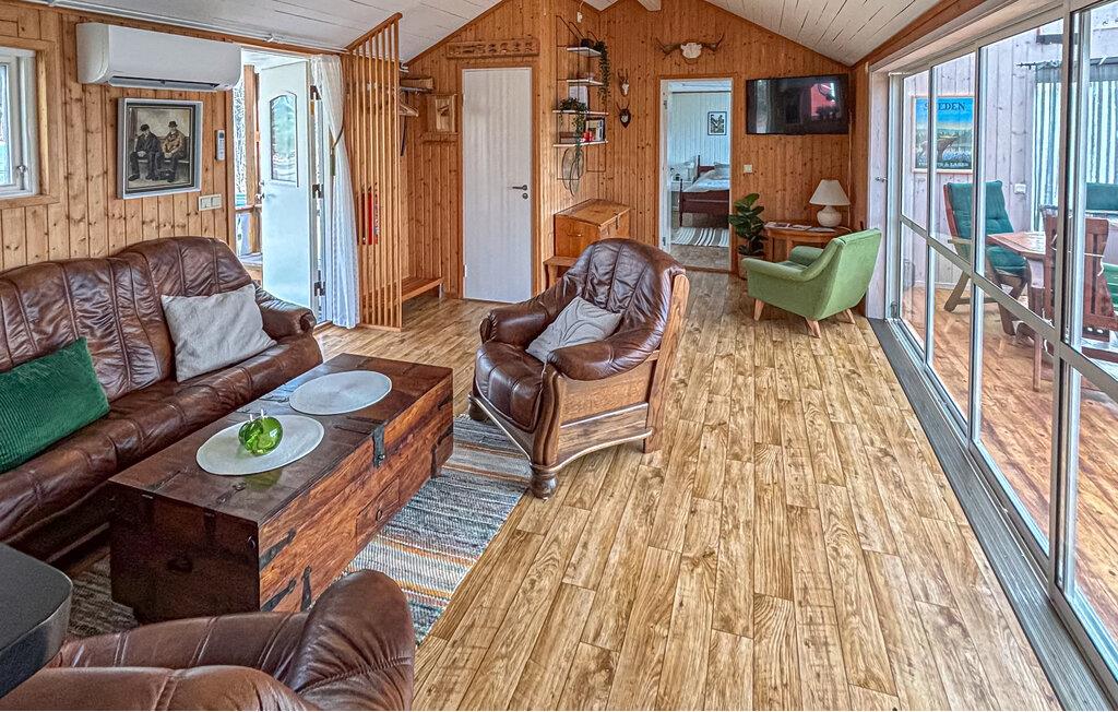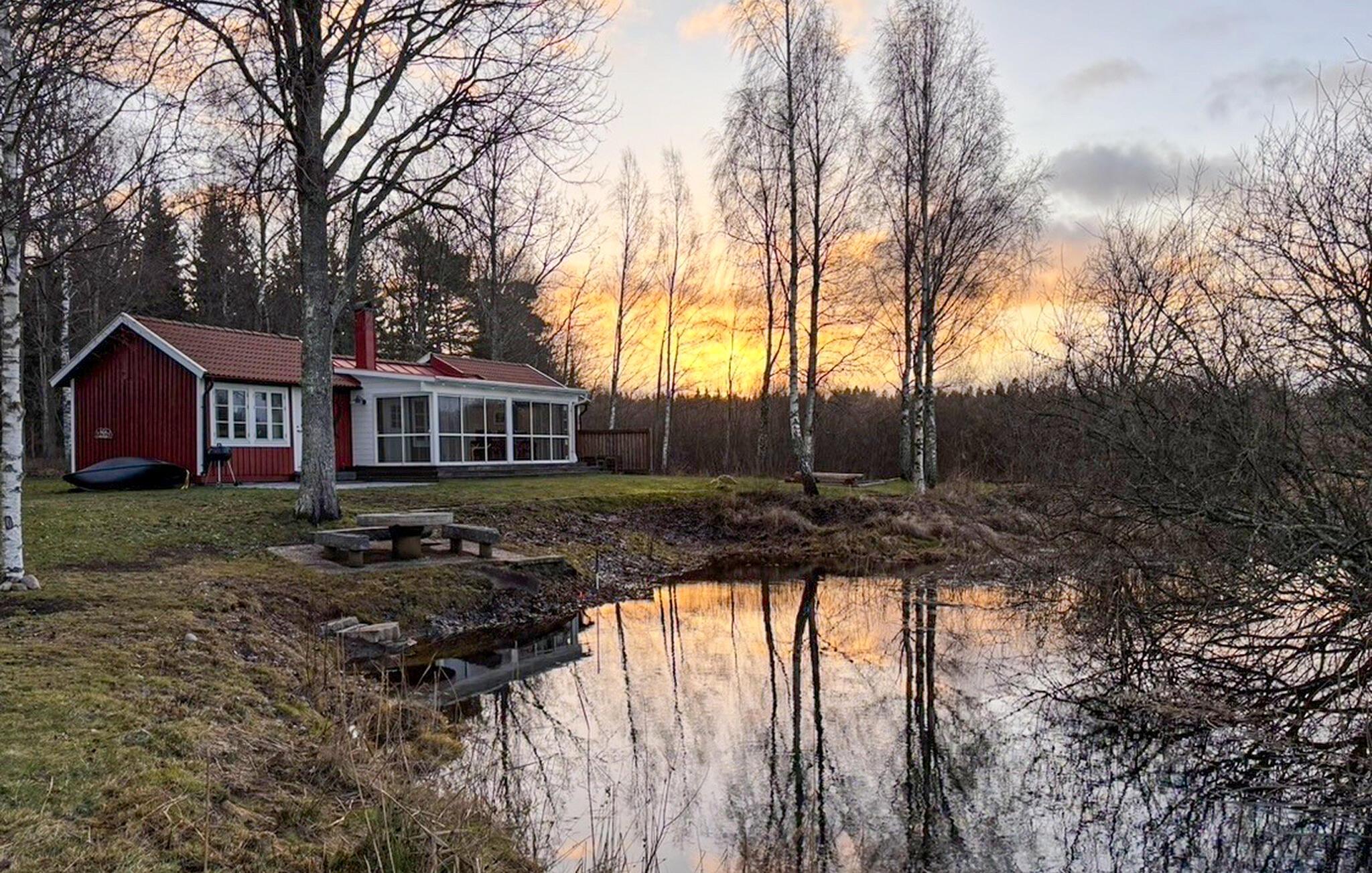 Ihr Ferienhaus liegt inmitten einer grünen Oase am See Kyrksjön und ist der ideale Ort, um dem Alltag zu entfliehen. Im Inneren erwartet Sie ein warmes, gemütliches Ambiente mit viel Holz und liebevollen Details. Entspannen Sie im einladenden Wohnzimmer mit bequemen Sesseln und Kaminofen, der an kühlen Abenden für eine behagliche Atmosphäre sorgt. In der großen, hellen Küche mit angrenzendem Essbereich finden Sie alles, was Sie für gemeinsame Mahlzeiten benötigen. Der Wintergarten mit seinen großen Fenstern bietet einen wunderbaren Blick ins Grüne und lädt zu entspannten Stunden bei jeder Wetterlage ein.