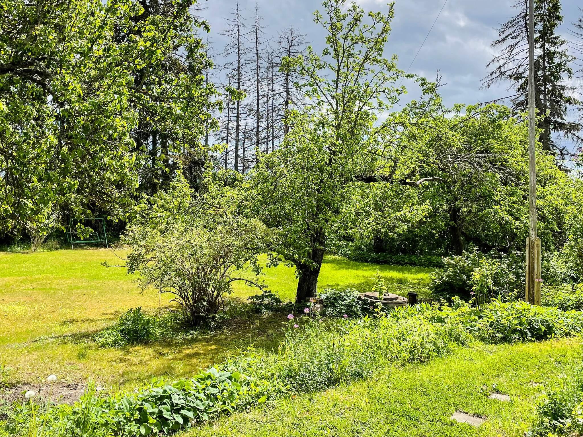 Hier wohnen Sie auf einem großen Naturgrundstück in einem zweistöckigen Haus. Vom Eingang geht es durch einen Flur weiter zur Küche sowie ins Bad und ins Obergeschoss. Die Küche verfügt über eine gute Ausstattung sowie über einen Holzofen, der an kühleren Tagen für angenehme Wärme sorgt. Schöner Esstisch am Fenster. Von der Küche aus gelangt man weiter in ein großes Wohnzimmer mit einem schönen Sofa und Fernseher.