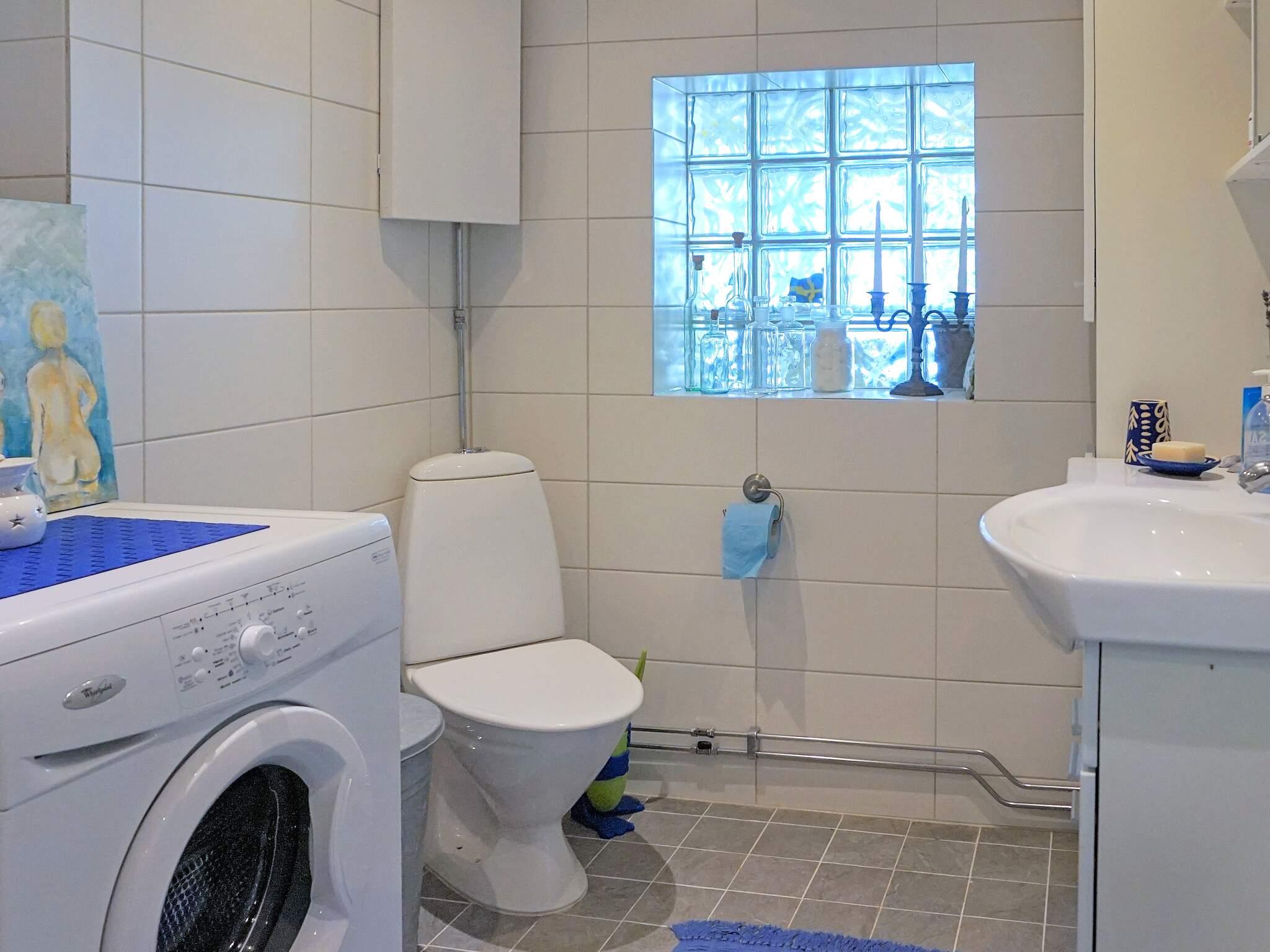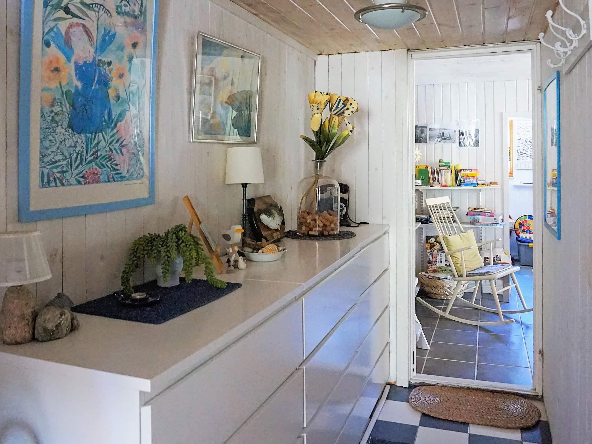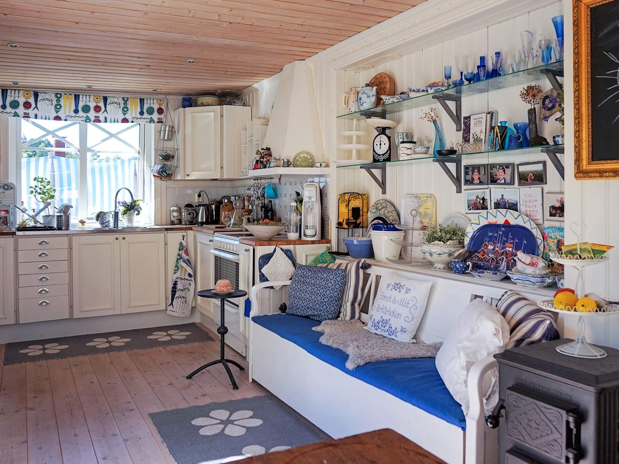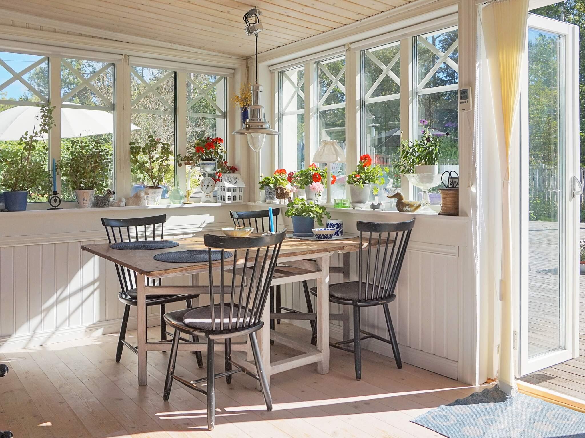 Im seinem Inneren präsentiert sich das Ferienhaus hell und gut gepflegt. Es gibt eine kleine Eingangsdiele mit WC. Links davon liegt die Küche mit Essbereich und schönen Fenstern sowie Terrassentür. Nebenan findet man das geräumige und sehr gemütliche Wohnzimmer, das in drei Bereiche aufgeteilt ist: einen Sitzbereich mit Holzofen für gemütliche Abende, einen Lesebereich, in den man sich zurückziehen kann und eine TV-Ecke (nur schwedische Sender) mit Couch und Sessseln am anderen Ende des Raumes. Außerdem gibt es eine schön verglaste Veranda mit weitere Sitzgelegenheiten. Öffnen Sie dort an einem sonnigen Morgen die Türen weit und lauschen Sie dem Zwitschern der Vögel! Hier ist wirklich Platz für alle.
