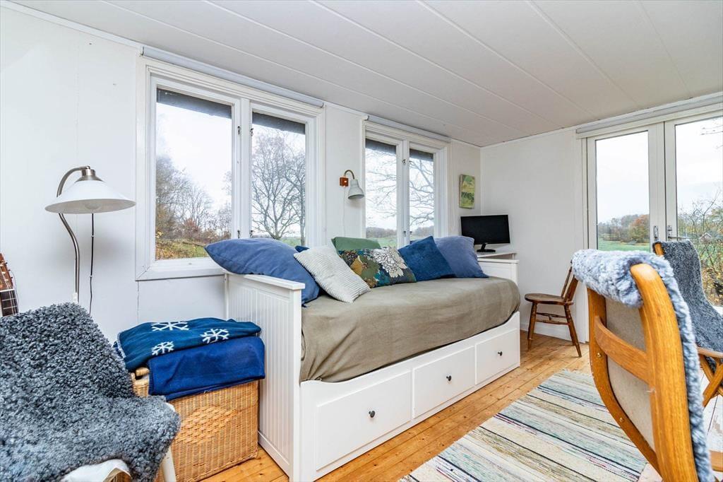 Die Wohnfläche beträgt 48 m² und das Haus bietet Platz für maximal 4 Personen. Es gibt 3 Schlafgelegenheiten (ein 120 cm breites Bett im Schlafzimmer; zwei ausziehbare Doppelbetten à 160 cm breit, einmal im Ess- und einmal im Wohnbereich). Nach dem Betreten befindest du dich in der Küche, ausgestattet mit einem 4-Platten-Cerankochfeld mit Backofen, Kühlschrank, Gefrierschrank, Mikrowelle und Kaffeemaschine. Es folgen die Ess- und Wohn-/Schlafbereiche mit Esstisch, TV und Kamin; Internet per Mobilrouter ist inklusive. Im Haus gibt es eine kleine Home-Office-Ecke mit Drucker sowie ein Badezimmer mit WC und Dusche; ein Abstellraum mit Waschmaschine ist ebenfalls vorhanden. An kühleren Tagen wärmt dich die Luftwärmepumpe.