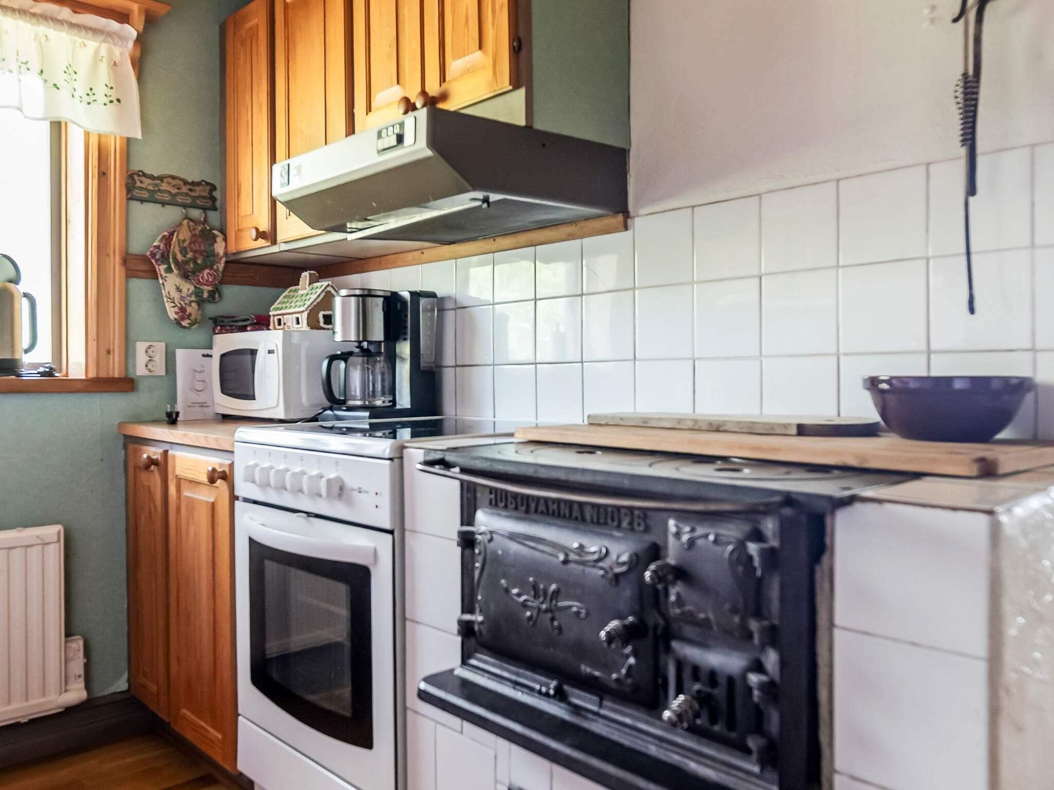 Das alte Blockhaus liegt auf einer Wiese und gehört zu einem Bauernhof, auf dem der Eigentümer im Sommer Kühe hält, die rund um das Haus weiden. Eine wahre Idylle auf dem Lande.