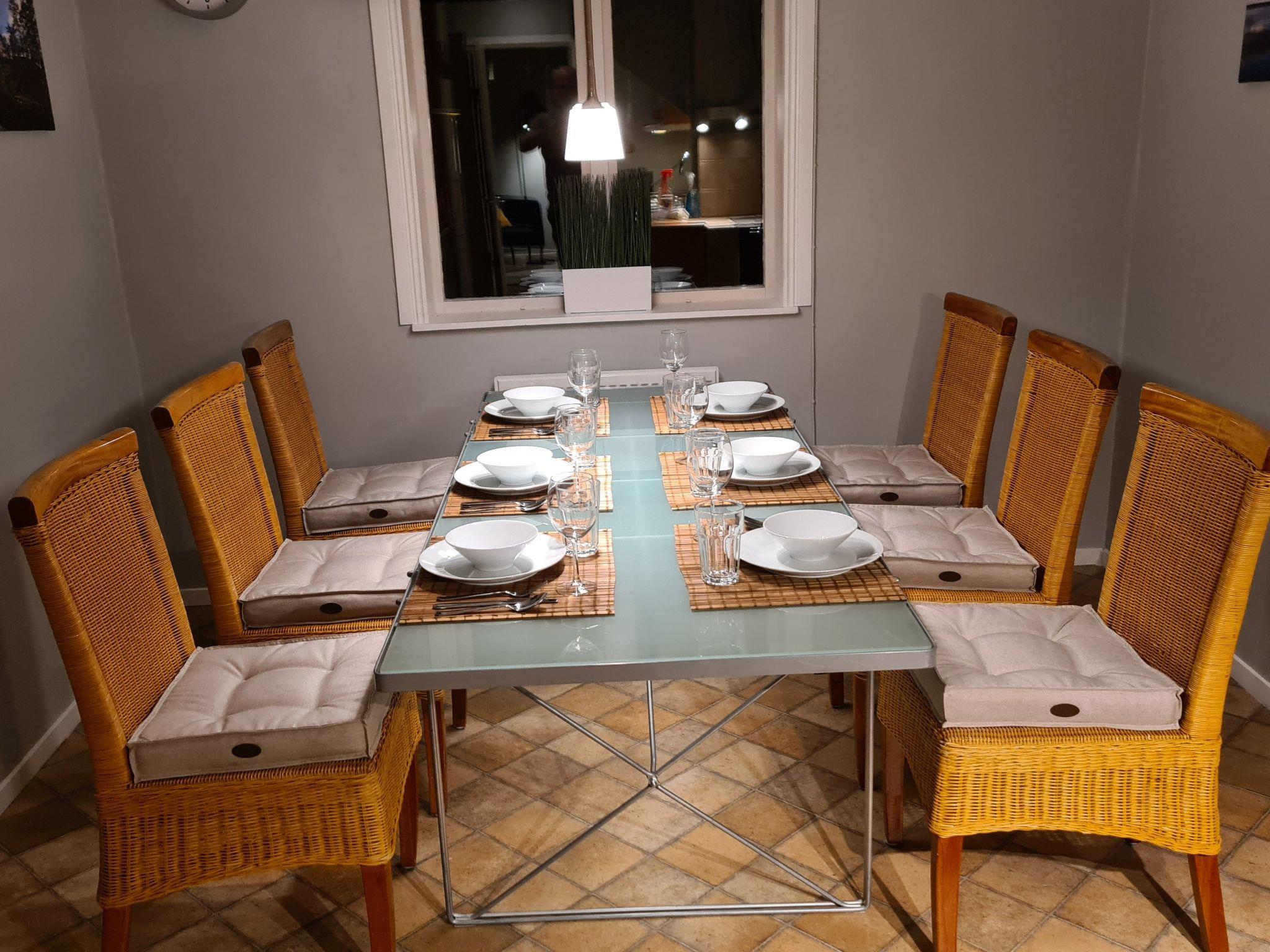 Es gibt einen Wintergarten und eine überdachte Terrasse auf der sich ein Tisch mit 6 Stühlen befindet sowie ein Holzkohlegrill und ein Beistelltisch.