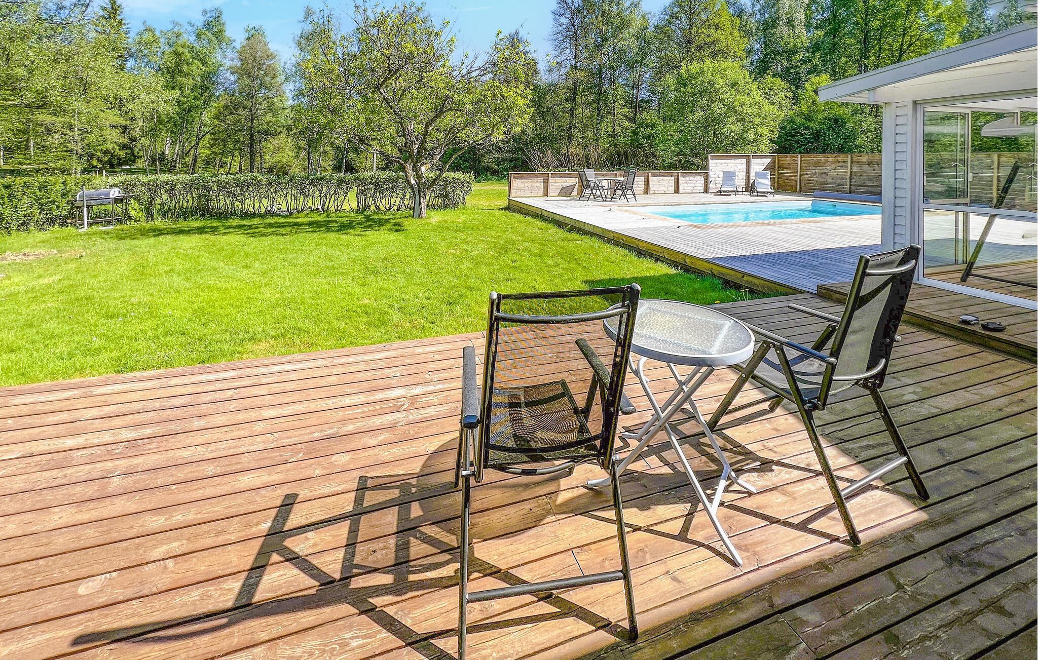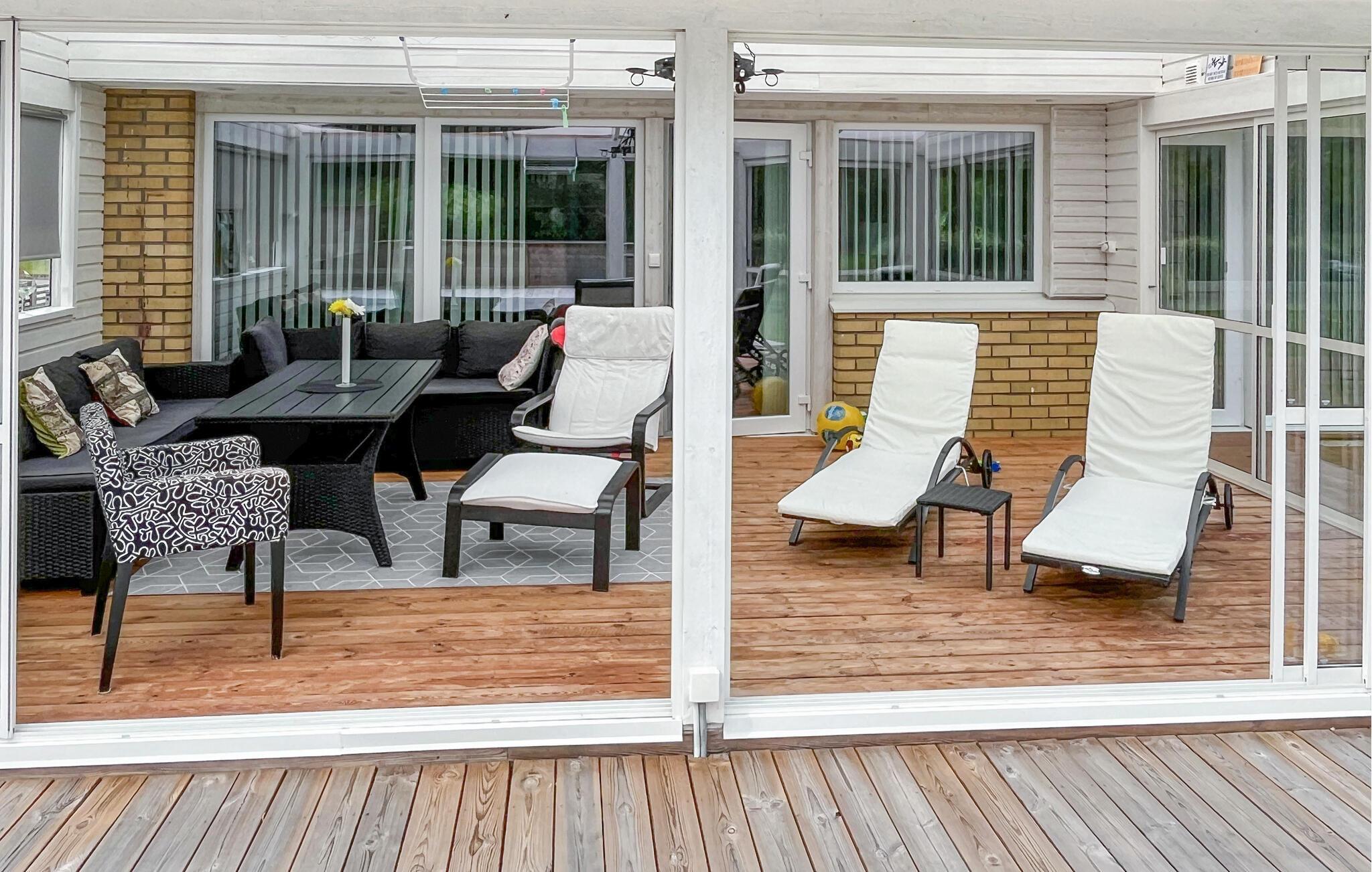 Dieses Ferienhaus bietet Ihnen alles, was Sie für einen komfortablen Aufenthalt benötigen. Beginnen Sie Ihren Tag mit einem gemütlichen Frühstück im Wintergarten und genießen Sie den Blick auf den Außenbereich. Hier sticht insbesondere der schöne Pool hervor. Im Innenbereich verfügt das Haus über einen großzügigen Wohnbereich mit einem gemütlichen Sofa, ideal zum Relaxen und Verweilen. Die offene Raumgestaltung und die großen Fenster sorgen für viel Licht und eine angenehme Atmosphäre.