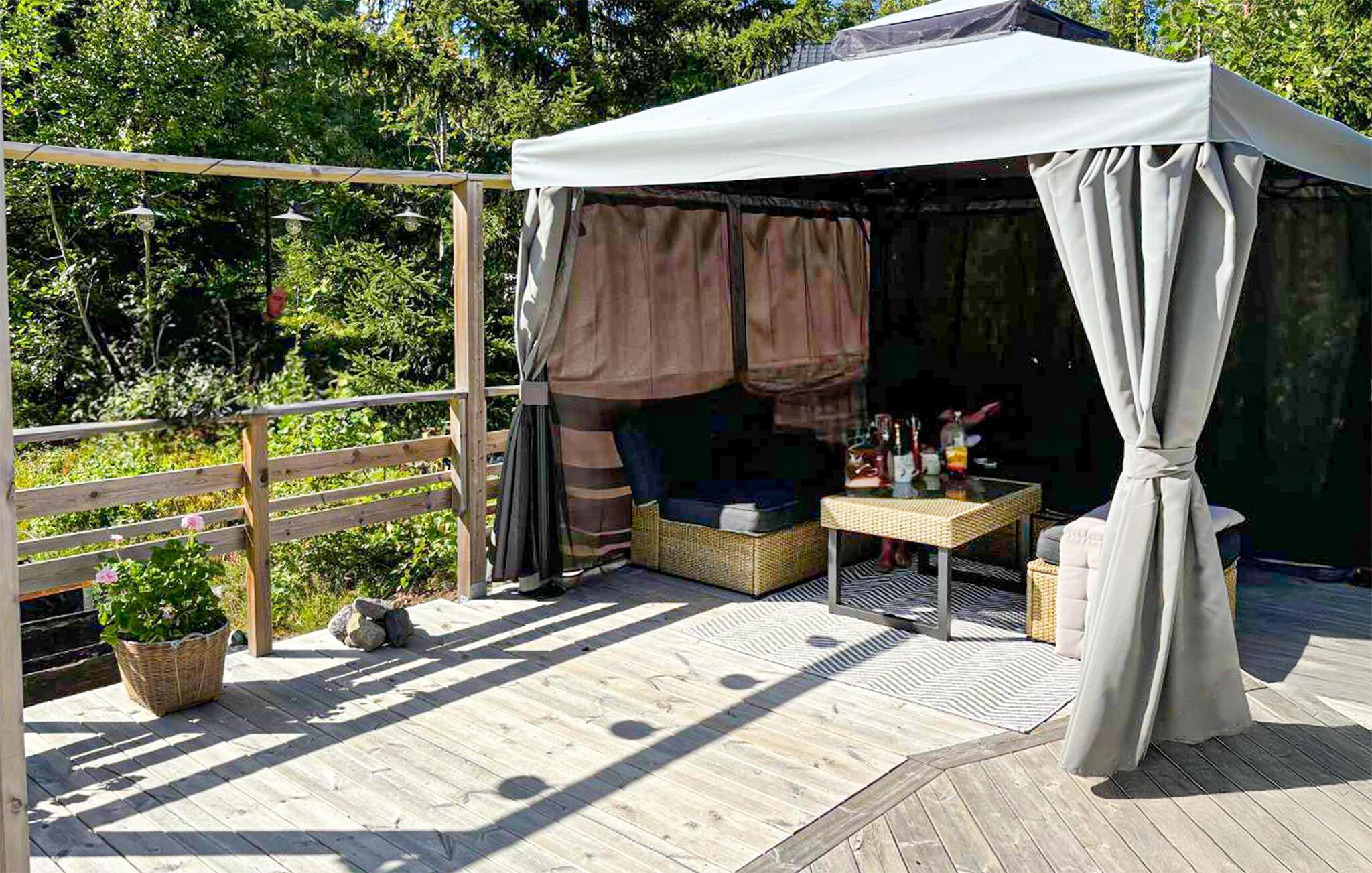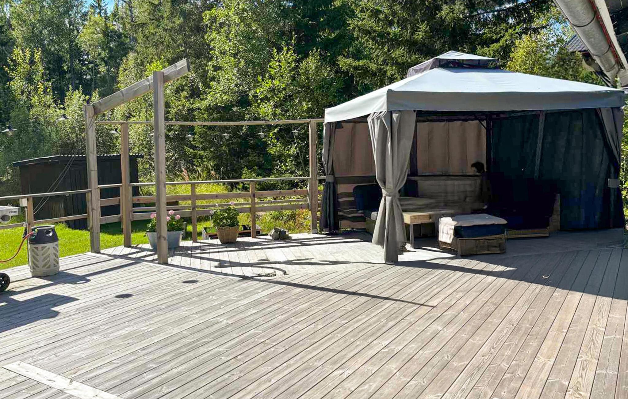 Verbringen Sie den Tag auf der großzügigen Holzterrasse mit Grill und Lounge-Sitzgruppe im überdachten Pavillon. Legen Sie die Füße hoch, lauschen Sie den Vögeln oder lassen Sie den Tag in geselliger Runde ausklingen. Der Garten ist umgeben von Wäldern, ideal für eine Pause vom Alltag.