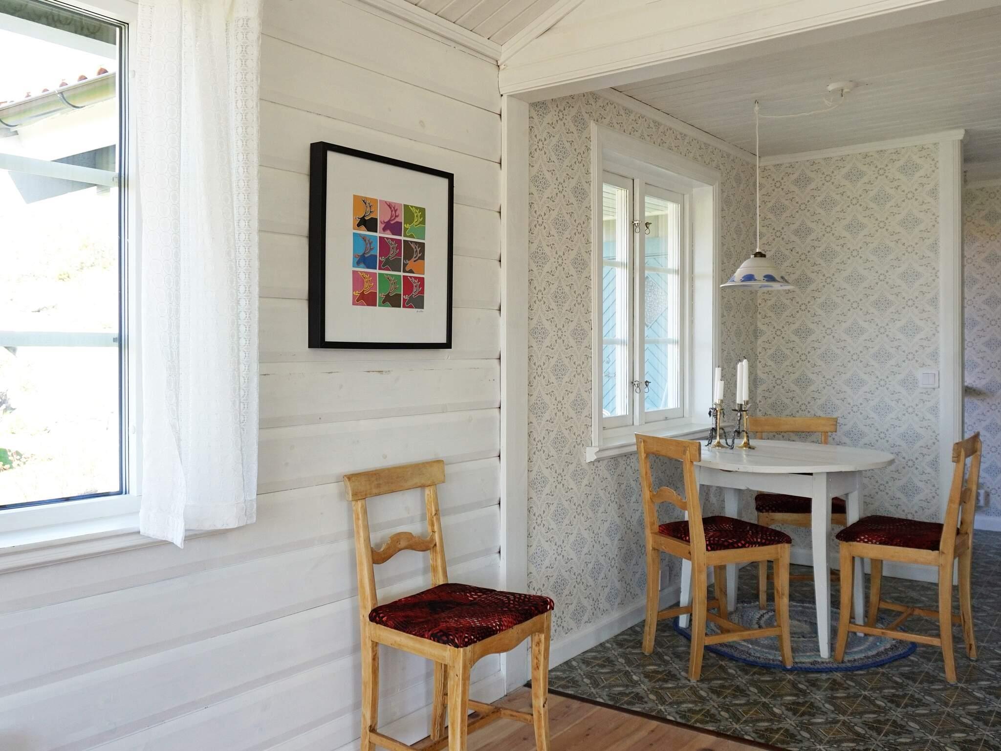 Über eine einladende Veranda mit Gartenmöbeln gelangt man zur Eingangstür des Ferienhauses. Im Inneren trifft man auf einen Flur, der weiter zur Küche mit Herd, Kühl-/Gefrierschrank, Mikrowelle, Kaffeemaschine und Geschirrspüler führt. Die kleine Küche ist offen in den Wohn- und Essbereich integriert, der herrliche Aussicht bietet! Für das Familienleben gibt es eine Sitz- und Leseecke sowie TV. Das Ferienhaus hat drei Schlafzimmer; eines mit Doppelbett und zwei mit Einzelbett. Im Haus auch WC und separates Duschbad, in dem sich auch eine Waschmaschine befindet. Glasfaseranschluss im Haus.