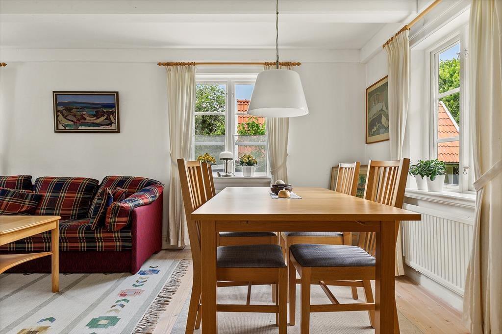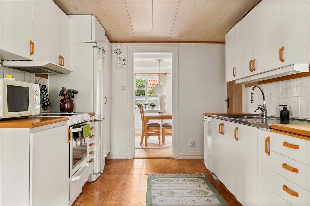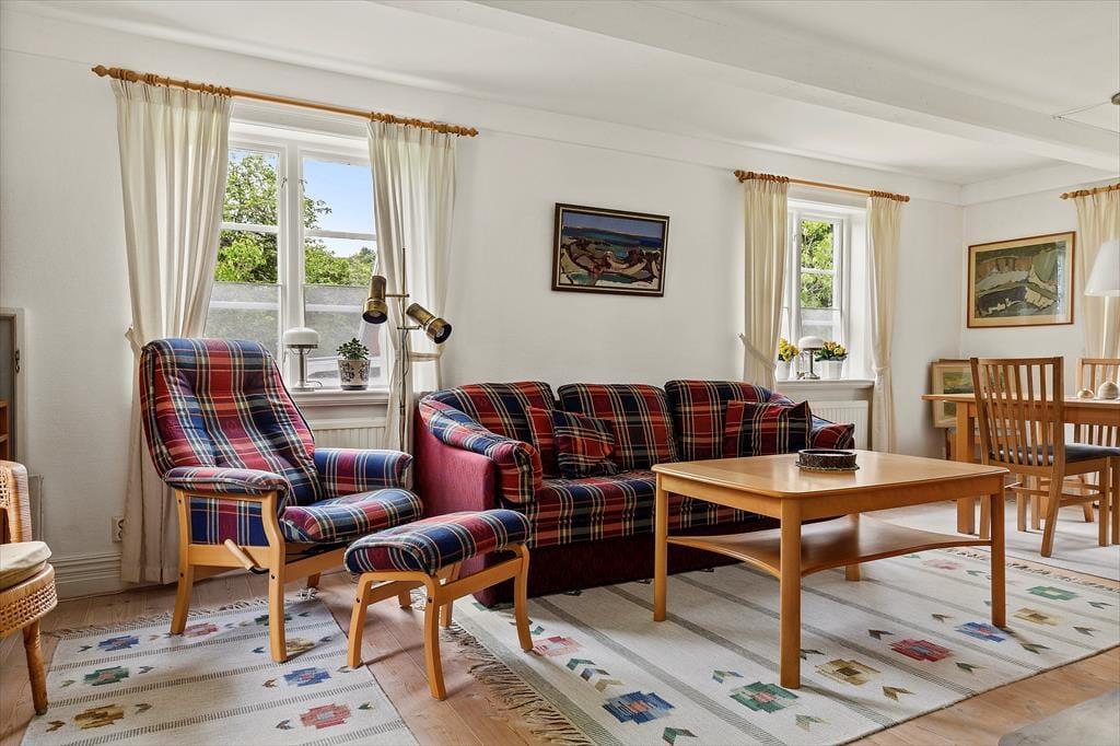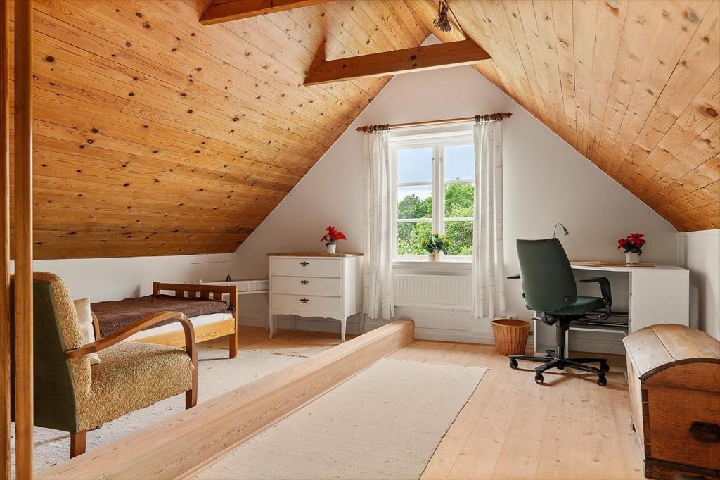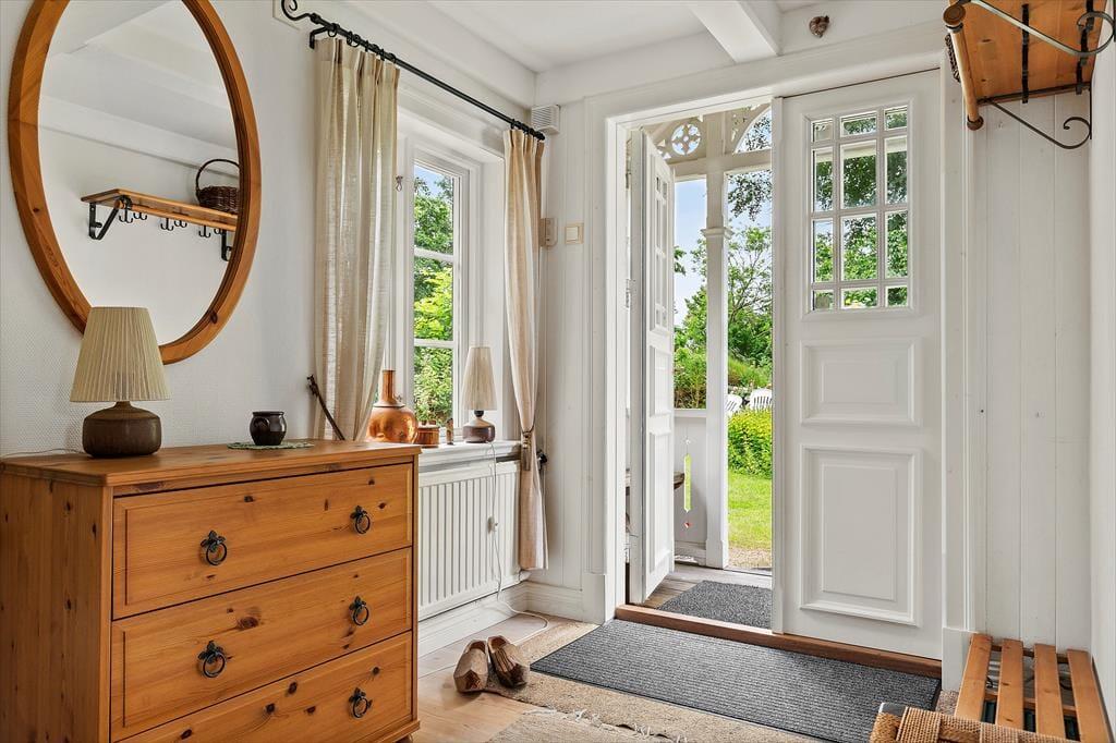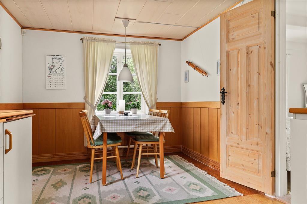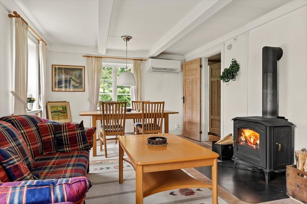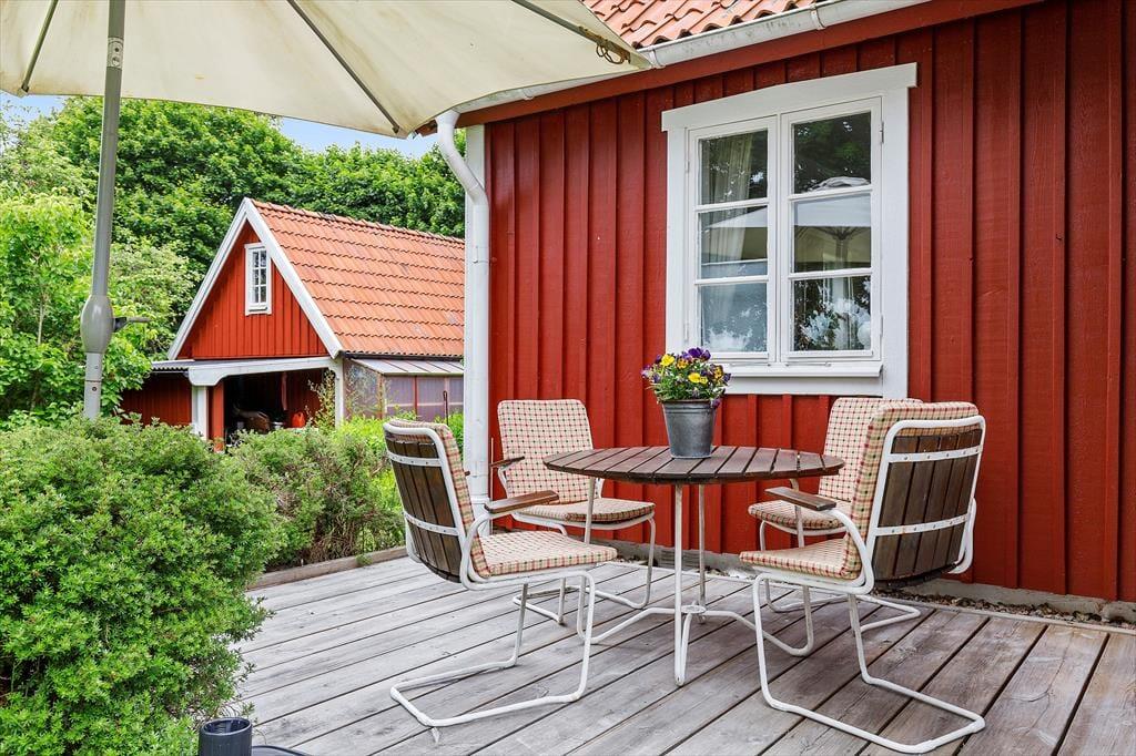 Das um 1927 herum erbaute rot-weiße, eineinhalbgeschossige Ferienhaus wurde von seinen schwedischen Eigentümern liebevoll renoviert und bietet mit etwa 95 m² Wohnfläche ein traumhaftes Ferienidyll für bis zu fünf Personen, wenn mind. ein Kind dabei ist. Über einen wunderschönen kleinen überdachten Vorbau, neben dem links eine kleine Außensitzecke platziert wurde, gelangt man in einen hellen Eingangsflur mit Garderobe und weiter in ein Wohnzimmer mit Kaminofen und Sitz- und Essecke. Weiterhin befinden sich im Erdgeschoß eine moderne Küche, ausgestattet mit Kühl- und Gefrierschrank, Elektroherd mit Backofen, Mikrowelle, Geschirrspüler und Kaffeemaschine sowie daneben liegend ein großes, helles Badezimmer mit Duschecke, WC, Handwaschbecken und Waschmaschine. Außerdem befindet sich im Erdgeschoß eines von zwei Schlafzimmer, möbliert mit einem Doppelbett.