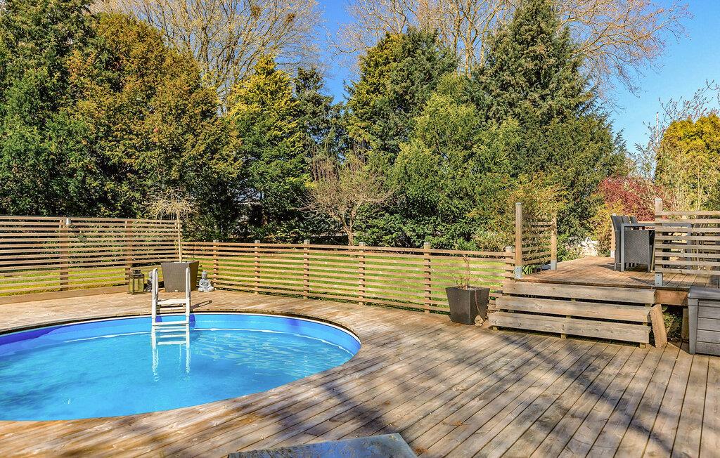 Auf dem üppigen Grundstück laden Sie eine weitläufige Terrasse und ein schöner Pool zum Verweilen ein. Vom Haus aus erreichen Sie das Meer bequem zu Fuß – mit Sand- und Kiesstränden sowie einem Grillplatz.