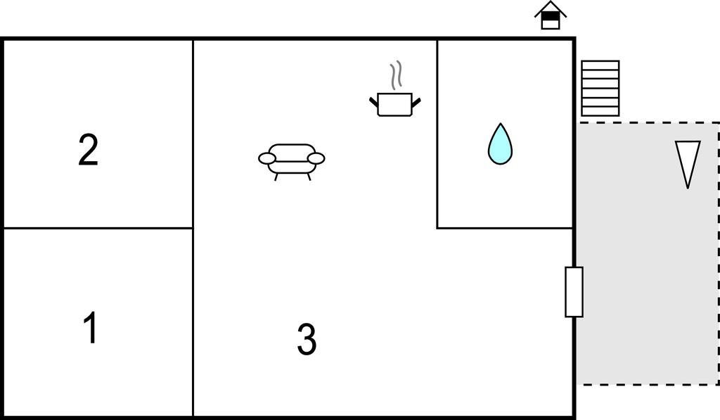 Die Unterkunft befindet sich im 2. Stock und Sie erreichen die Terrasse und den Eingang über eine Treppe. Die Unterkunft verfügt über ein größeres Wohnzimmer mit Küchenbereich, Essbereich und Sitzecke. Ein Schlafzimmer mit Einzelbett und ein Schlafzimmer mit Doppelbett sind ebenfalls vorhanden. Im Wohnzimmer gibt es ein Schlafsofa für 2 Personen und ein Badezimmer mit WC und Dusche.