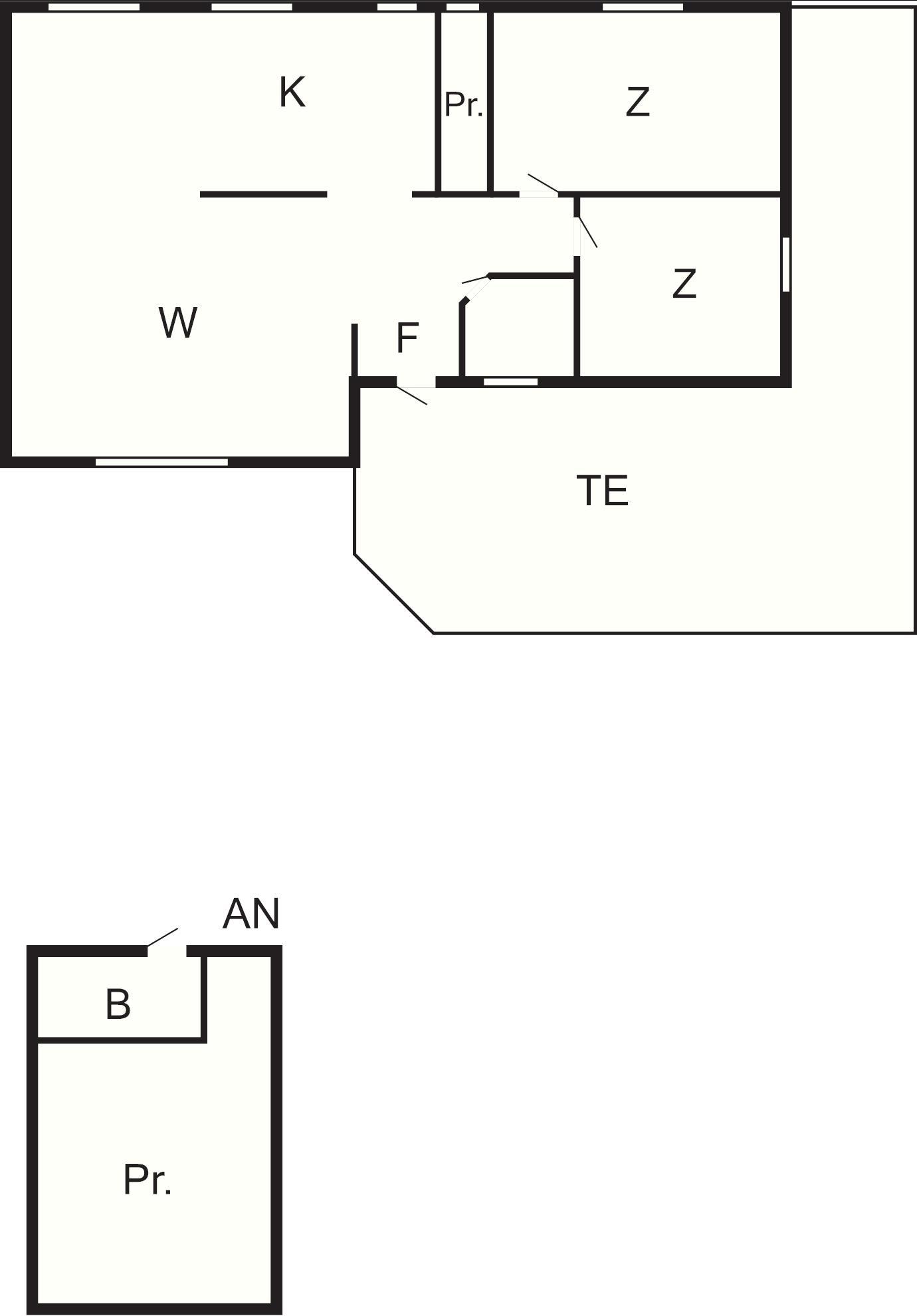 Das Ferienhaus hat einen offenen Grundriss zwischen Wohn- und Essbereich, der in die Küche übergeht. Im Wohnzimmer befinden sich ein Schlafsofa für zwei Personen und ein Fernseher. Für mehr Privatsphäre sorgt eine Faltwand. Das Ferienhaus verfügt über zwei komfortable Schlafzimmer, eines mit einem Einzelbett und eines mit einem Schlafsofa für zwei Personen. Vom Flur aus erreichen Sie das Badezimmer mit Dusche und Waschbecken. Das separate WC befindet sich in einem separaten Raum, den Sie über das Grundstück erreichen.