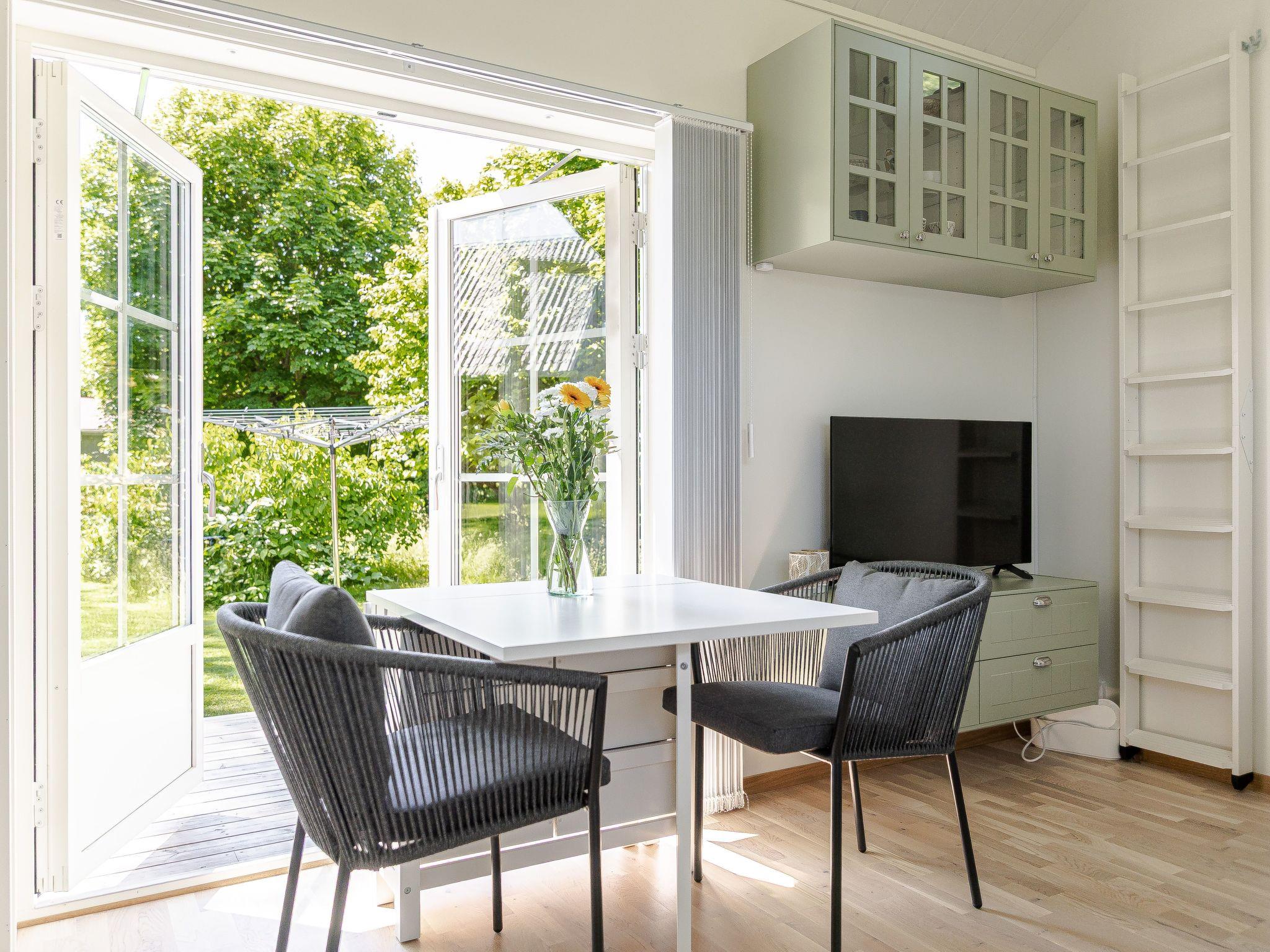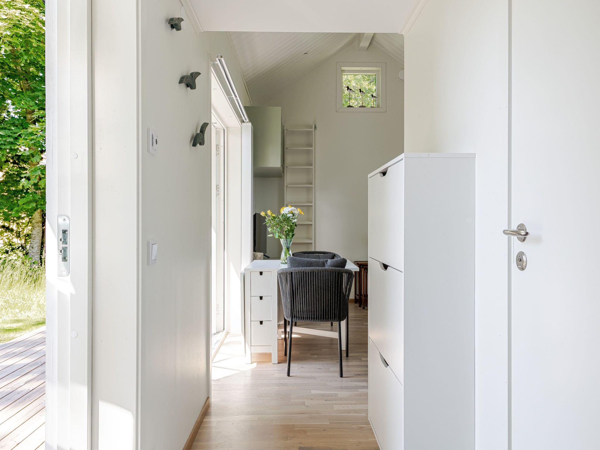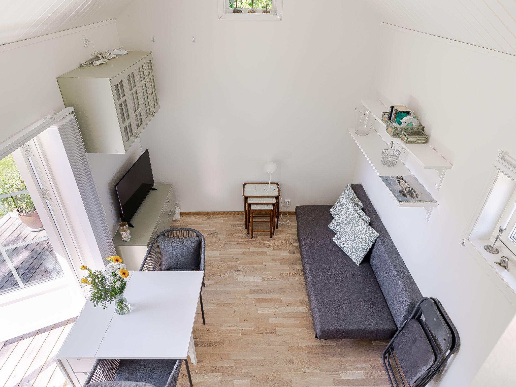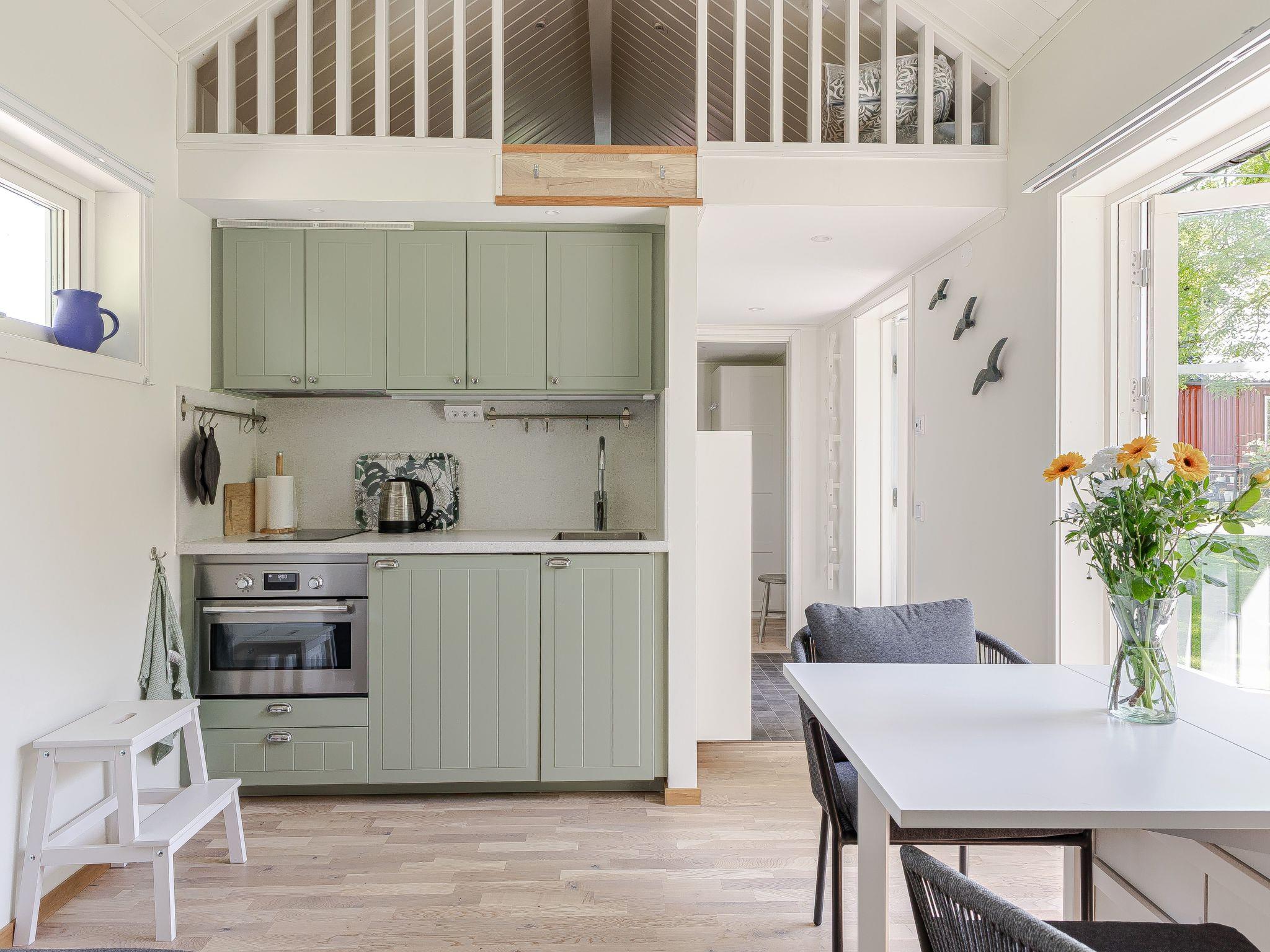 "Särdals Lycke", 2-Zimmer-Haus 30 m2. Schön eingerichtet: Wohn-/Schlafzimmer mit 1 Diwanbett und TV. Ausgang zum Garten, zur Terrasse. 1 Zimmer mit 1 Bett. Wohnküche (Backofen, 2 Induktionskochplatten, Toaster, Wasserkocher, Mikrowelle) mit Esstisch. Dusche/WC. Heizung. Obergeschoss: (steile Treppe) abgeschrägte, offene Galerie mit 2 Betten. Holzdielenboden. Zur Verfügung: Internet (WLAN). Bitte beachten: Nichtraucher-Haus.