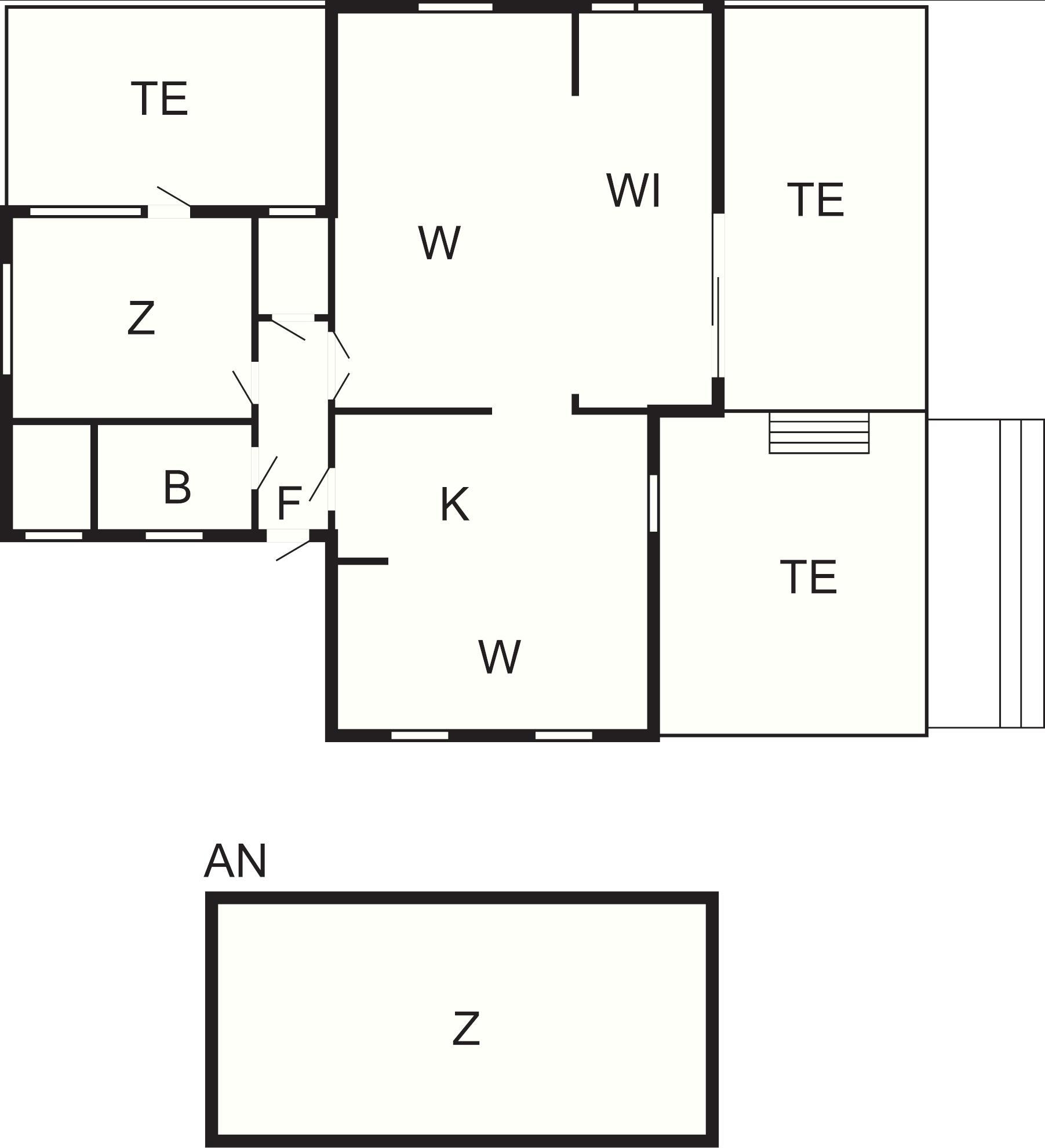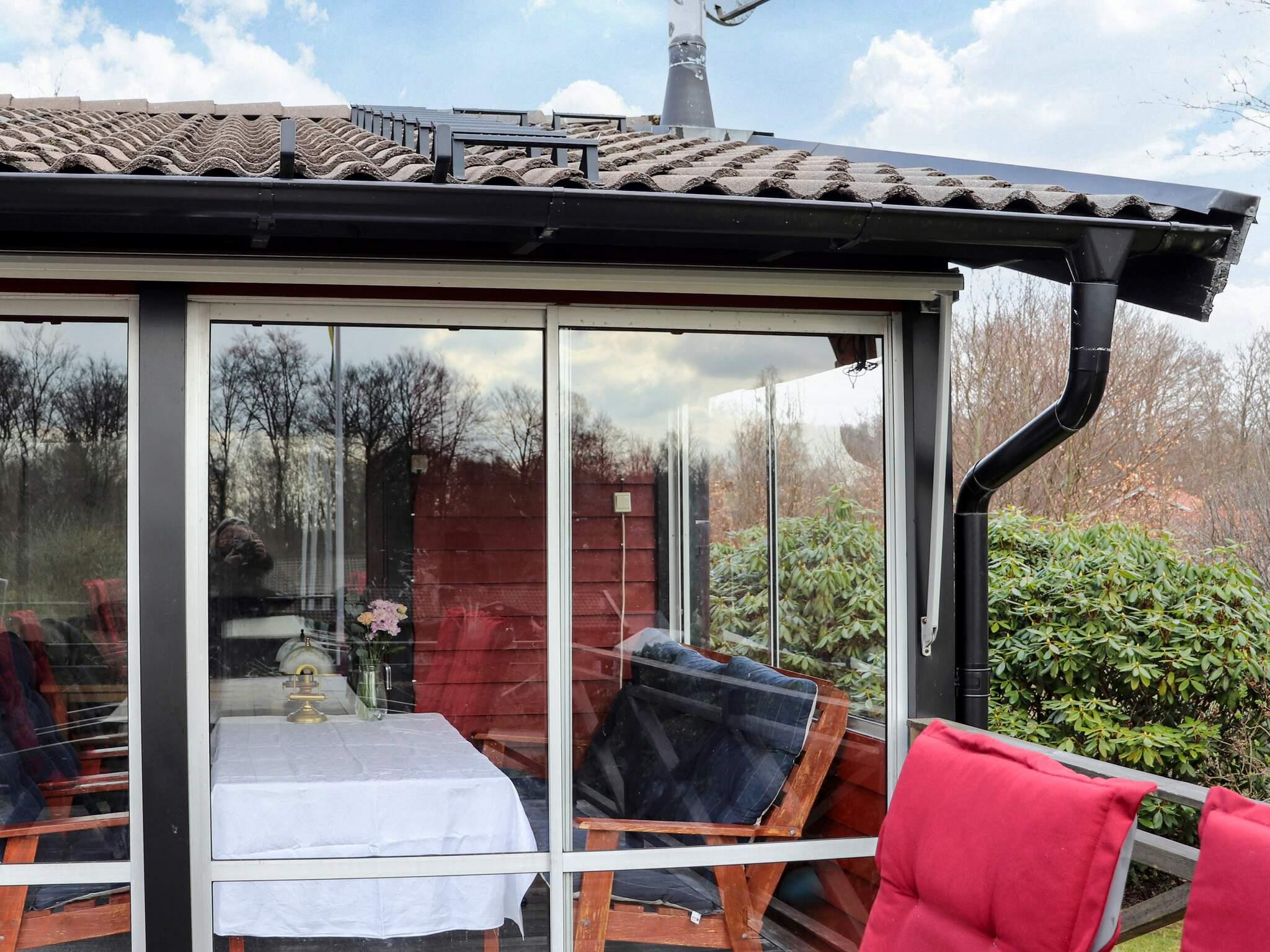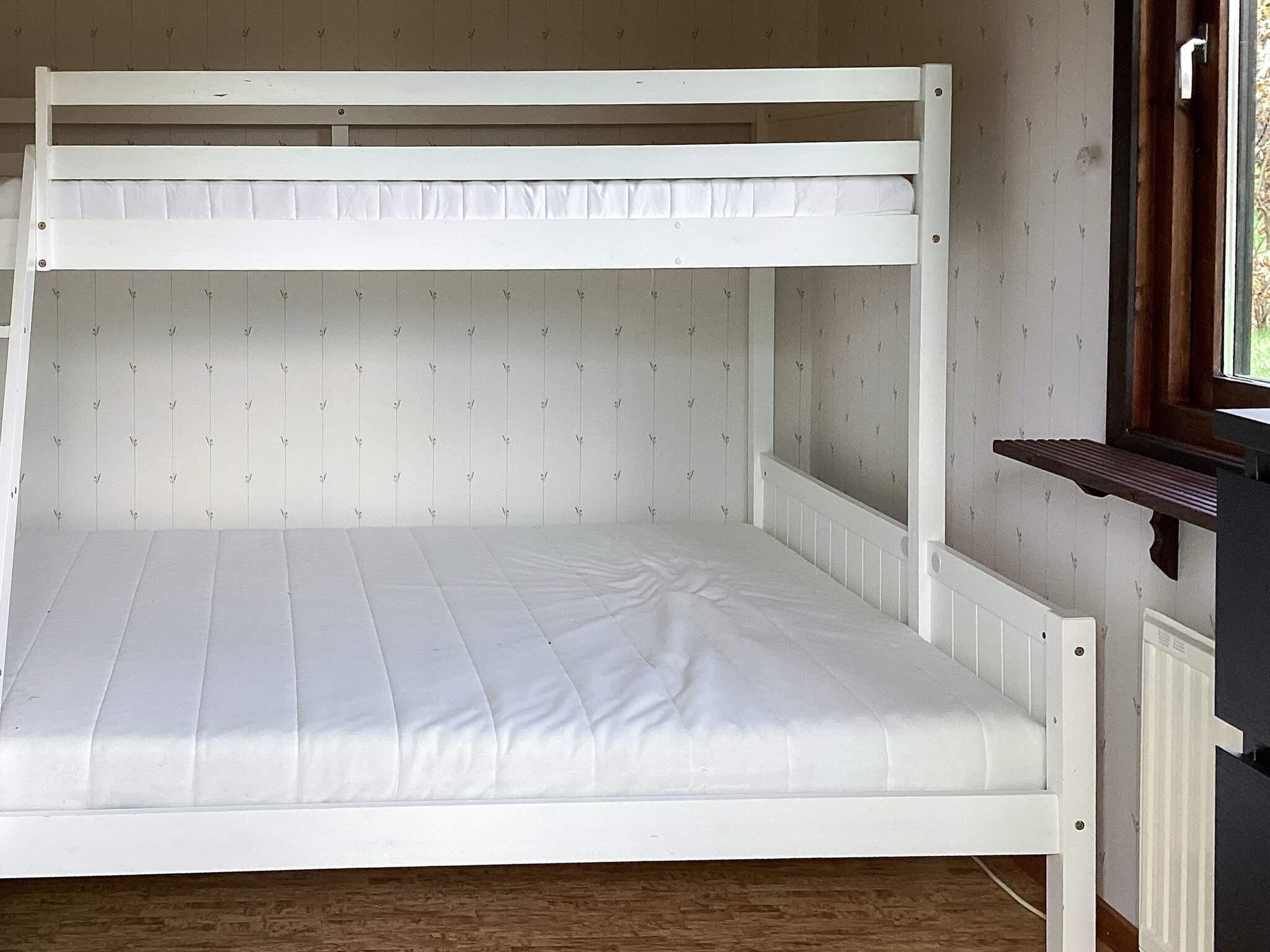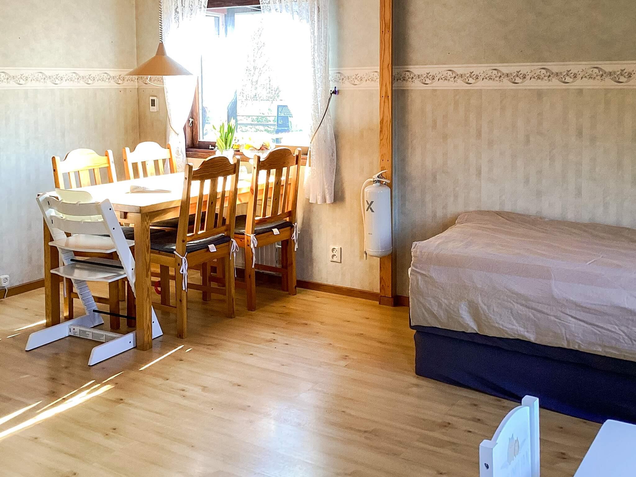 Der Eingang befindet sich an der Rückseite. Zunächst gelangen Sie zum geräumigen Badezimmer mit Dusche. Die offene Küche mit Essbereich grenzt an einen offenen Raum mit einem Ausziehbett für zwei Personen. Ein Kinderbett ist ebenfalls vorhanden. Das helle Wohnzimmer mit großen Glasfronten bietet Zugang zum Außenbereich. Hier finden Sie ein bequemes Sofa und einen Kaminofen für kühlere Tage. Das Schlafzimmer verfügt über ein großzügiges Doppelbett und Zugang zu einer Terrasse, die morgens Sonne und abends angenehme Kühle bietet. Der verglaste Außenbereich ist mit bequemen Sitzgelegenheiten ausgestattet. Vor dem Haus befindet sich eine sehr geräumige, zweistufige Terrasse mit schönen Gartenmöbeln und einem Holzkohlegrill. Ein Teil der Terrasse ist mit einer großen Markise überdacht. In einem Teil des angrenzenden Garagengebäudes findet man ein Gästezimmer mit einem geräumigen Familienbett.