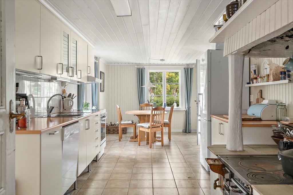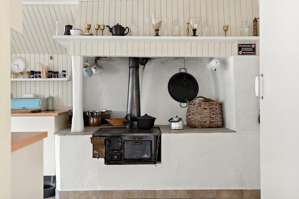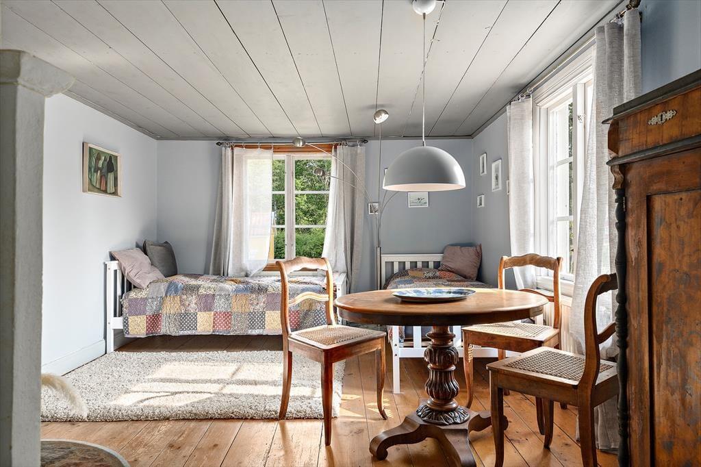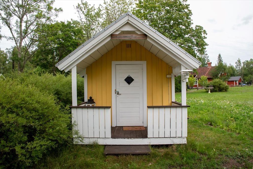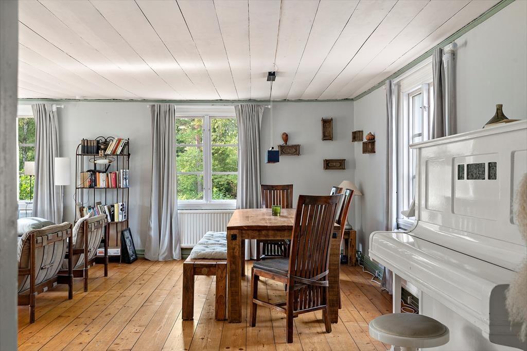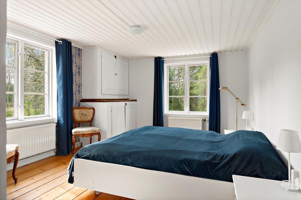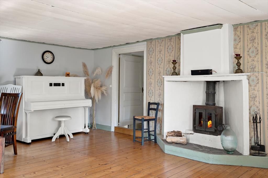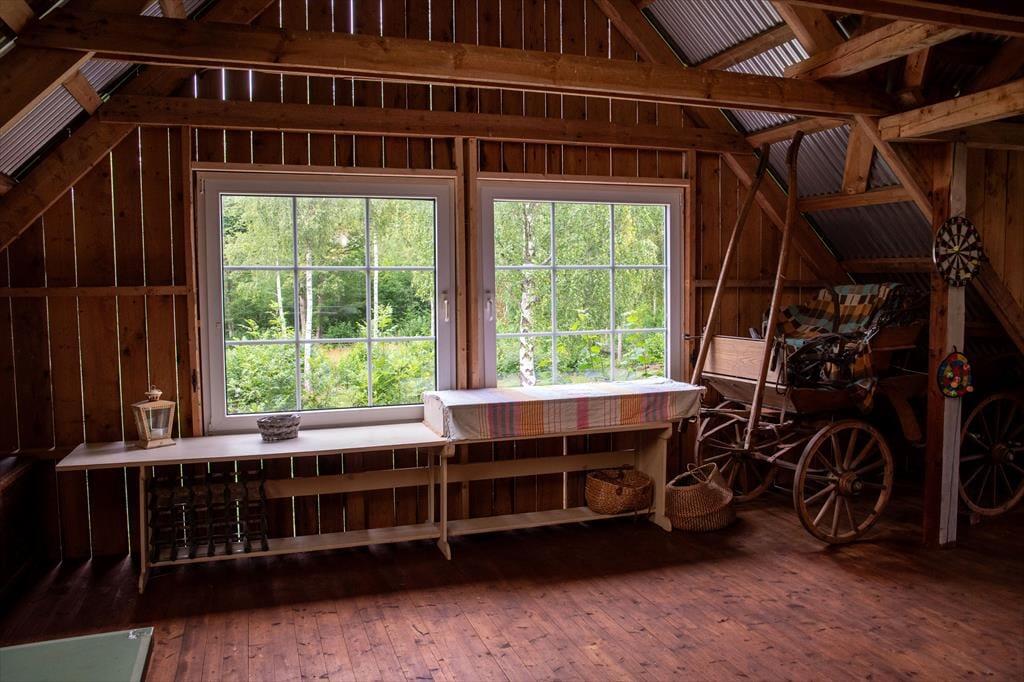 Ein geräumiges Ferienhaus auf einem sehr großen Grundstück, das im Winter warm und gemütlich ist. Der heutige Haupteingang des Ferienhauses befindet sich auf der Rückseite des Gebäudes. Hier wurde ein Windfang angebaut, in dem sich ein Gäste-WC, eine Waschmaschine, ein Duschraum sowie die Heizungsanlage und eine Garderobe befinden. Über den Windfang gelangt man in das typisch schwedische Wohngebäude, in dem alle Räume im Erdgeschoss miteinander verbunden sind. Als erstes betritt man die moderne Küche, in der noch ein alter, funktionstüchtiger Küchenofen für eine gemütliche Atmosphäre sorgt. Natürlich stehen auch ein moderner Ceranfeldherd, eine Spülmaschine, ein großer Kühlschrank mit Gefrierfach, eine Mikrowelle sowie ein Esstisch zur Verfügung. Von der Küche gelangt man in ein kleineres gemütliches Zwischenzimmer mit zwei Einzelbetten, die auch zusammengestellt werden können, eine zweite Tür führt in einen Hausflur, von dem man nach draußen, zur Treppe in den 1. Stock und in das große Wohnzimmer gelangt. Hier befinden sich eine gemütliche Sofagruppe, ein großer Esstisch, ein Kaminofen, Fernseher mit deutschen Programmen und nicht zuletzt ein Klavier. Vom Wohnzimmer gelangt man dann wieder direkt in die Küche, um den Rundgang in der unteren Etage abzuschließen.